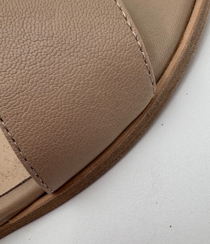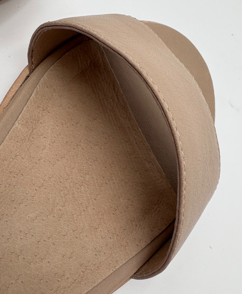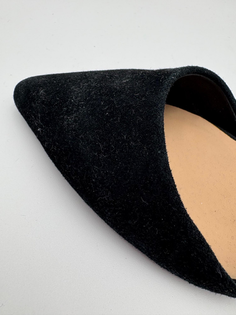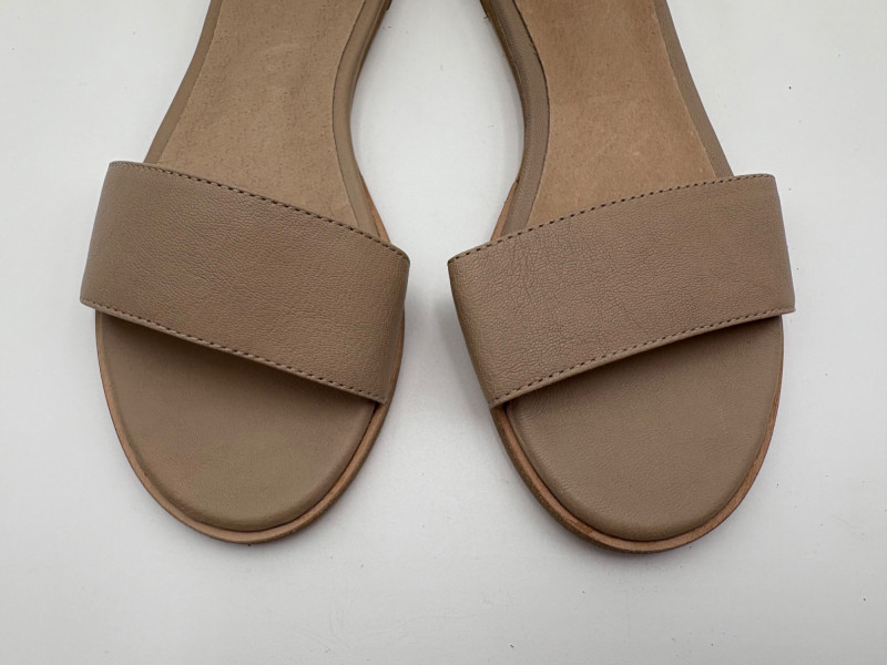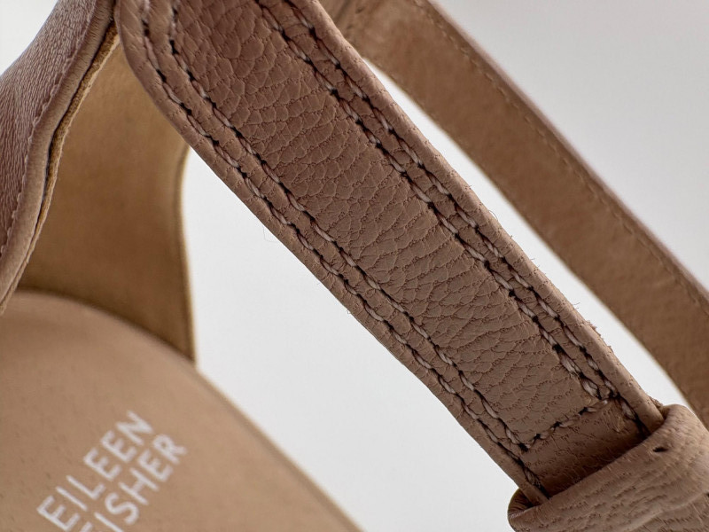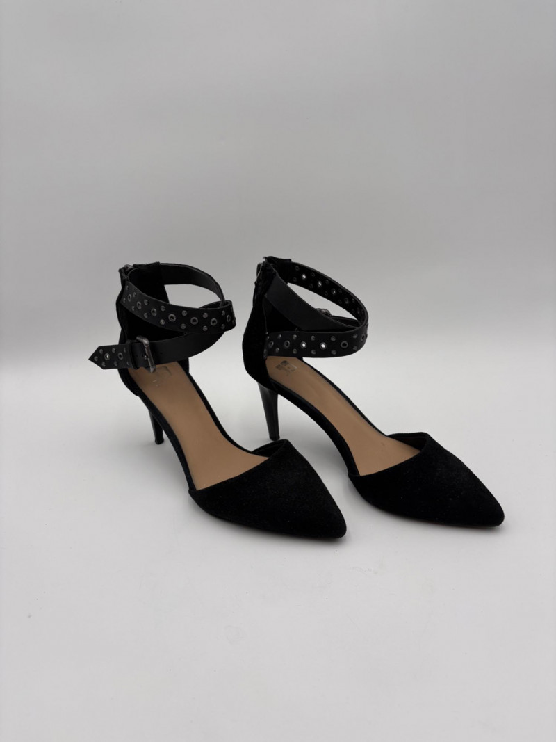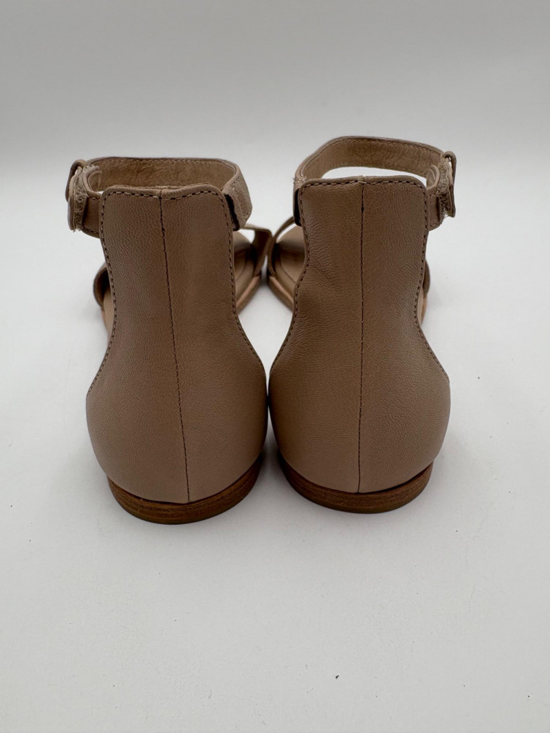 Joe's Jeans black suede spike heels with buckled crisscross ankle strap and back heel zip. Size 7 1/2.. Eileen Fisher beige flat sandals with Velcro ankle closure. Appear to be new. Size 7 1/2.