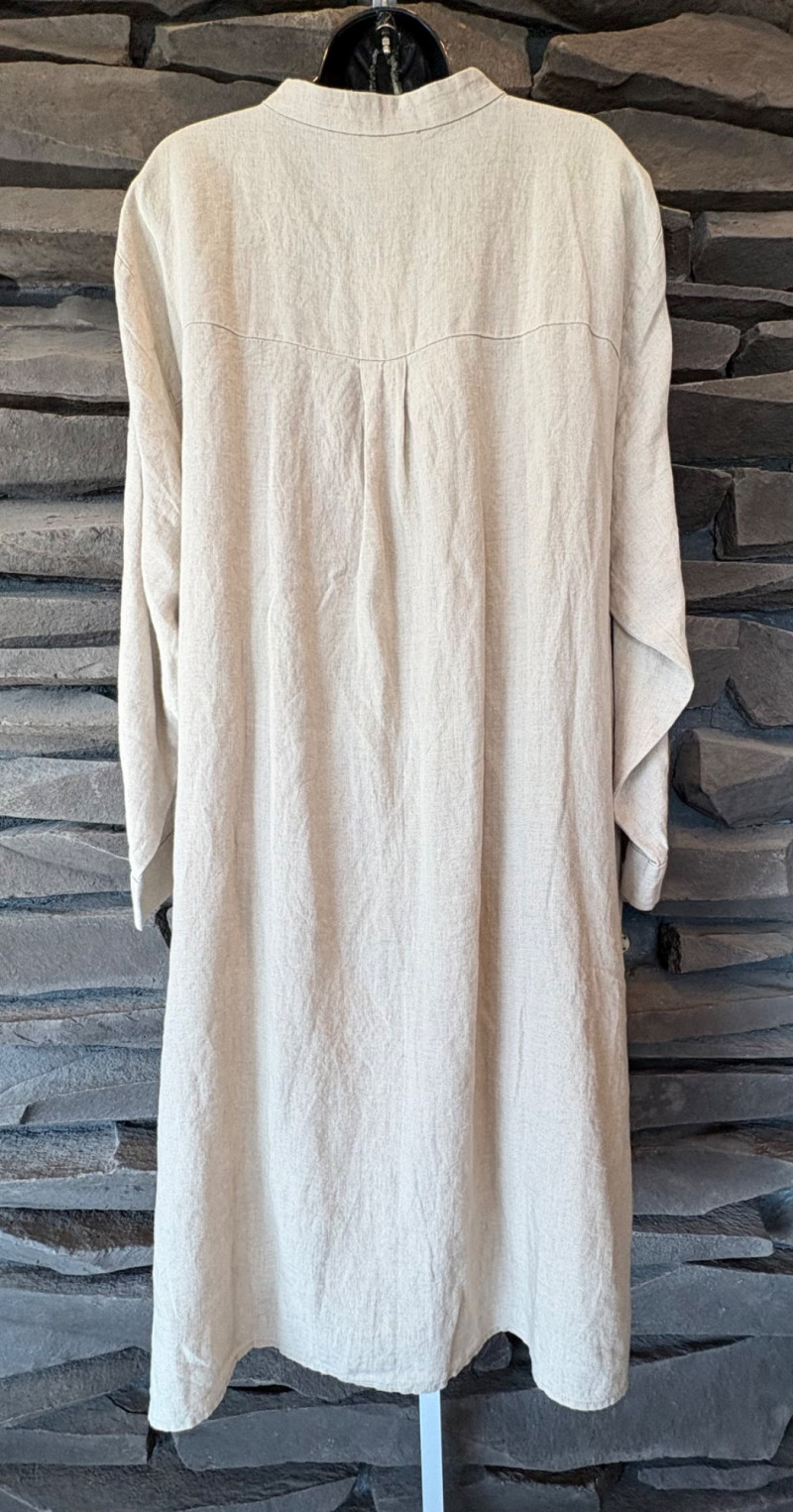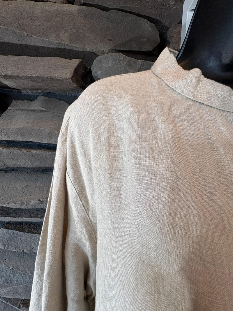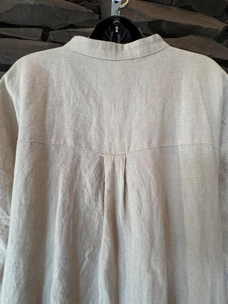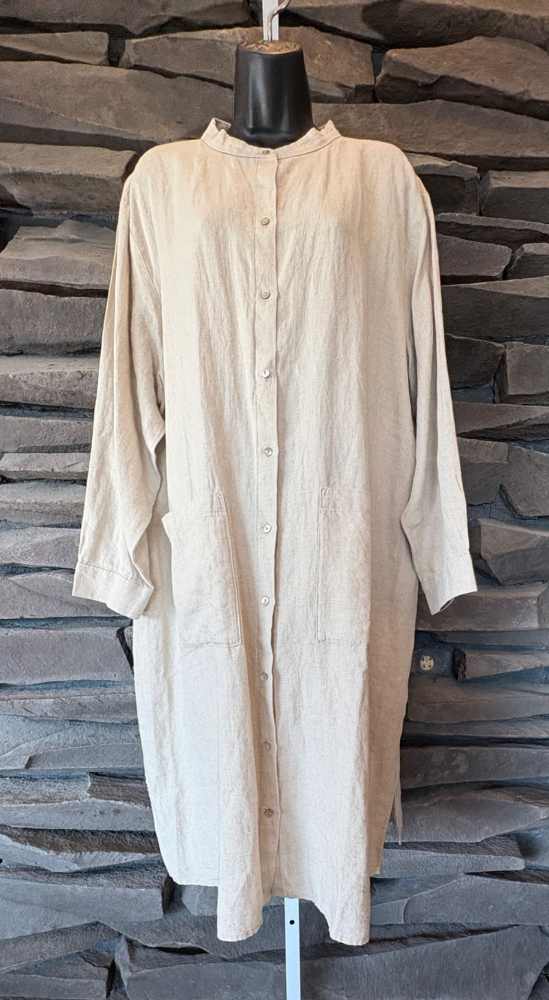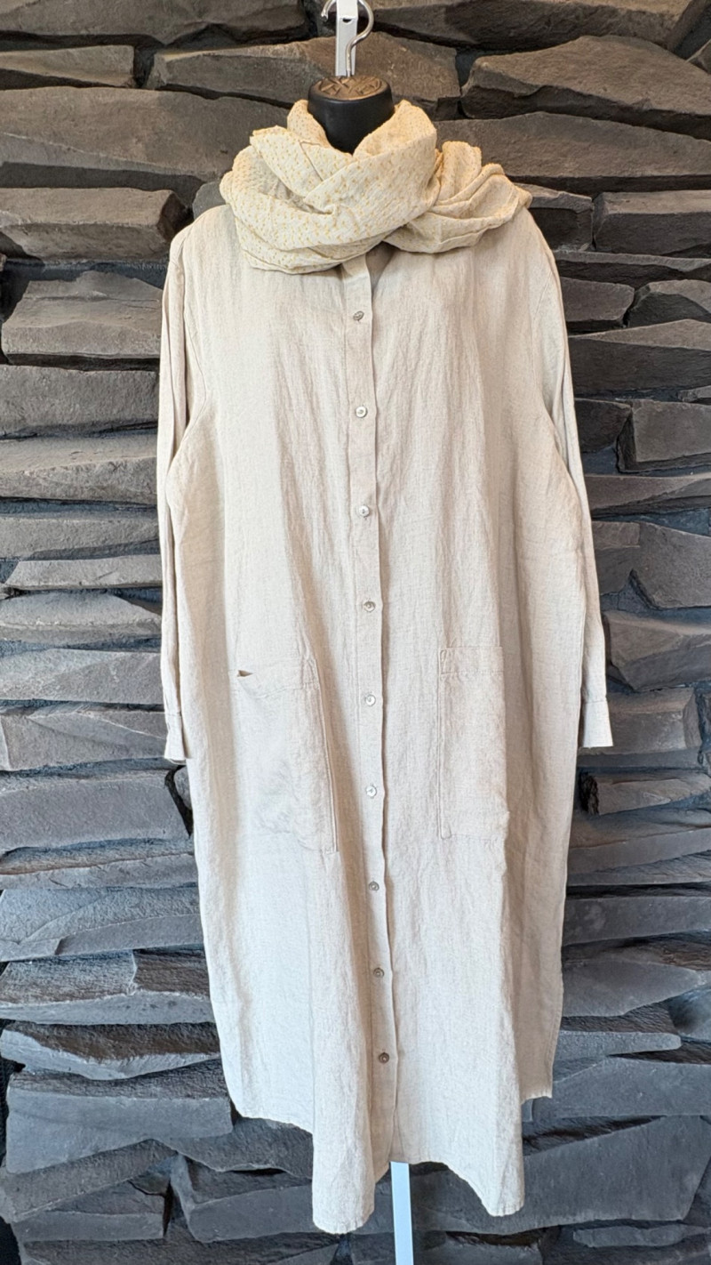 Gorgeous neutral beige linen duster that moves easily from summer to fall. Duster has long sleeves, banded collar, 10 button front closure, front patch pockets, pleated back yoke, 2 button pleated cuffs, and split hem. New with tag. 100% organic linen. Measures 28" pit to pit and 41" from back neckline to hem. Size tag says 2X. Paired with lightweight scarf of same background color with gold embroidered dots and fringe on short ends. Measures approximately 27" x 70". No maker or fabric tag, but feels like a natural fiber blend of cotton and perhaps silk.