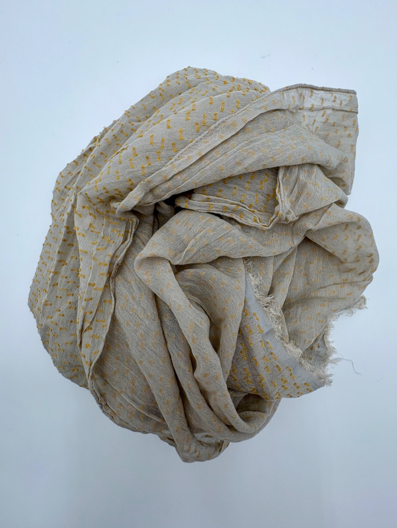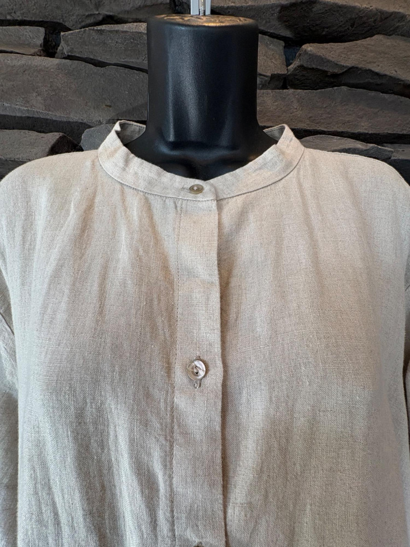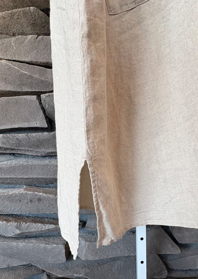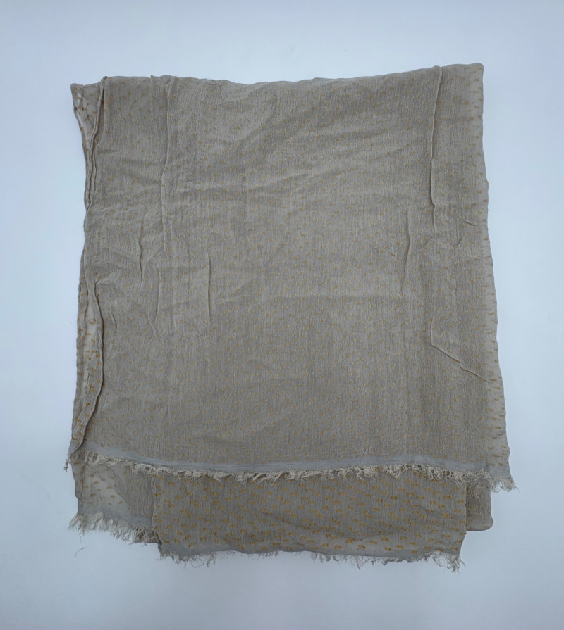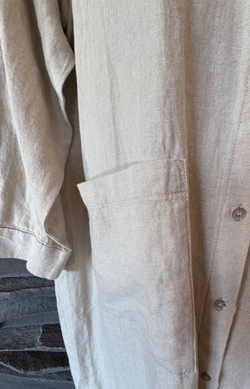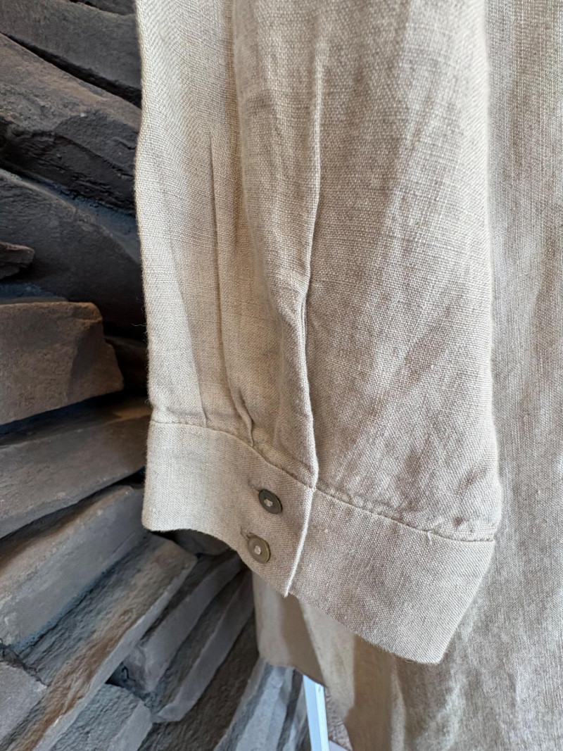 Gorgeous neutral beige linen duster that moves easily from summer to fall. Duster has long sleeves, banded collar, 10 button front closure, front patch pockets, pleated back yoke, 2 button pleated cuffs, and split hem. New with tag. 100% organic linen. Measures 28" pit to pit and 41" from back neckline to hem. Size tag says 2X. Paired with lightweight scarf of same background color with gold embroidered dots and fringe on short ends. Measures approximately 27" x 70". No maker or fabric tag, but feels like a natural fiber blend of cotton and perhaps silk.
