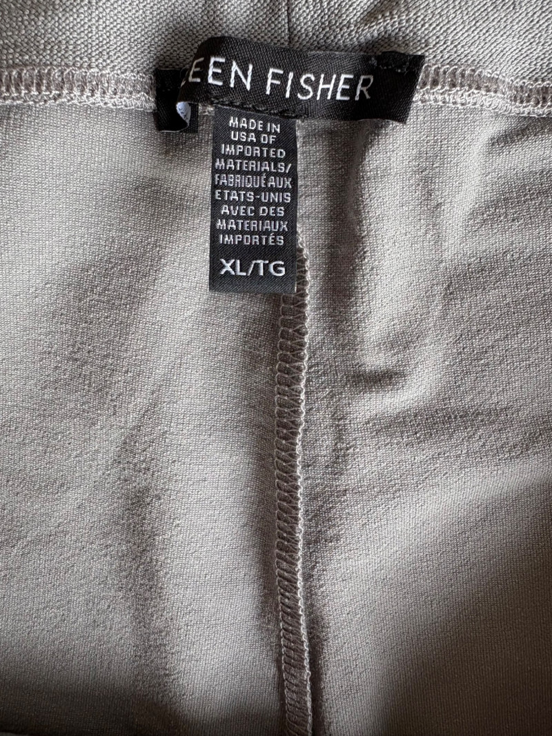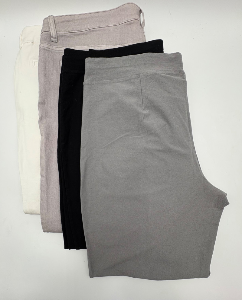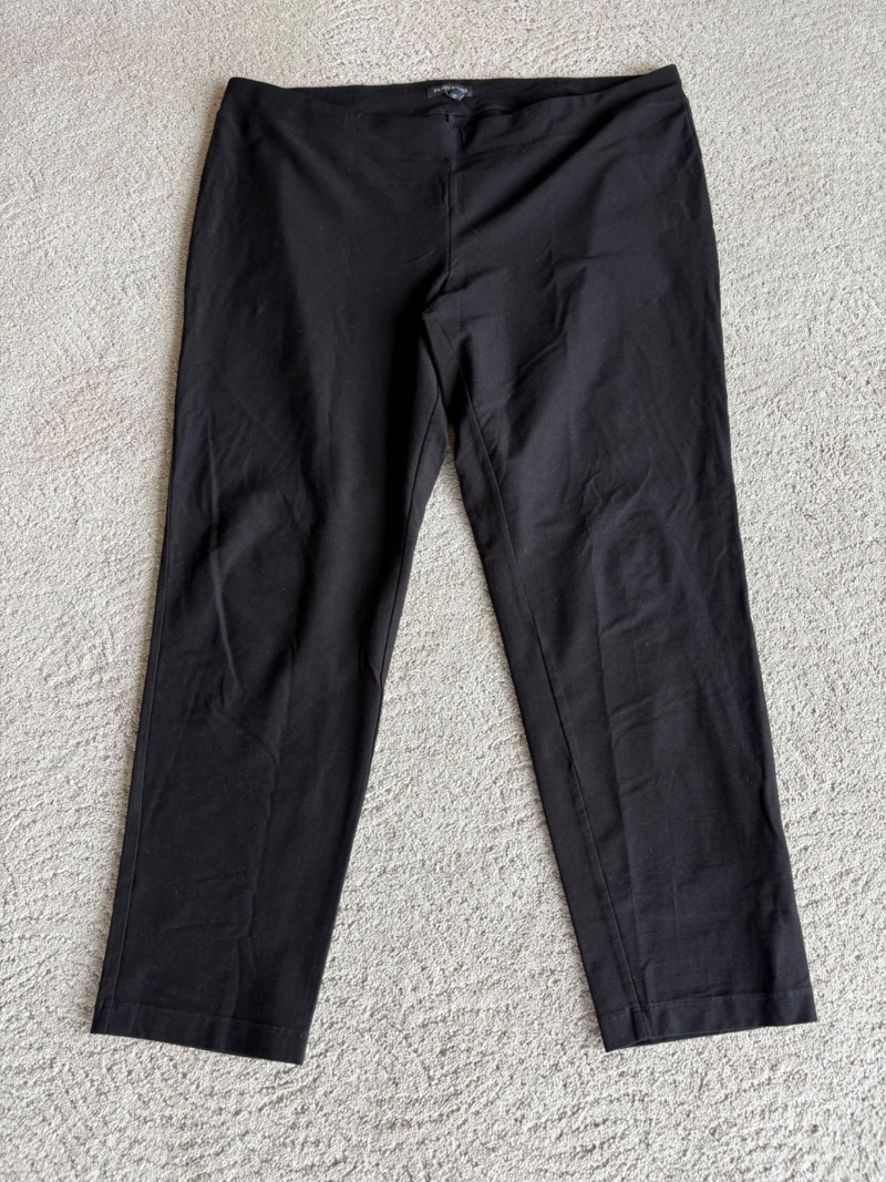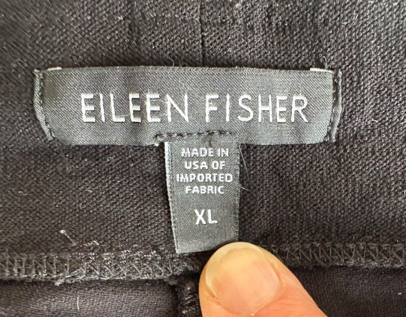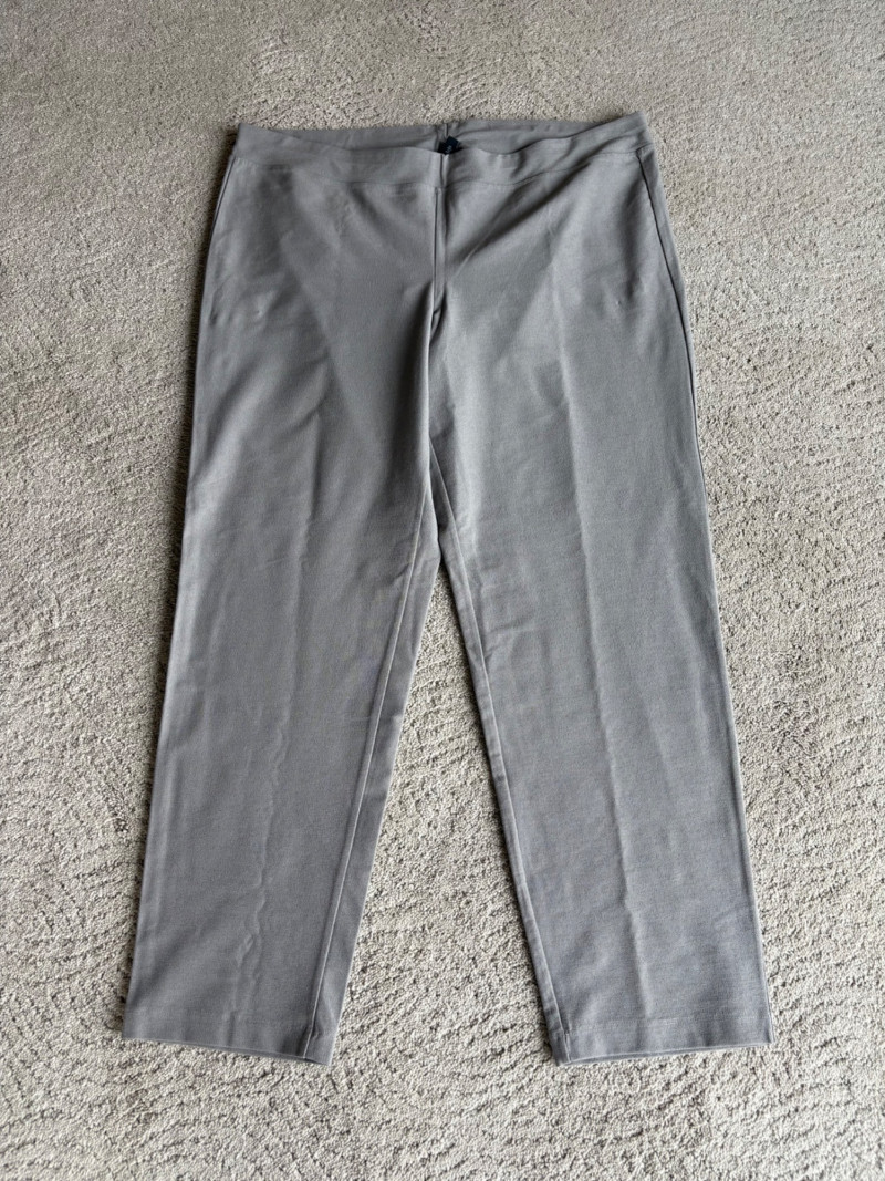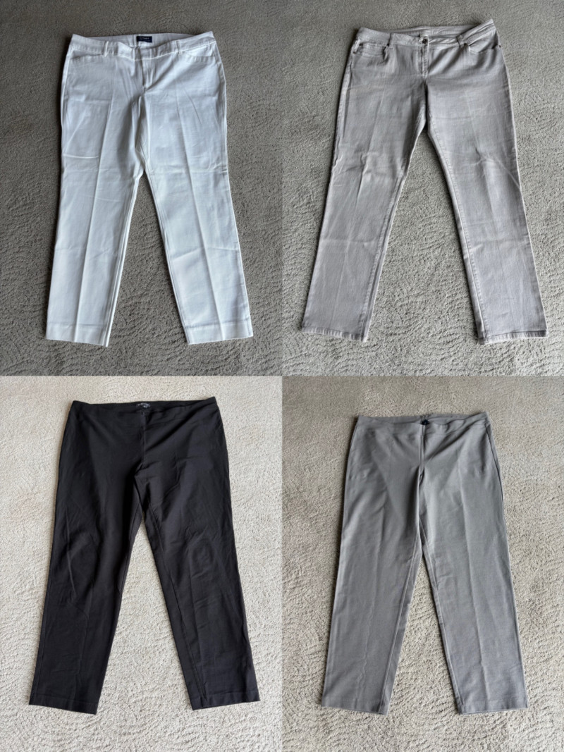 These pants stretch but have a flattering slim cut. Vintage Old Navy white twill jeans-style pants have welted back pockets, back darts, front angled pockets, and fly front. Measure 20" side to side at waist. Size tag says 18. Poetry light grey pants have 5-pocket jeans styling. Measure 20" side to side at waist. Size tag says 14. (Yet another reason to go by measurements!) Eileen Fisher black viscose blend pants have flat elasticated waistband, back darts for better fit, and a slim leg. Measure 19.5" side to side at waist. Size tag says XL. Note fabric tag is missing, but same blend as next pair. Eileen Fisher grey viscose blend pants have flat elasticated waistband, back darts for better fit, and a slim leg. Measure 19.5" side to side at waist. Size tag says XL.