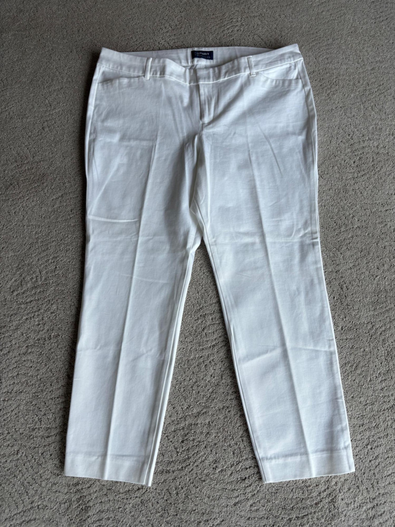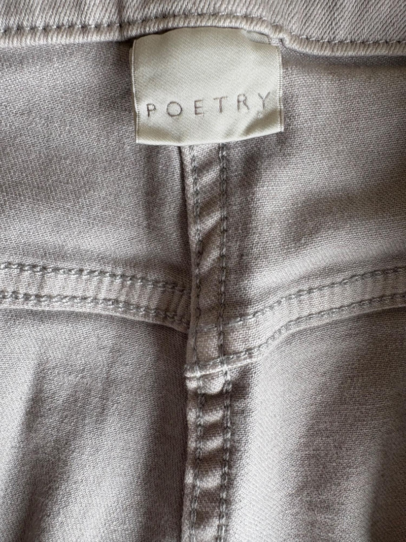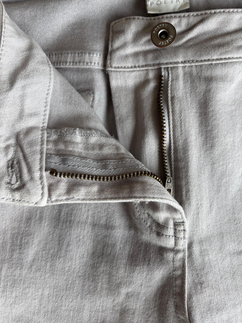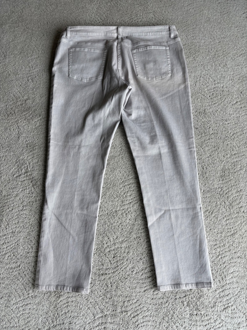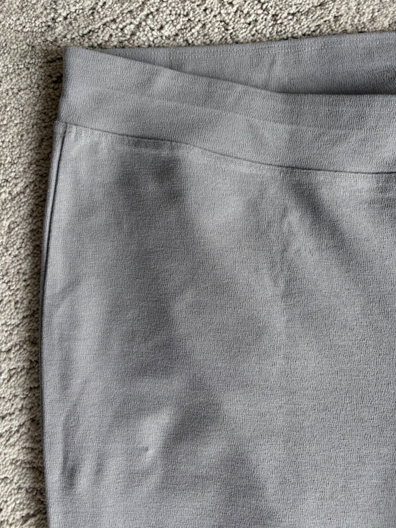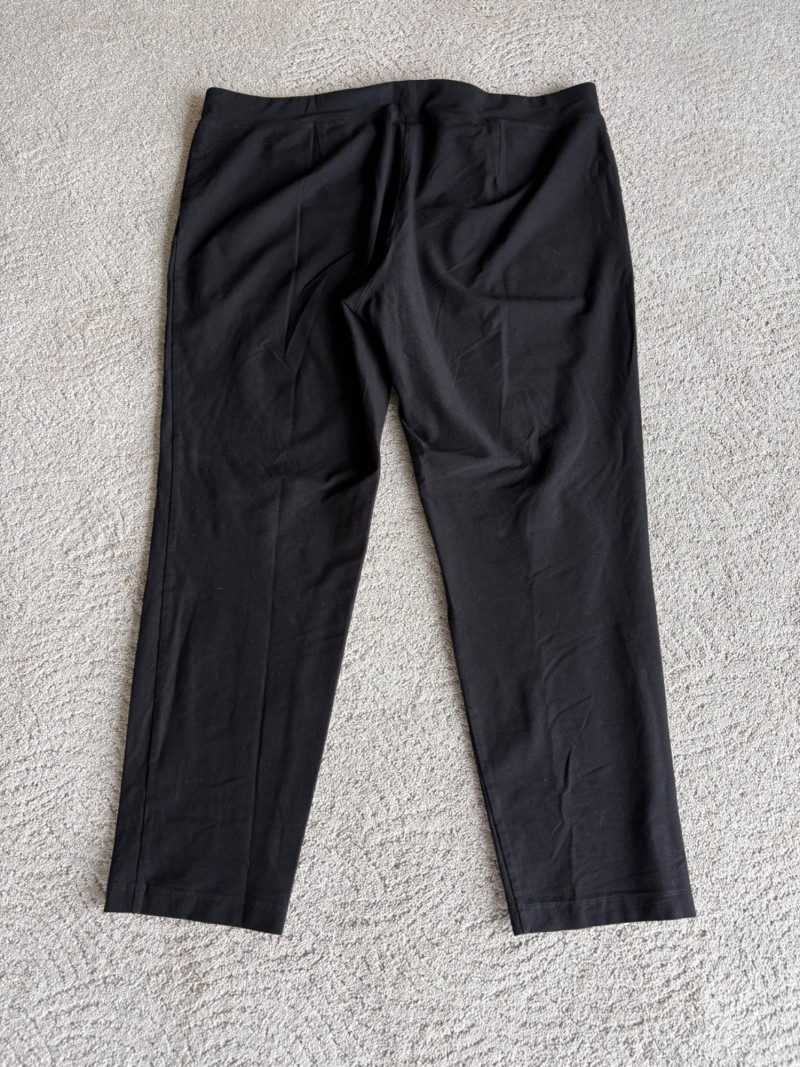 These pants stretch but have a flattering slim cut. Vintage Old Navy white twill jeans-style pants have welted back pockets, back darts, front angled pockets, and fly front. Measure 20" side to side at waist. Size tag says 18. Poetry light grey pants have 5-pocket jeans styling. Measure 20" side to side at waist. Size tag says 14. (Yet another reason to go by measurements!) Eileen Fisher black viscose blend pants have flat elasticated waistband, back darts for better fit, and a slim leg. Measure 19.5" side to side at waist. Size tag says XL. Note fabric tag is missing, but same blend as next pair. Eileen Fisher grey viscose blend pants have flat elasticated waistband, back darts for better fit, and a slim leg. Measure 19.5" side to side at waist. Size tag says XL.