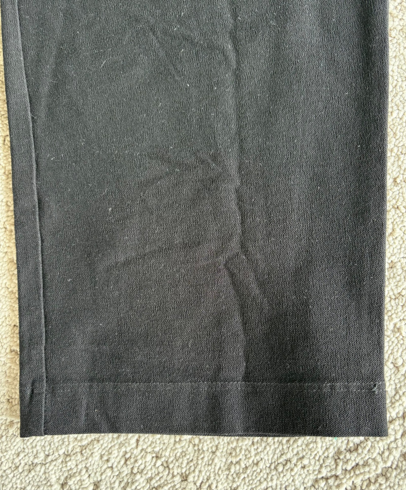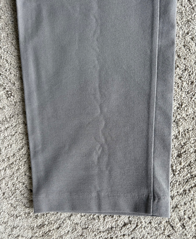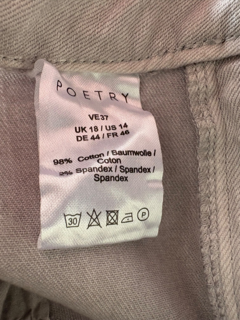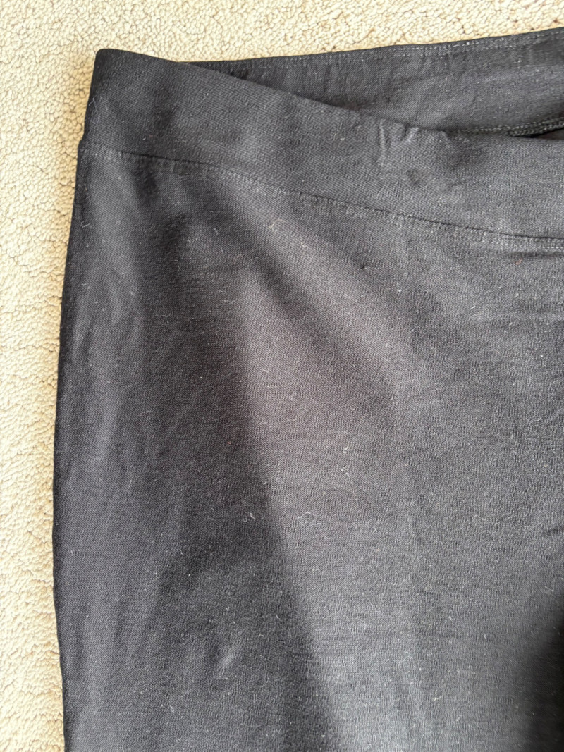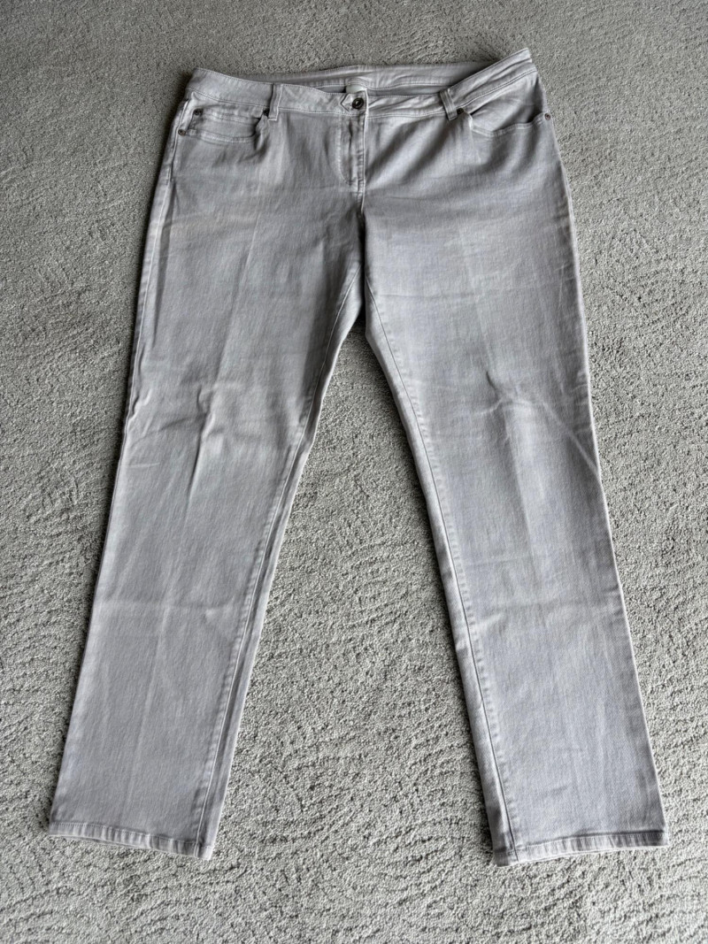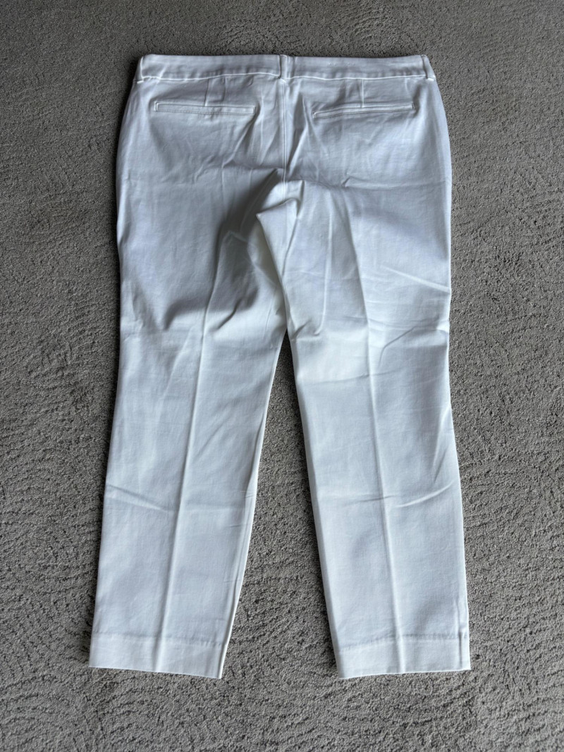 These pants stretch but have a flattering slim cut. Vintage Old Navy white twill jeans-style pants have welted back pockets, back darts, front angled pockets, and fly front. Measure 20" side to side at waist. Size tag says 18. Poetry light grey pants have 5-pocket jeans styling. Measure 20" side to side at waist. Size tag says 14. (Yet another reason to go by measurements!) Eileen Fisher black viscose blend pants have flat elasticated waistband, back darts for better fit, and a slim leg. Measure 19.5" side to side at waist. Size tag says XL. Note fabric tag is missing, but same blend as next pair. Eileen Fisher grey viscose blend pants have flat elasticated waistband, back darts for better fit, and a slim leg. Measure 19.5" side to side at waist. Size tag says XL.