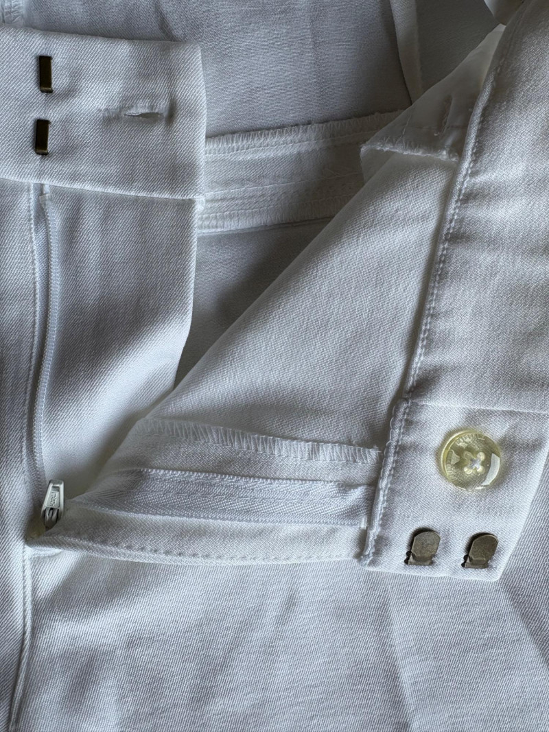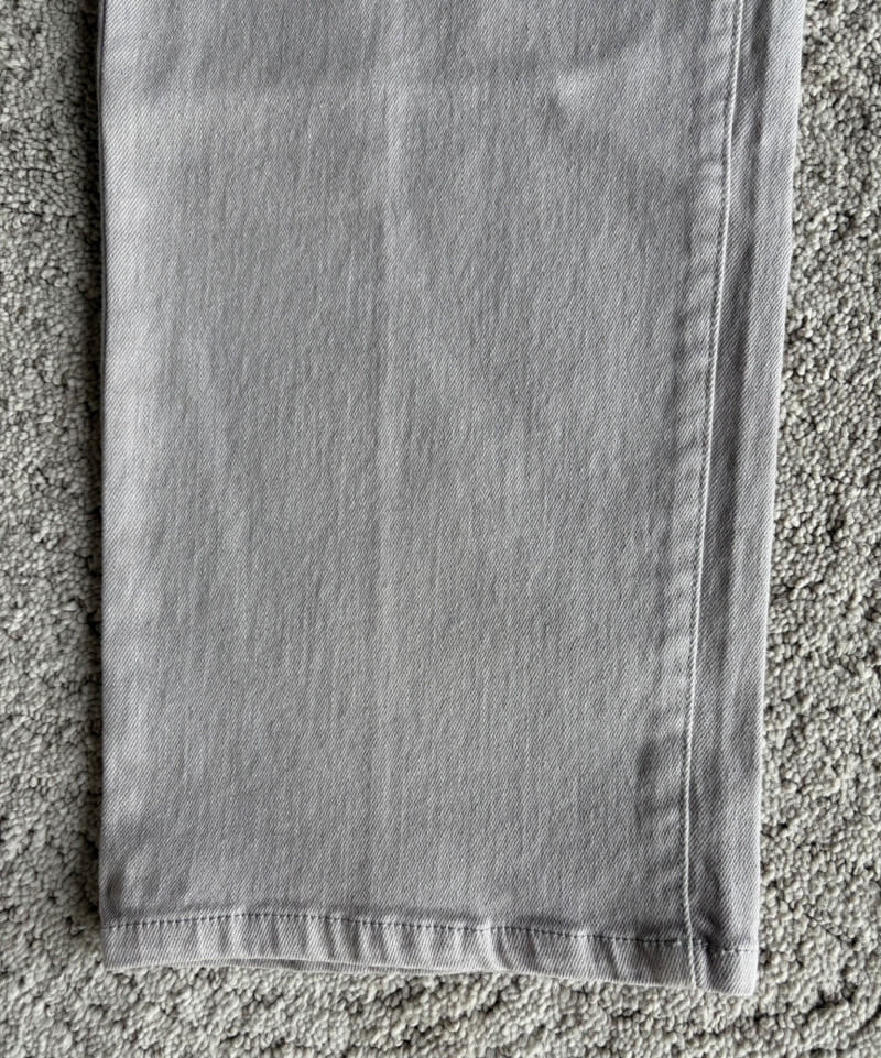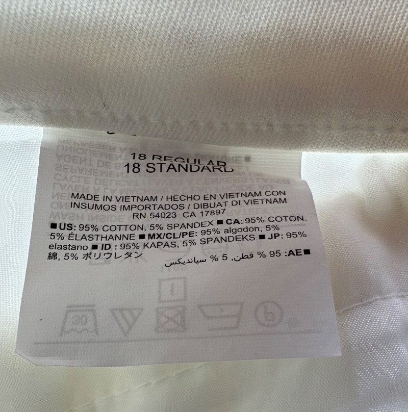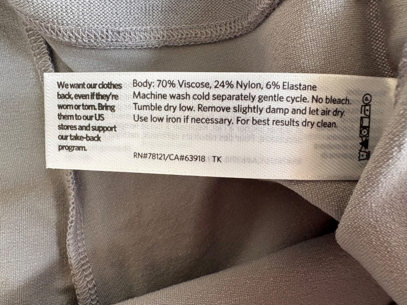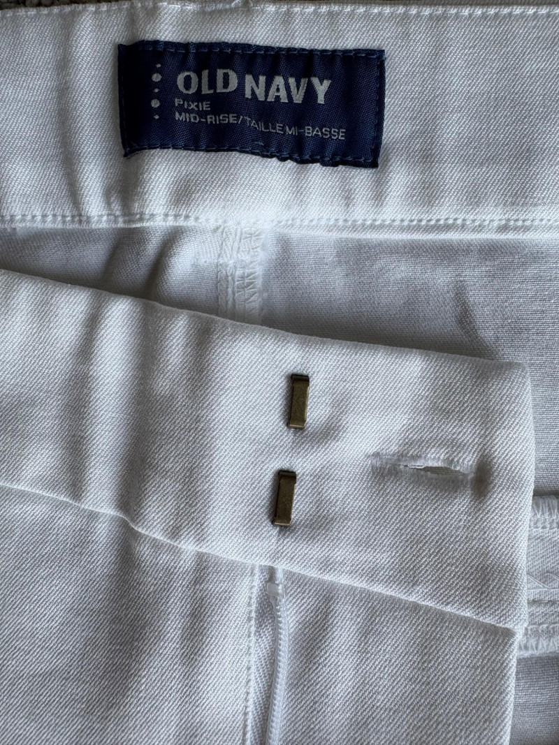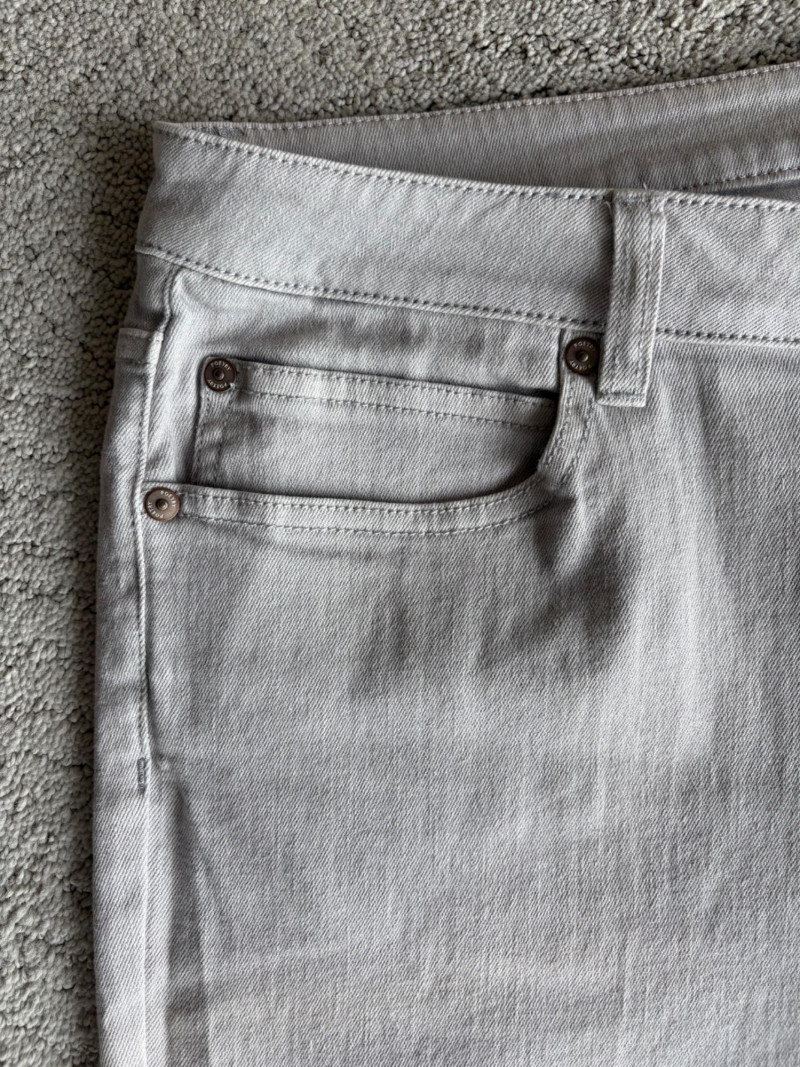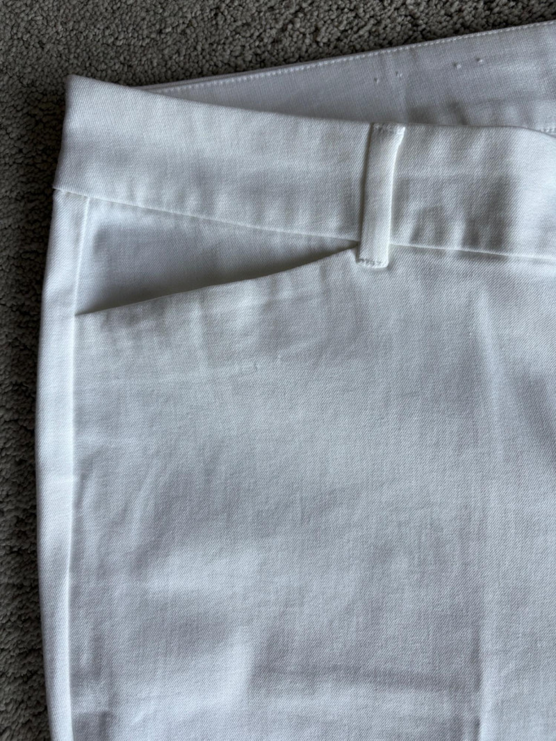 These pants stretch but have a flattering slim cut. Vintage Old Navy white twill jeans-style pants have welted back pockets, back darts, front angled pockets, and fly front. Measure 20" side to side at waist. Size tag says 18. Poetry light grey pants have 5-pocket jeans styling. Measure 20" side to side at waist. Size tag says 14. (Yet another reason to go by measurements!) Eileen Fisher black viscose blend pants have flat elasticated waistband, back darts for better fit, and a slim leg. Measure 19.5" side to side at waist. Size tag says XL. Note fabric tag is missing, but same blend as next pair. Eileen Fisher grey viscose blend pants have flat elasticated waistband, back darts for better fit, and a slim leg. Measure 19.5" side to side at waist. Size tag says XL.