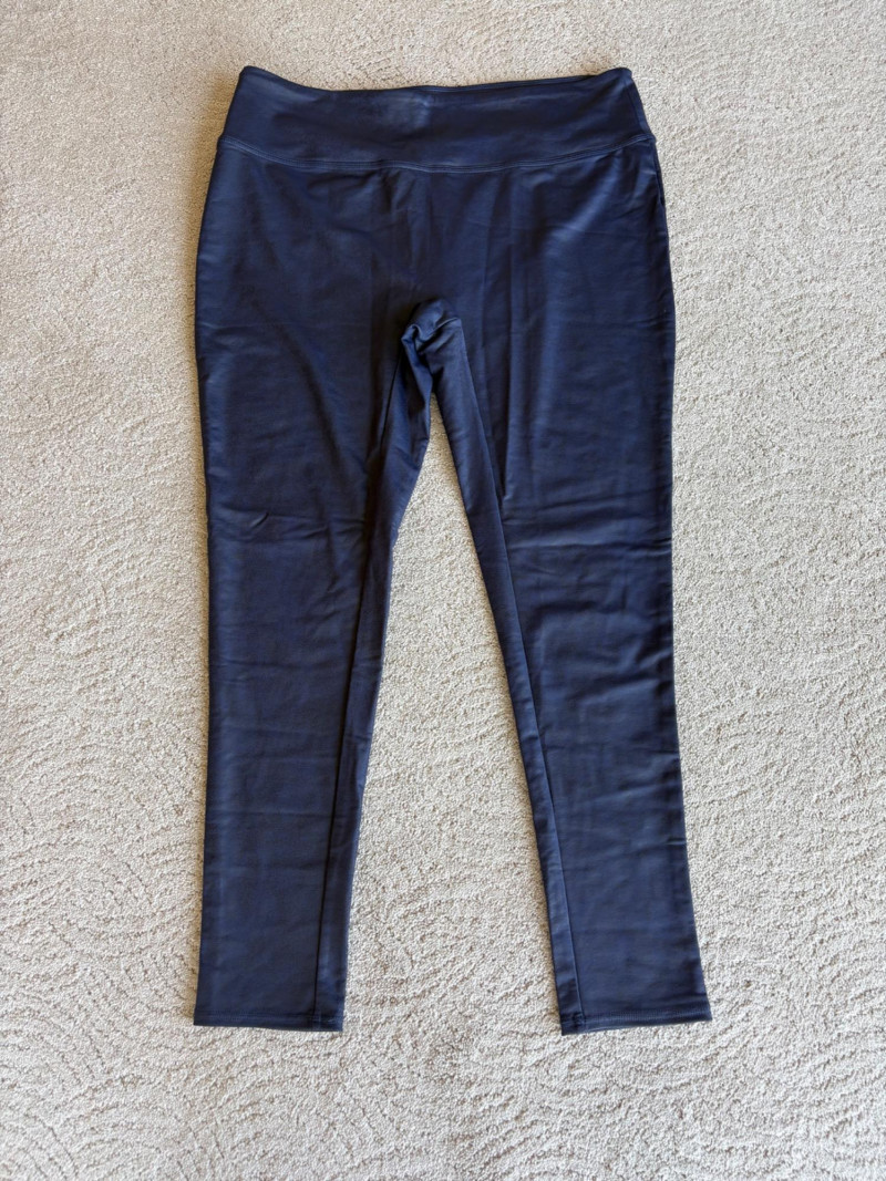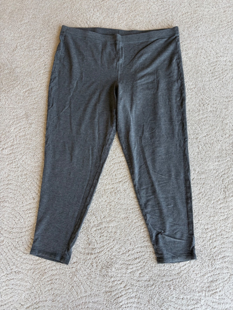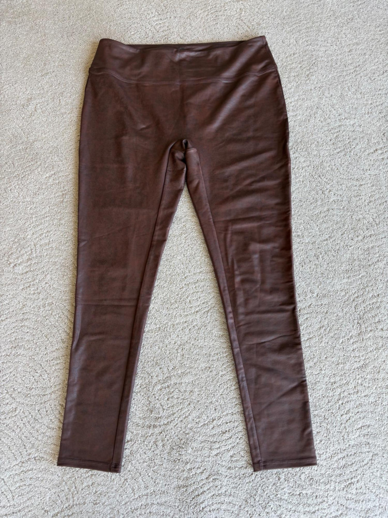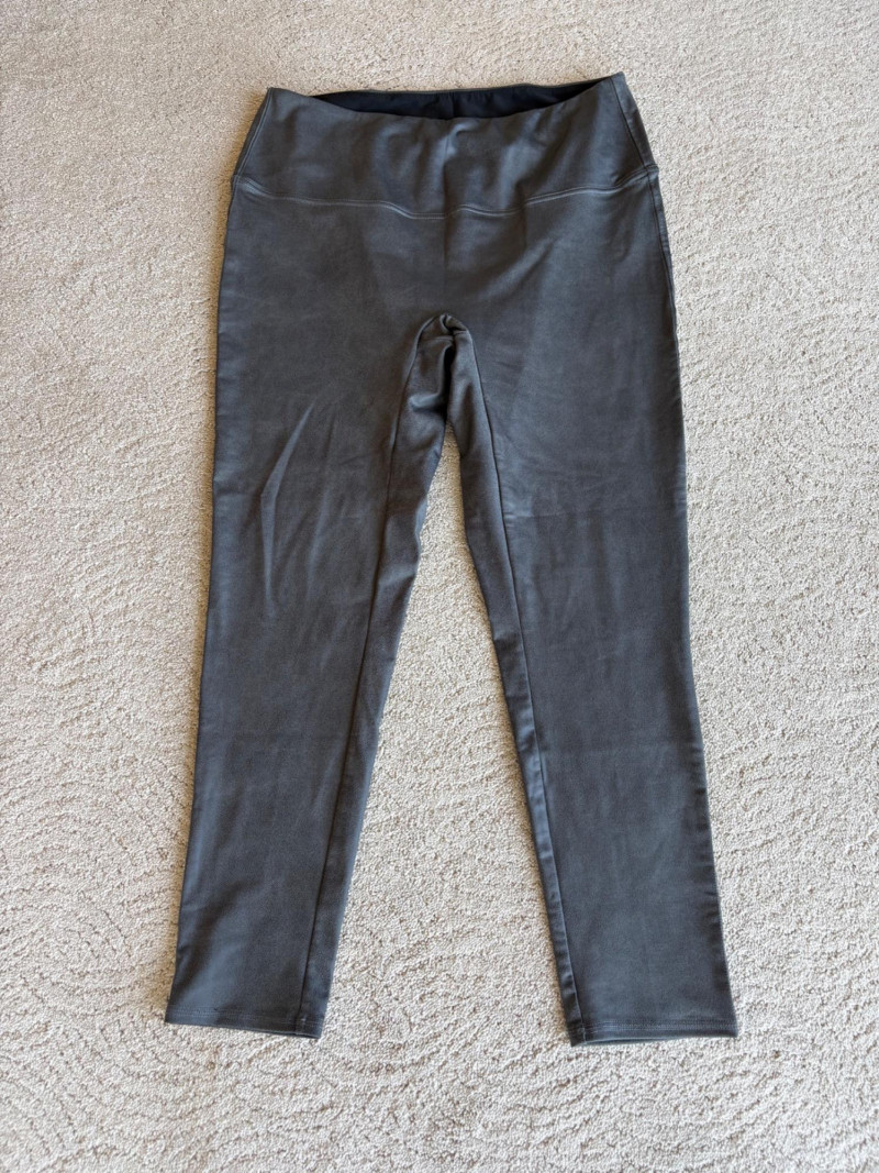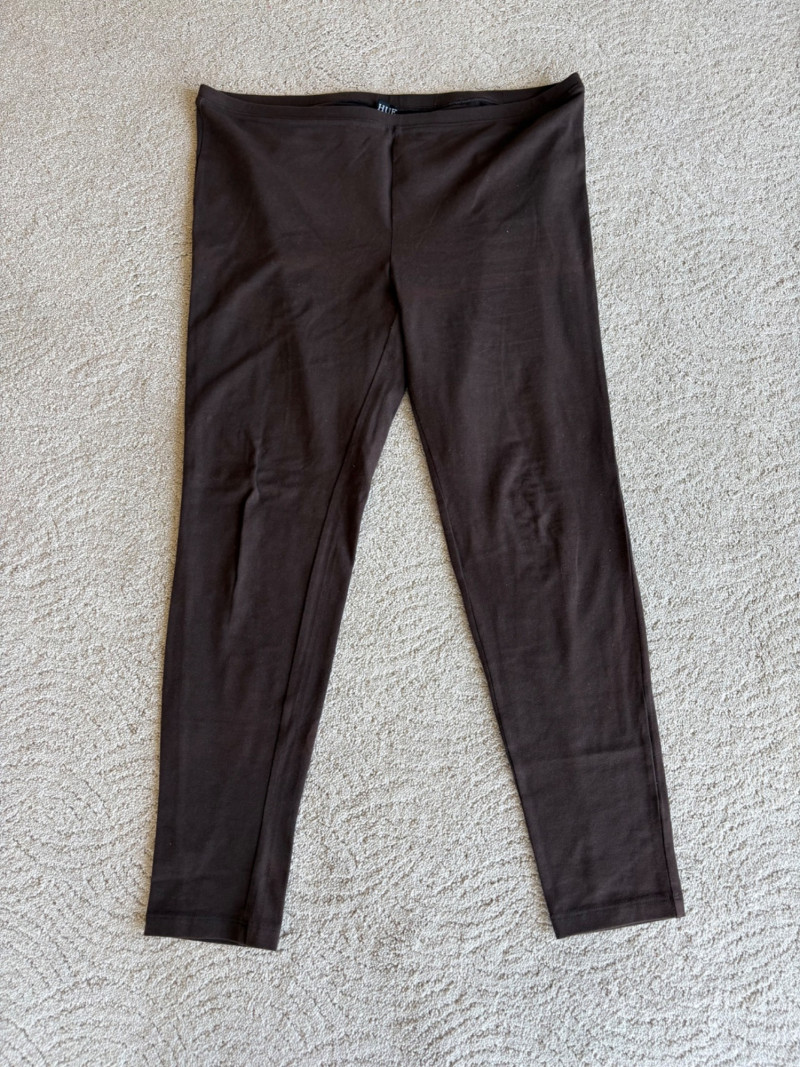 Group of leggings for every occasion. All measure 18" from side to side.at waist.. - Black pair from Eileen Fisher is Tencel/spandex blend. Size tag says XL. - Light grey pair from Eileen Fisher is organic cotton/spandex blend. Size tag says 1X. This pair has white overcast stitching along the seams on the exterior. - Dark grey pair from Eileen Fisher is Lyocell/polyurethane blend. Size tag says XL. - Brown pair from Hue is cotton/spandex blend. Size tag says XL. - Leather/wet look navy blue pair from All Worthy is nylon/spandex blend. Size tag says XLT. - Leather/wet look grey pair from DG2 is nylon/spandex blend. Size tag says XL. - Leather/wet look brown pair from All Worthy is nylon/spandex blend. Size tag says XLT.