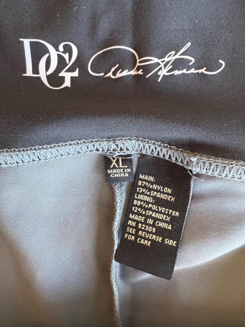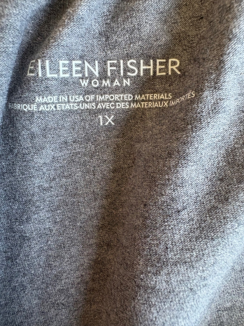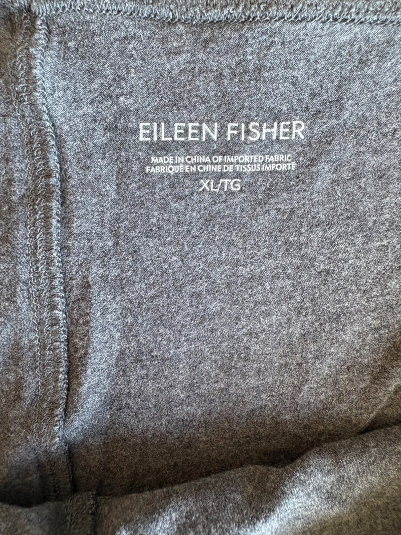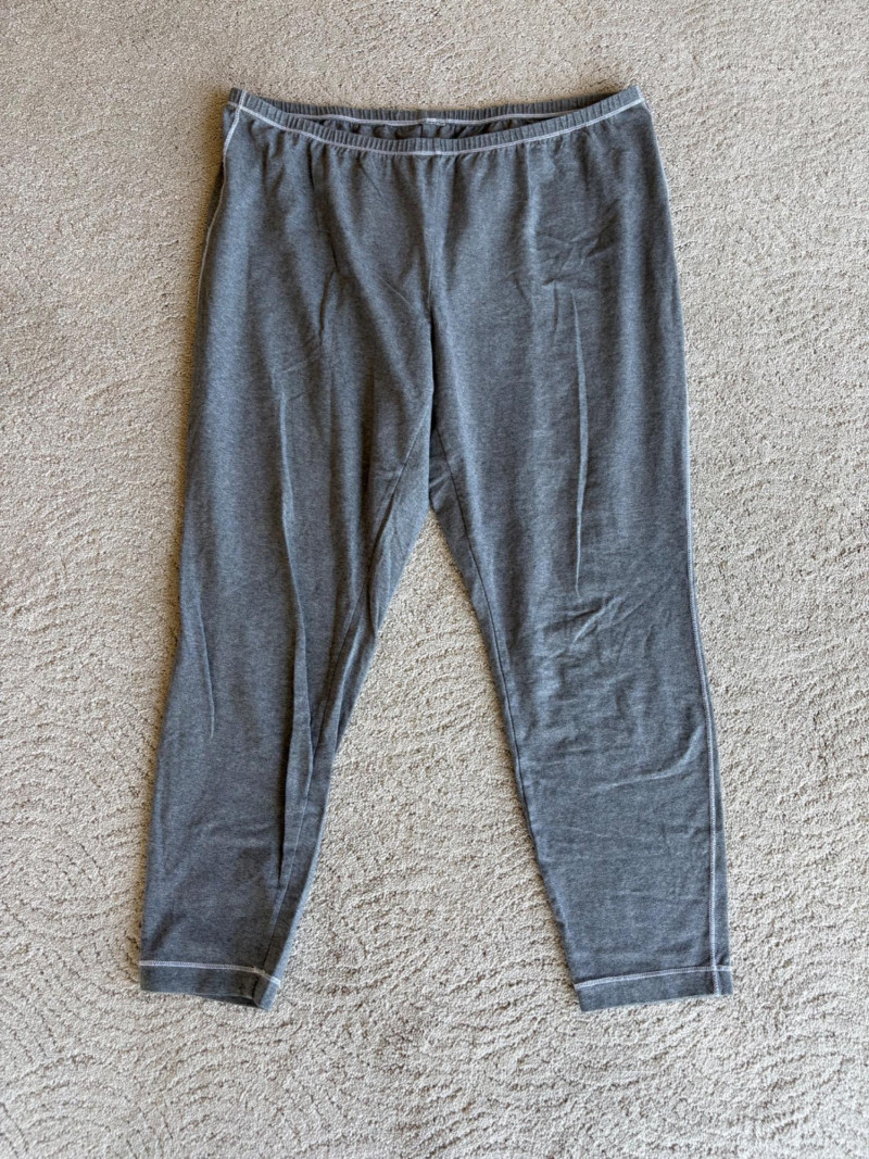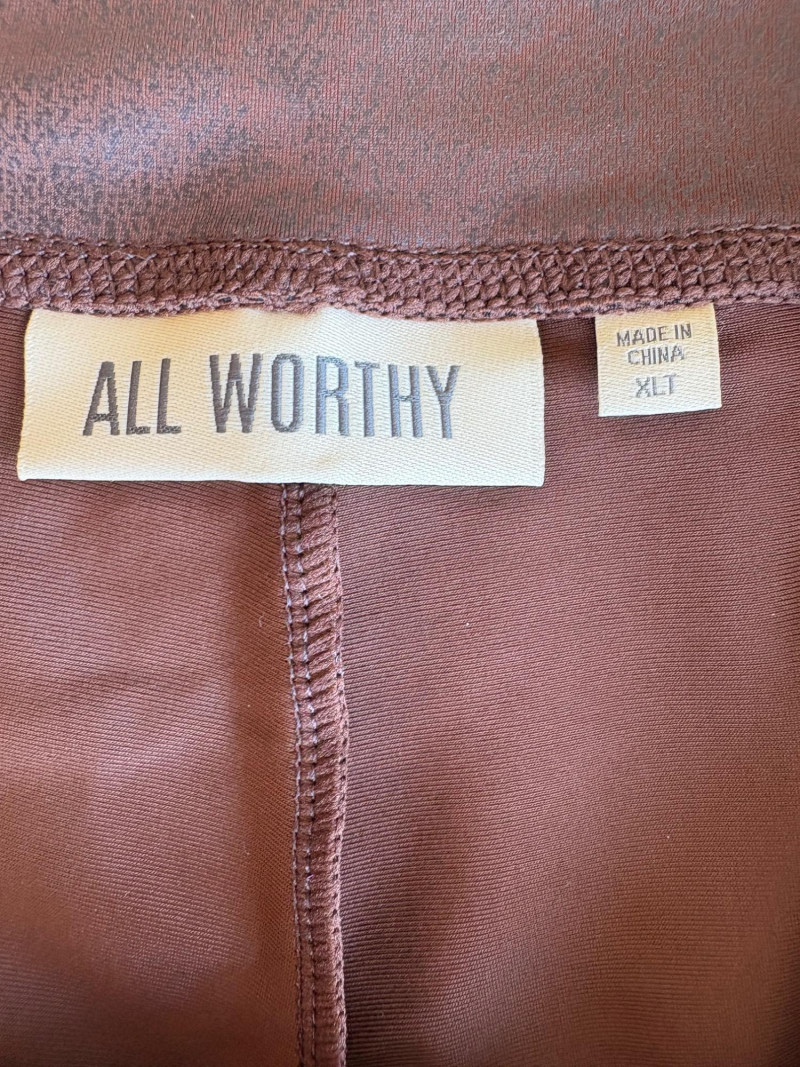 Group of leggings for every occasion. All measure 18" from side to side.at waist.. - Black pair from Eileen Fisher is Tencel/spandex blend. Size tag says XL. - Light grey pair from Eileen Fisher is organic cotton/spandex blend. Size tag says 1X. This pair has white overcast stitching along the seams on the exterior. - Dark grey pair from Eileen Fisher is Lyocell/polyurethane blend. Size tag says XL. - Brown pair from Hue is cotton/spandex blend. Size tag says XL. - Leather/wet look navy blue pair from All Worthy is nylon/spandex blend. Size tag says XLT. - Leather/wet look grey pair from DG2 is nylon/spandex blend. Size tag says XL. - Leather/wet look brown pair from All Worthy is nylon/spandex blend. Size tag says XLT.