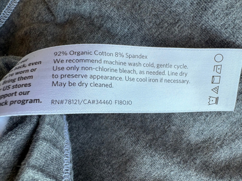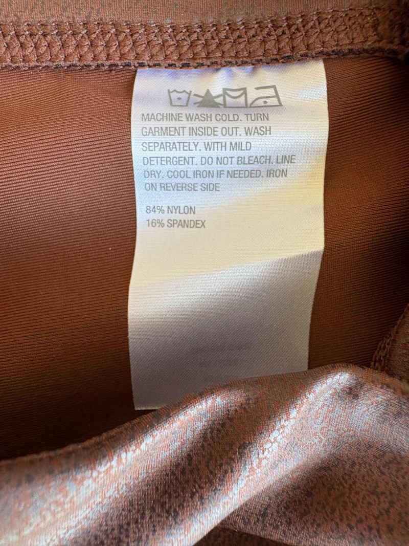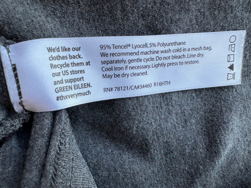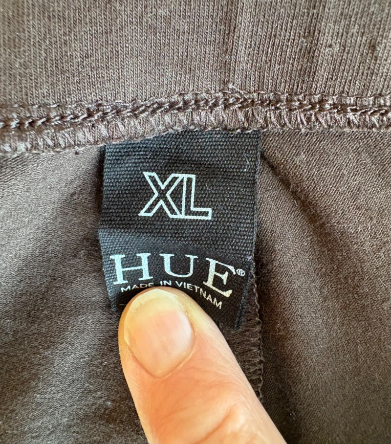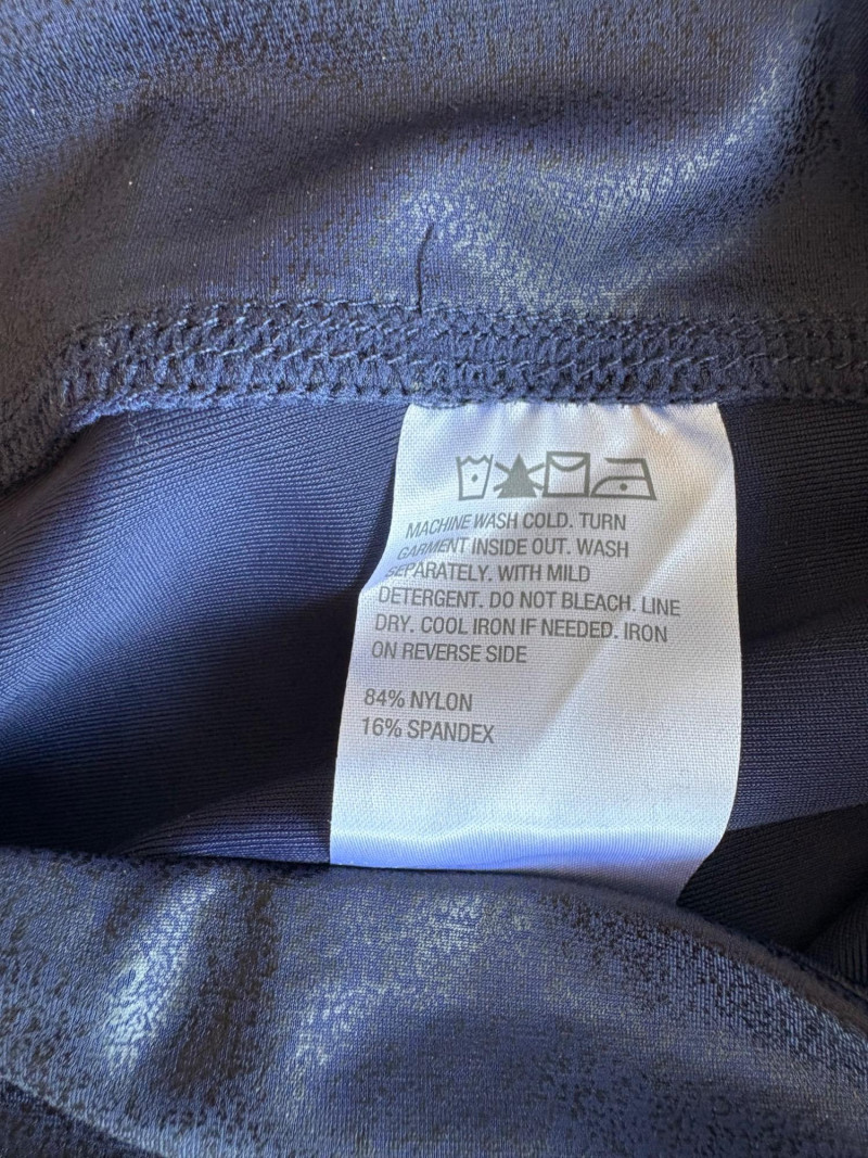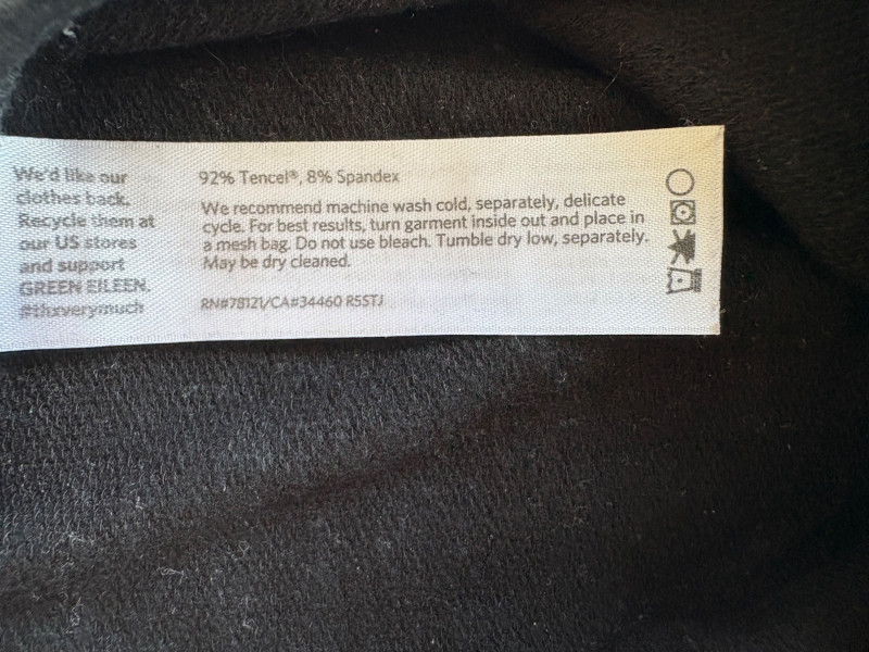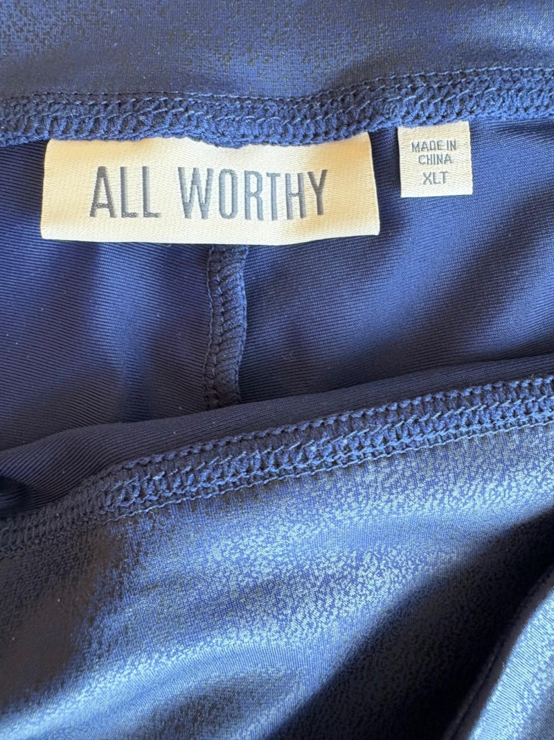 Group of leggings for every occasion. All measure 18" from side to side.at waist.. - Black pair from Eileen Fisher is Tencel/spandex blend. Size tag says XL. - Light grey pair from Eileen Fisher is organic cotton/spandex blend. Size tag says 1X. This pair has white overcast stitching along the seams on the exterior. - Dark grey pair from Eileen Fisher is Lyocell/polyurethane blend. Size tag says XL. - Brown pair from Hue is cotton/spandex blend. Size tag says XL. - Leather/wet look navy blue pair from All Worthy is nylon/spandex blend. Size tag says XLT. - Leather/wet look grey pair from DG2 is nylon/spandex blend. Size tag says XL. - Leather/wet look brown pair from All Worthy is nylon/spandex blend. Size tag says XLT.