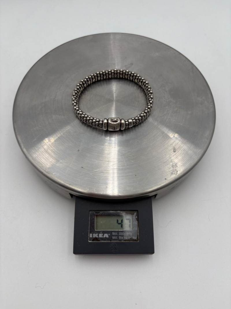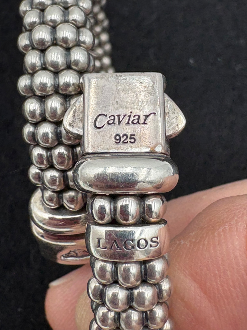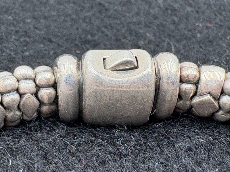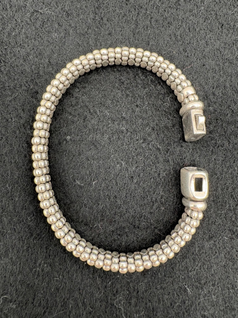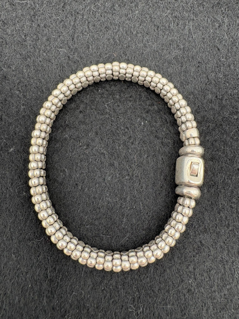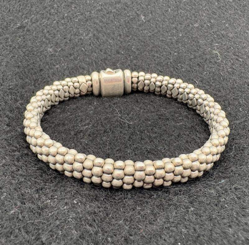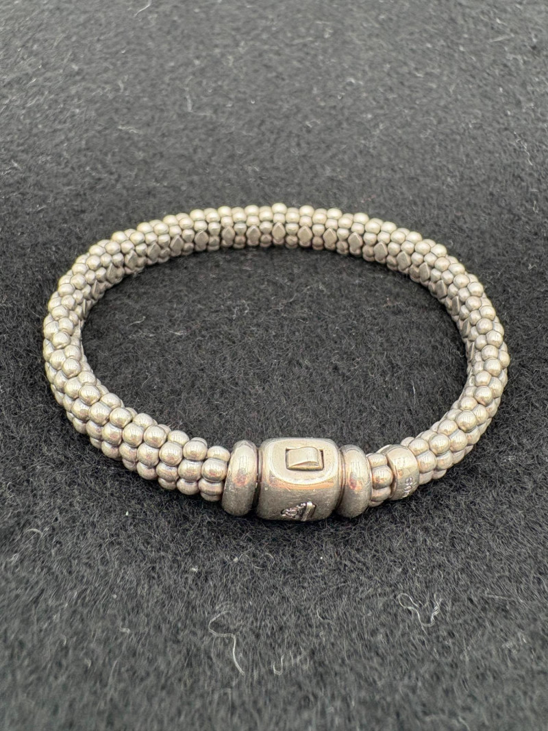 Fabulously detailed LAGOS bracelet; delicate without being dainty! "Caviar" .925 sterling silver bracelet from luxury jewelry designer Steve Lagos. Great neutral silver to go with any outfit where you want a bit of subtle style. Push spring slide-out clasp. No flaws noted. Total circumference approx. 7". Weighs 47 grams..