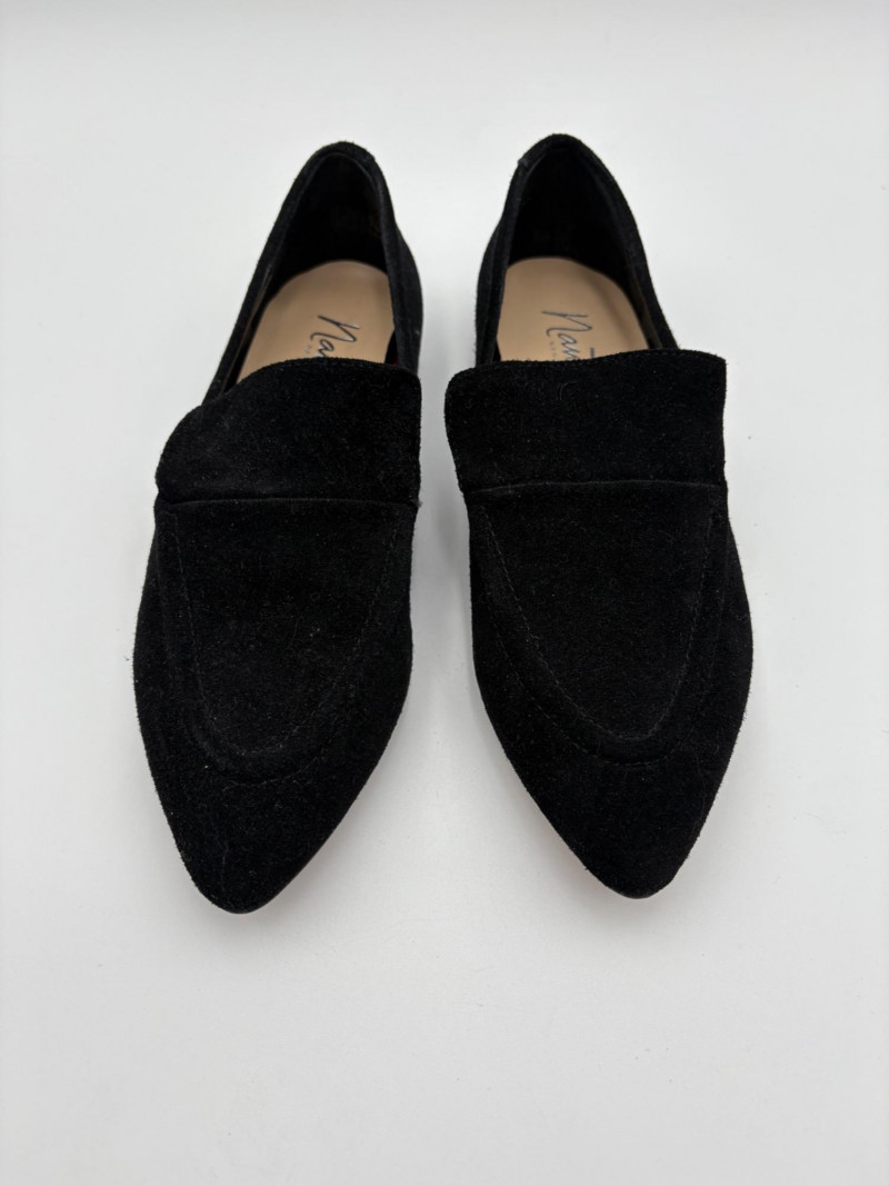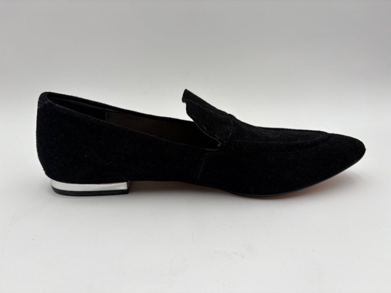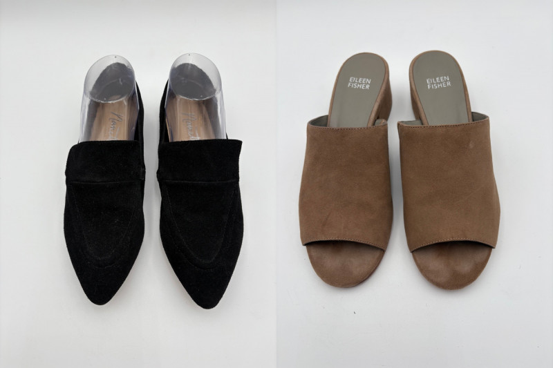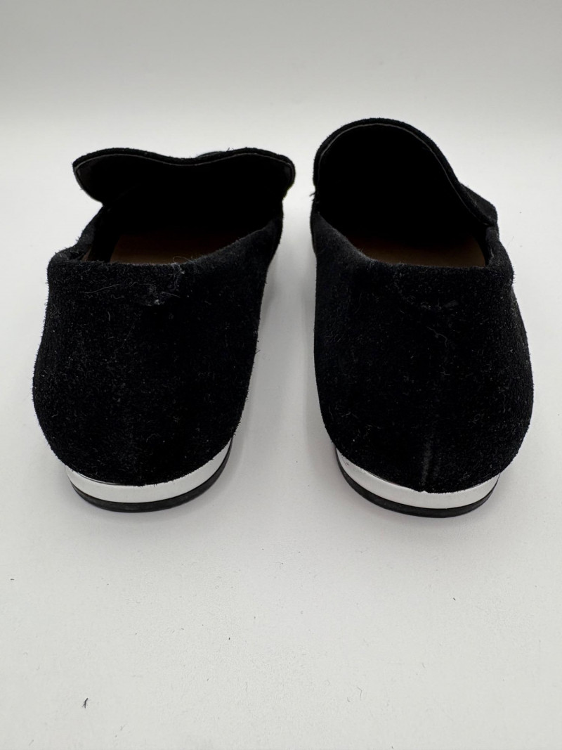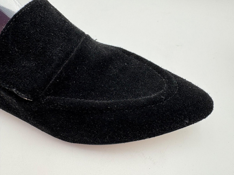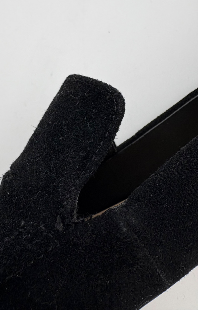 Nanette black suede tuxedo-style flats with pointed toe. Size 7. Eileen Fisher open toe suede mules with self-covered heel and in-step gusset. Size 7.