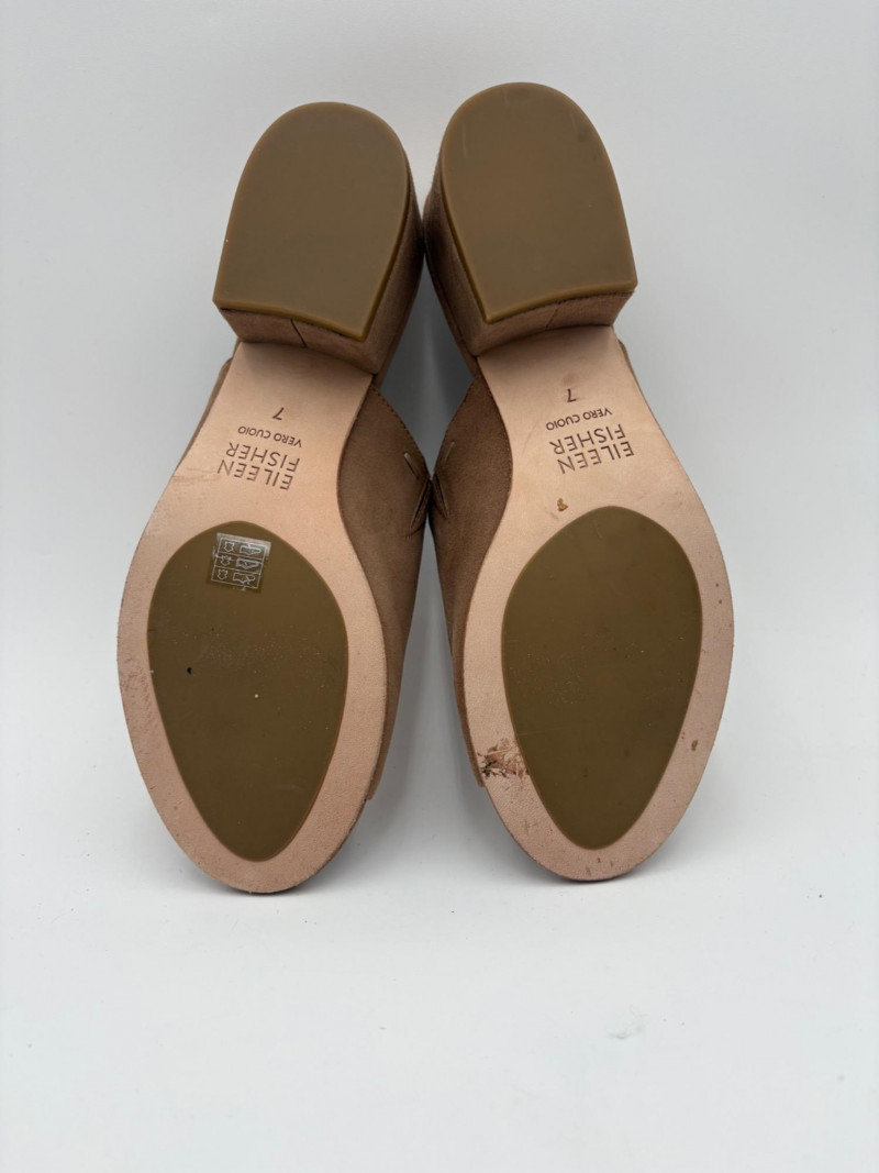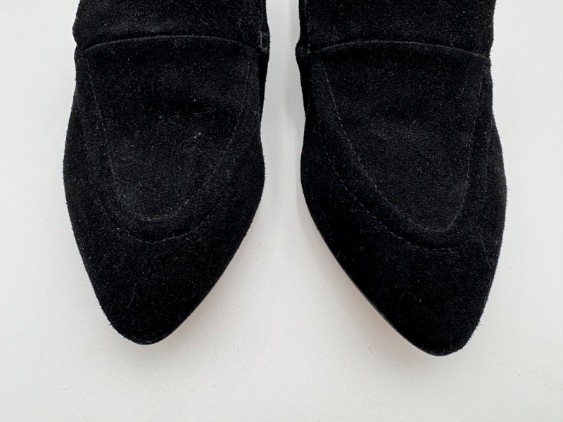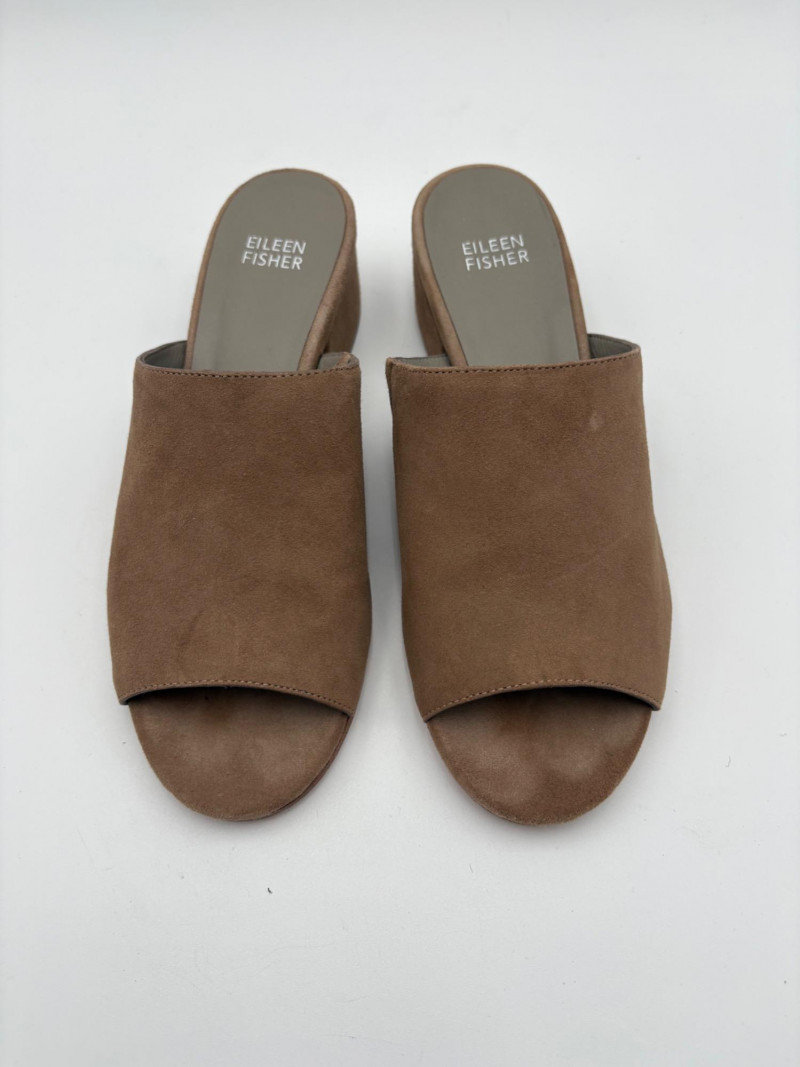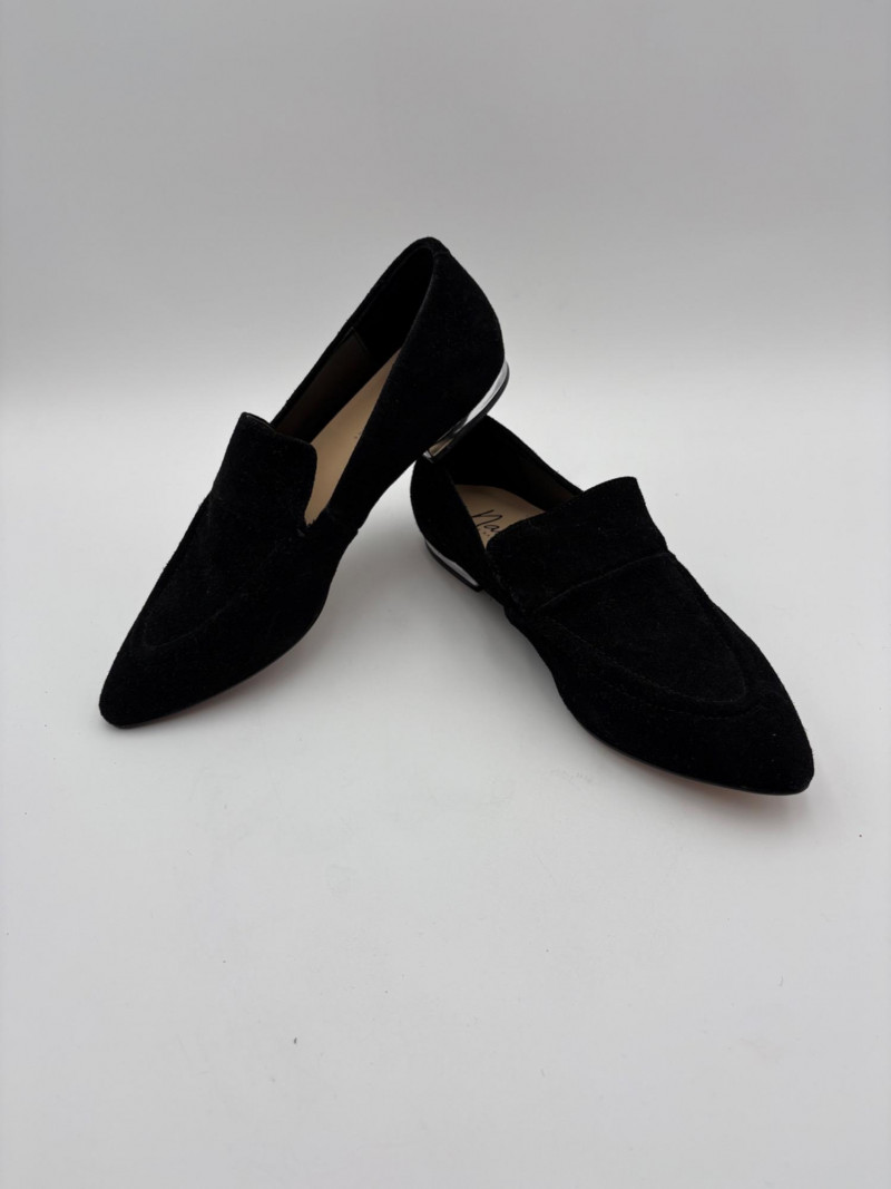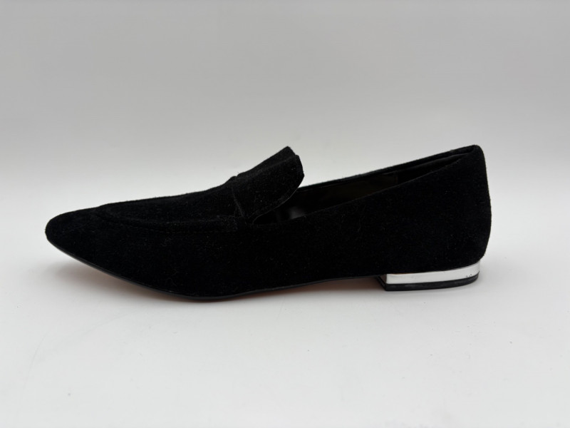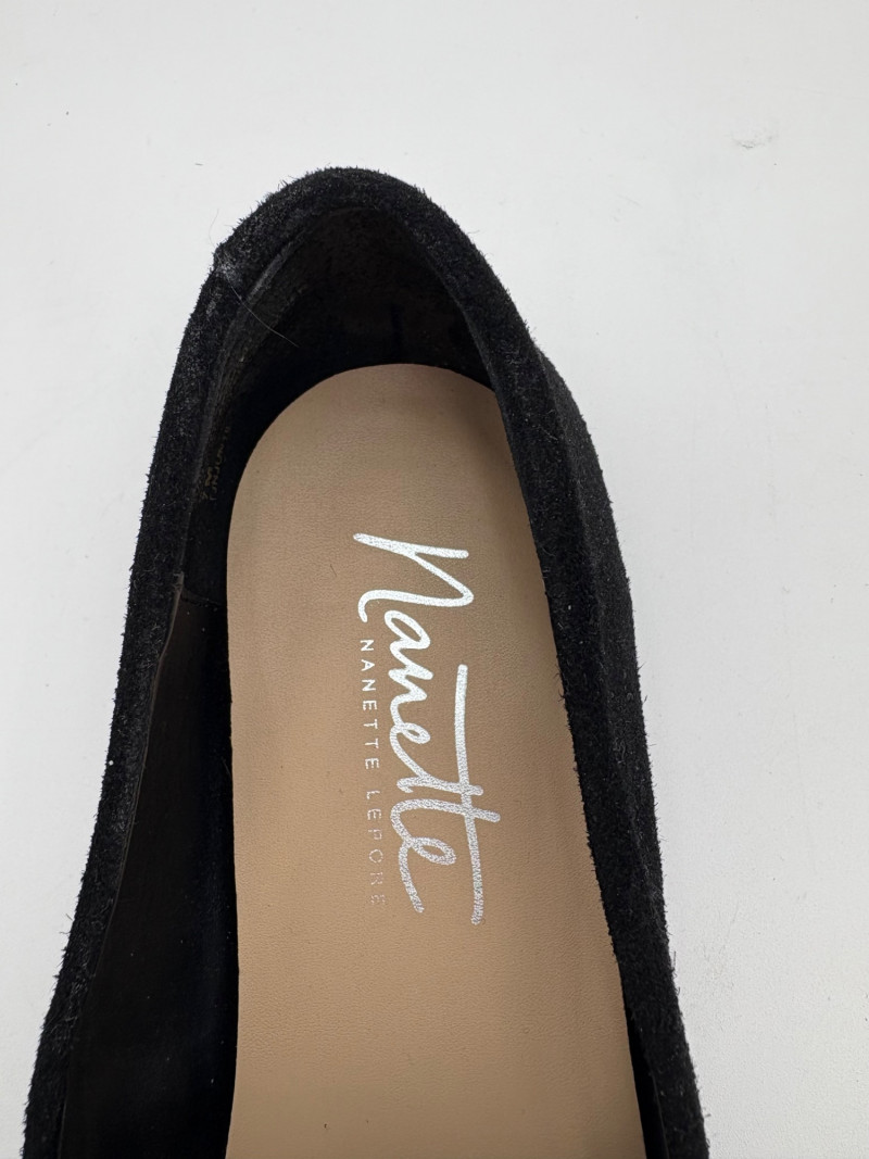 Nanette black suede tuxedo-style flats with pointed toe. Size 7. Eileen Fisher open toe suede mules with self-covered heel and in-step gusset. Size 7.