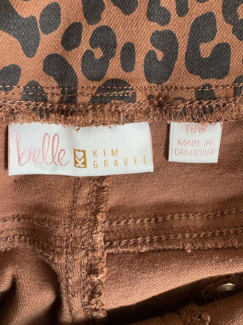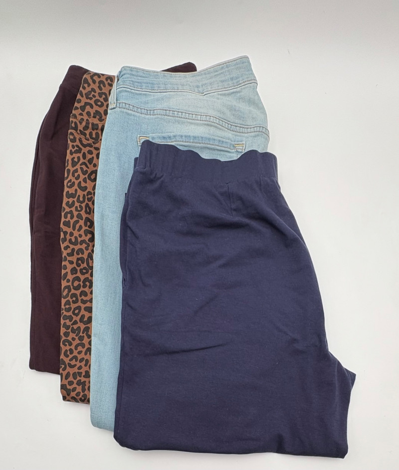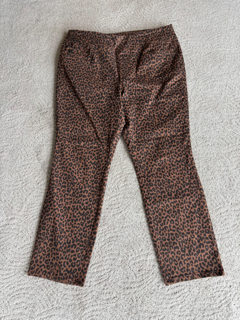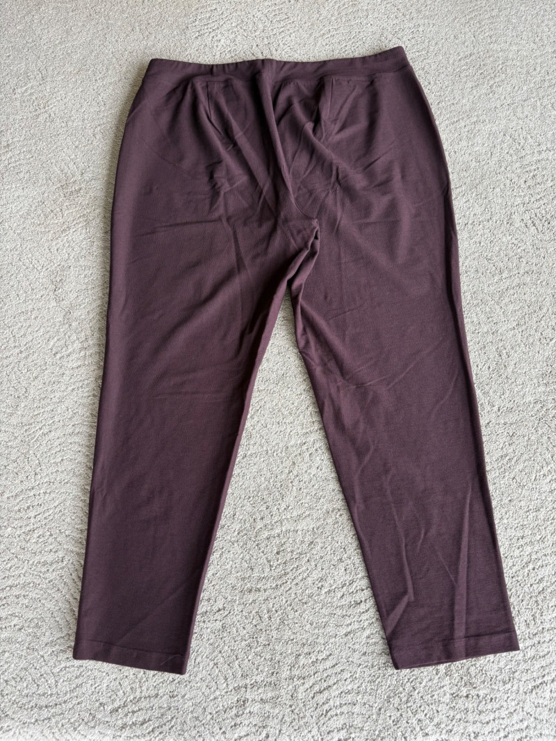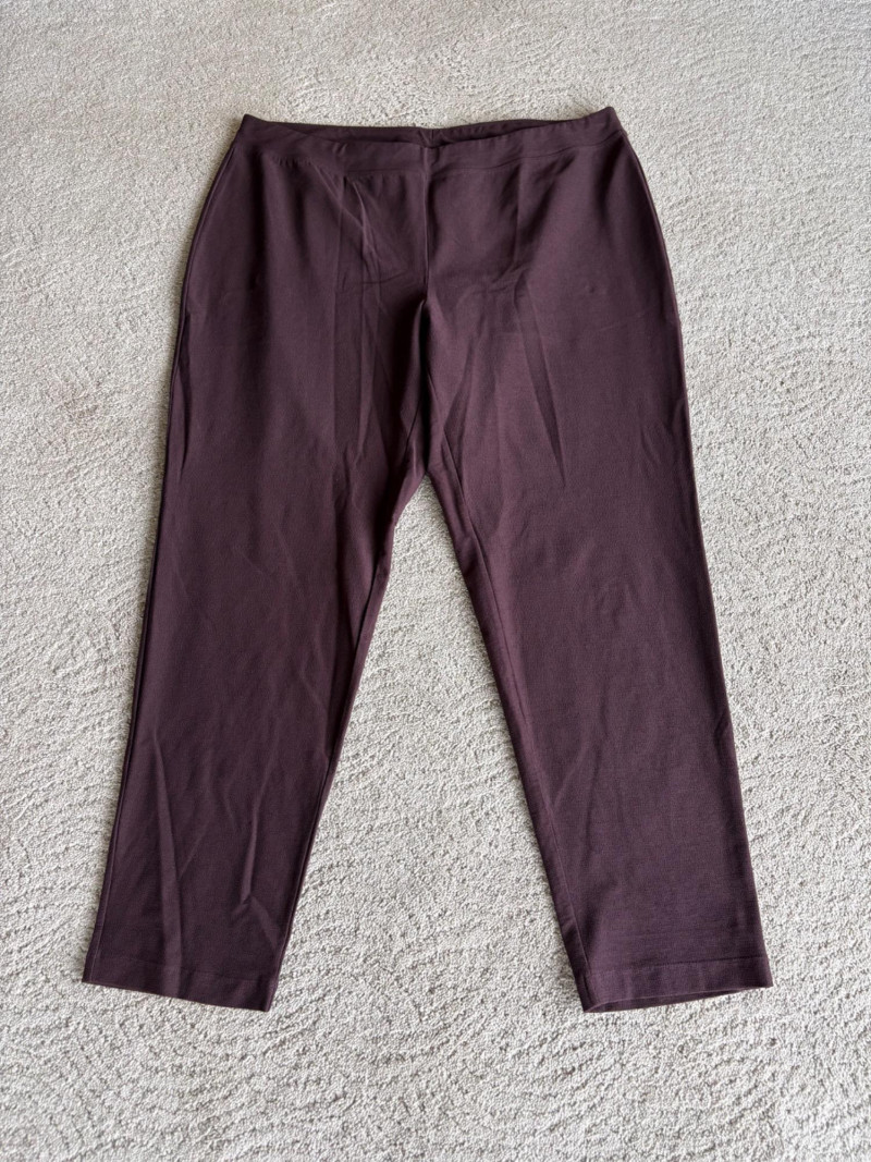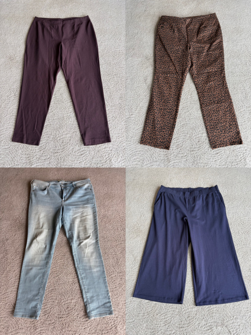 2 pairs of comfy stretch knit pants and 2 pairs of comfy stretch jeans. Eileen Fisher brown viscose blend pants have flat elasticated waistband, back darts for better fit, and a slim leg. Measure 18.5" side to side at waist. Size tag says XL. Belle brown/black animal print pants have 5-pocket jeans styling, but the fly is faux - they are heavy stretch fabric. Measure 19" side to side at waist. Size tag says 18W. Vintage Old Navy jeans (from when they still made quality basics) have classic 5-pocket jeans styling and are nicely broken in. Measure 19" side to side at waist. Size tag says 16. Eileen Fisher navy blue cotton knit pants have wide stretchy waistband, set-in front pockets, and wide cropped legs. Measure 20" side to side at waist. Size tag says XL.