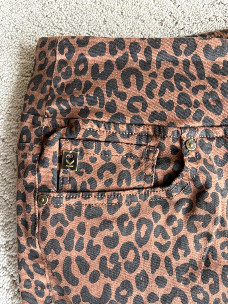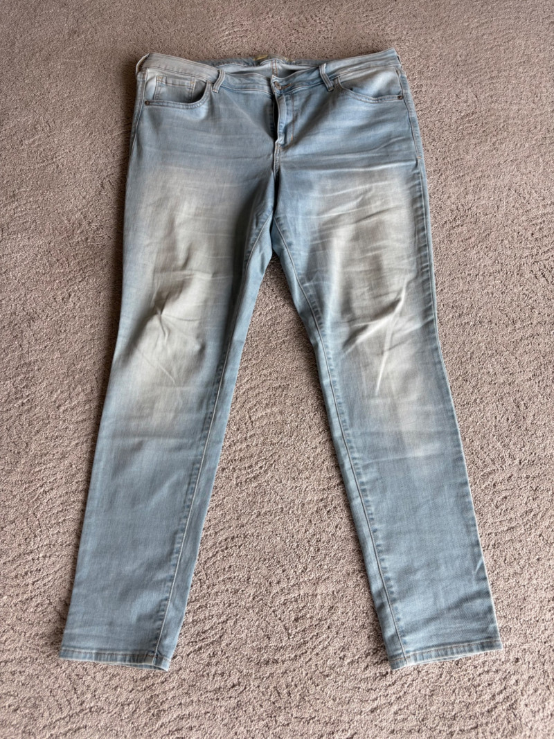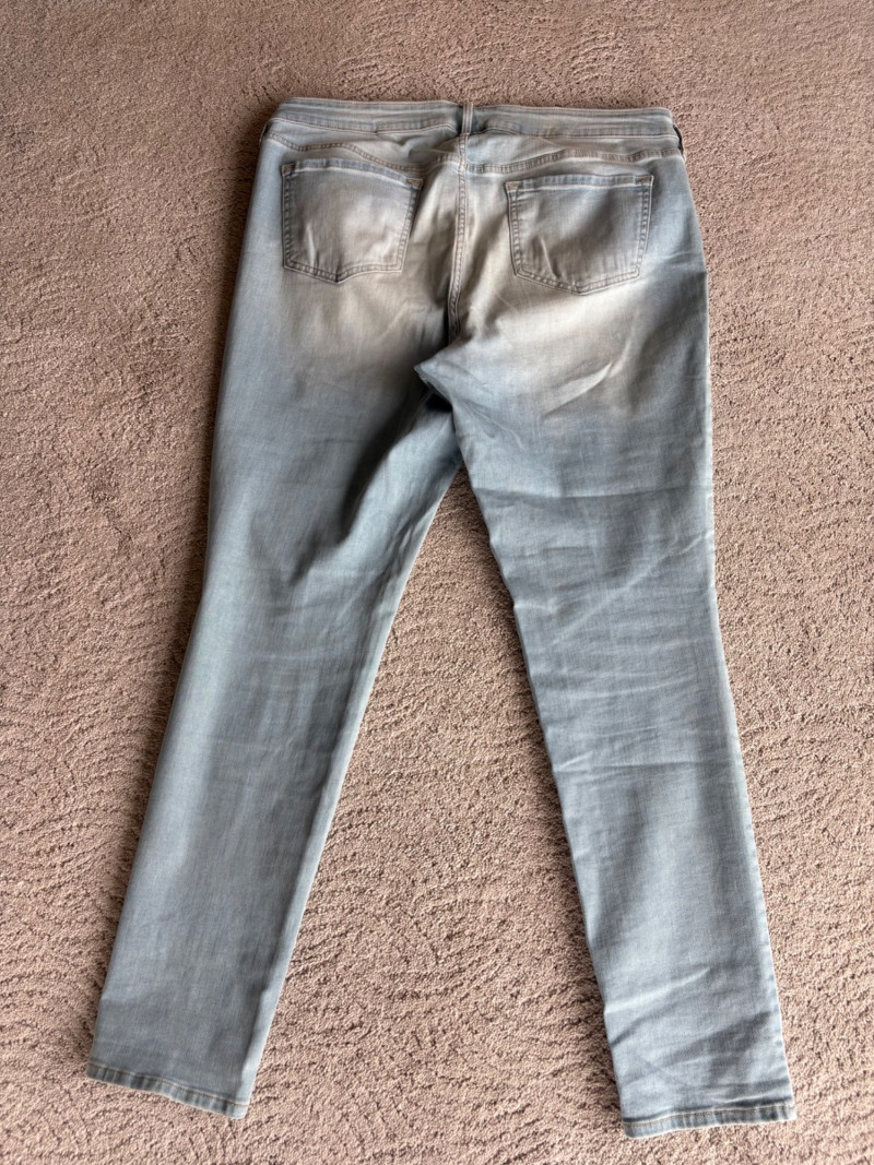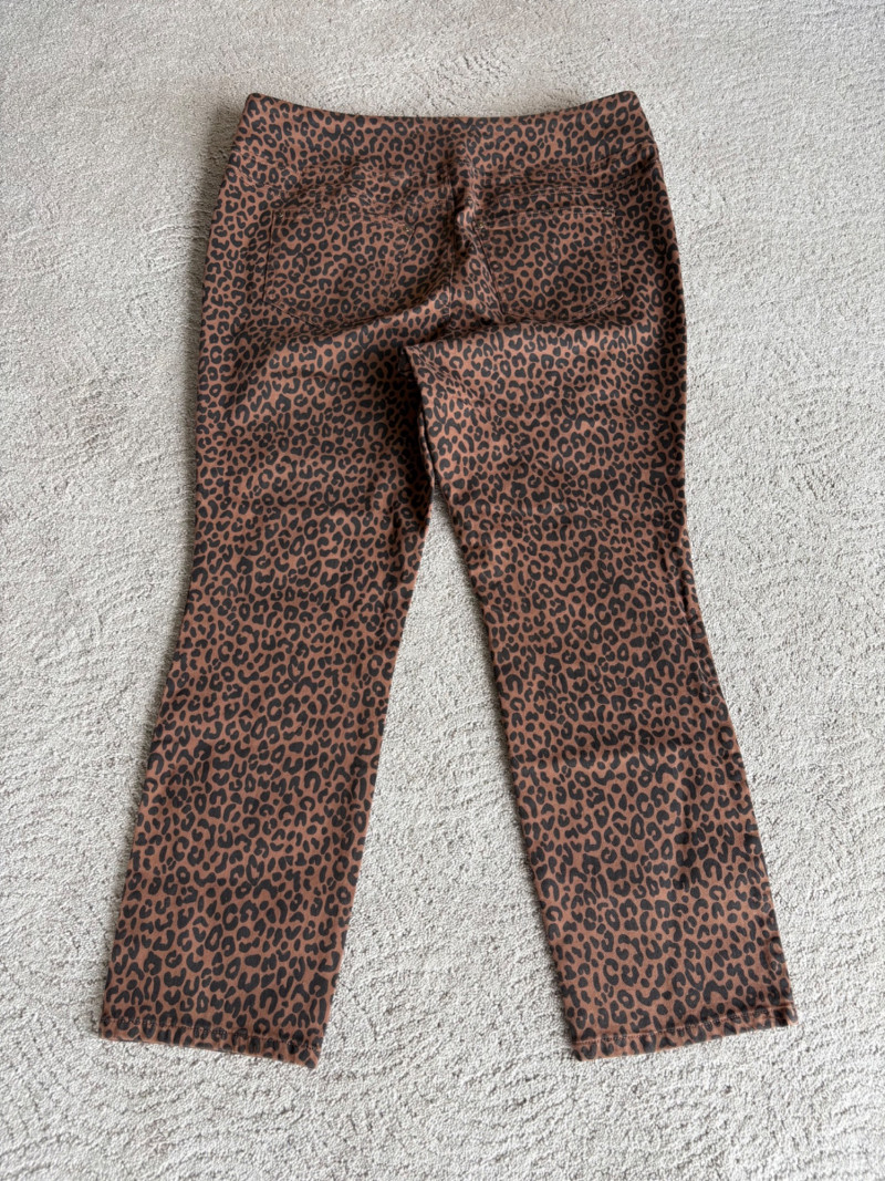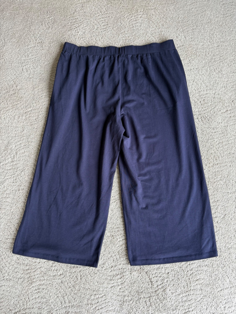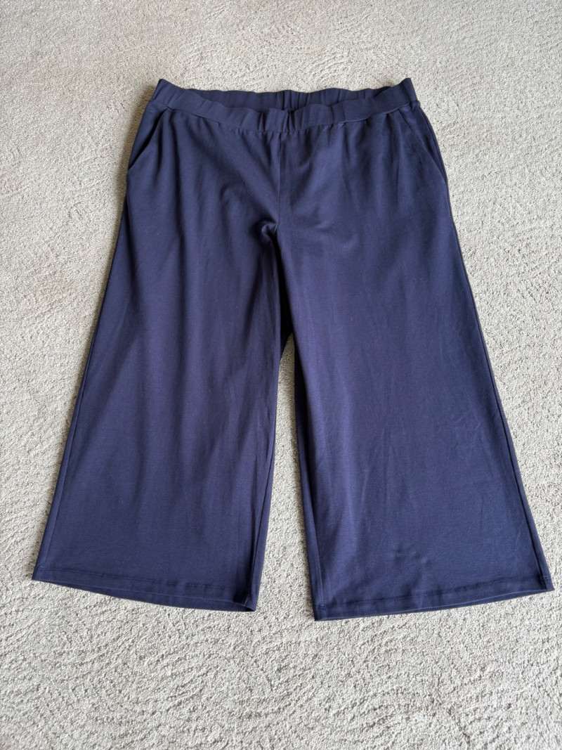 2 pairs of comfy stretch knit pants and 2 pairs of comfy stretch jeans. Eileen Fisher brown viscose blend pants have flat elasticated waistband, back darts for better fit, and a slim leg. Measure 18.5" side to side at waist. Size tag says XL. Belle brown/black animal print pants have 5-pocket jeans styling, but the fly is faux - they are heavy stretch fabric. Measure 19" side to side at waist. Size tag says 18W. Vintage Old Navy jeans (from when they still made quality basics) have classic 5-pocket jeans styling and are nicely broken in. Measure 19" side to side at waist. Size tag says 16. Eileen Fisher navy blue cotton knit pants have wide stretchy waistband, set-in front pockets, and wide cropped legs. Measure 20" side to side at waist. Size tag says XL.