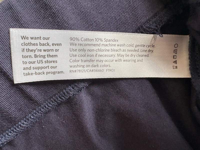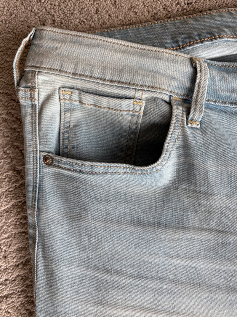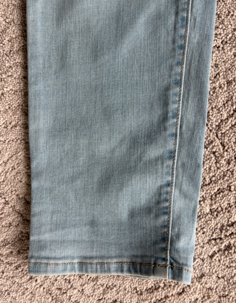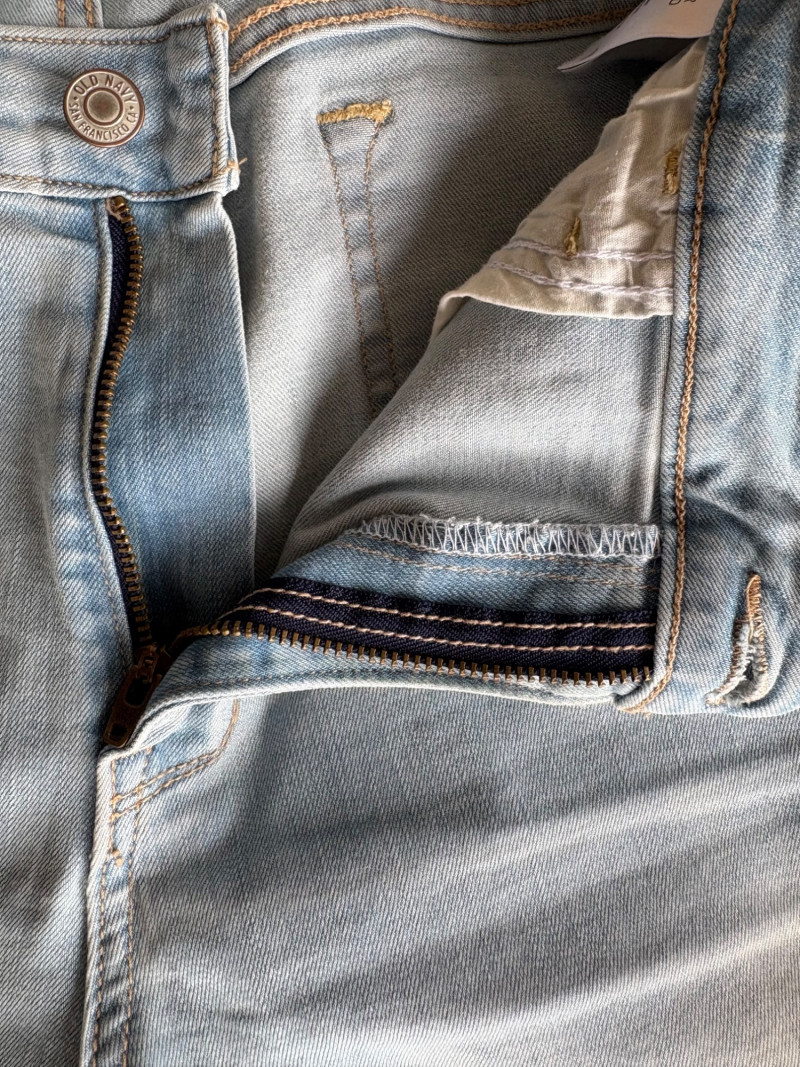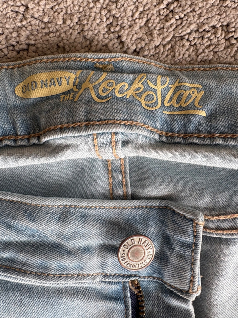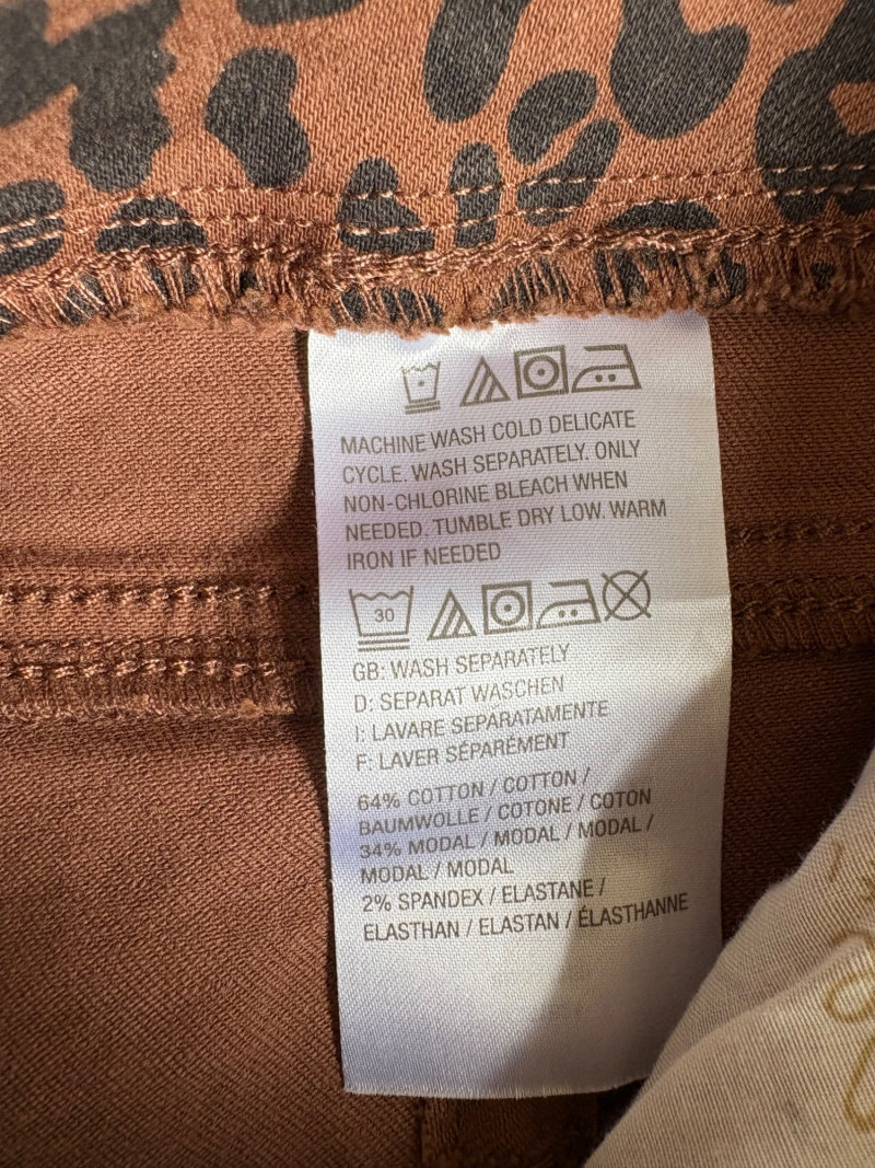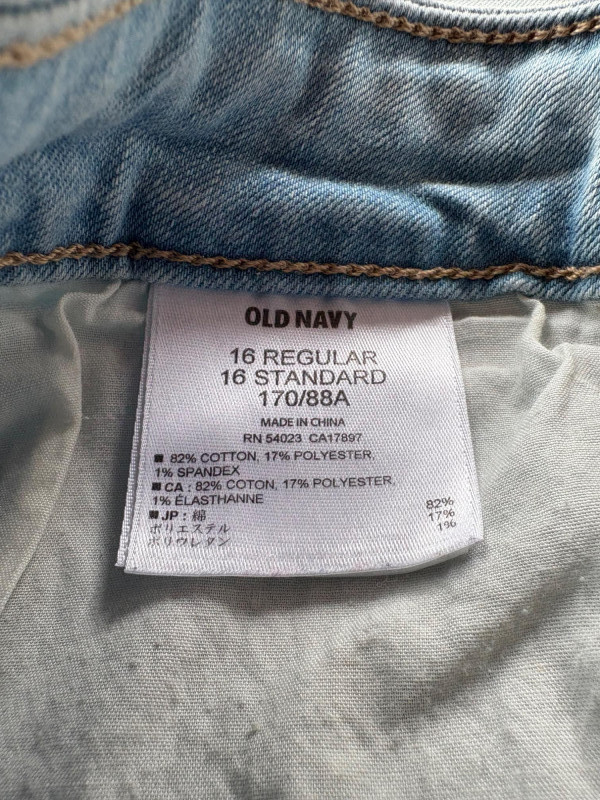 2 pairs of comfy stretch knit pants and 2 pairs of comfy stretch jeans. Eileen Fisher brown viscose blend pants have flat elasticated waistband, back darts for better fit, and a slim leg. Measure 18.5" side to side at waist. Size tag says XL. Belle brown/black animal print pants have 5-pocket jeans styling, but the fly is faux - they are heavy stretch fabric. Measure 19" side to side at waist. Size tag says 18W. Vintage Old Navy jeans (from when they still made quality basics) have classic 5-pocket jeans styling and are nicely broken in. Measure 19" side to side at waist. Size tag says 16. Eileen Fisher navy blue cotton knit pants have wide stretchy waistband, set-in front pockets, and wide cropped legs. Measure 20" side to side at waist. Size tag says XL.