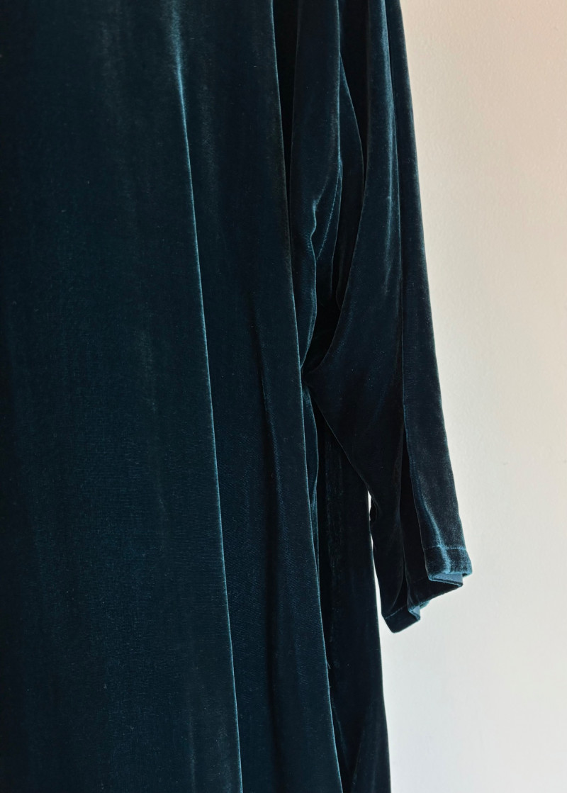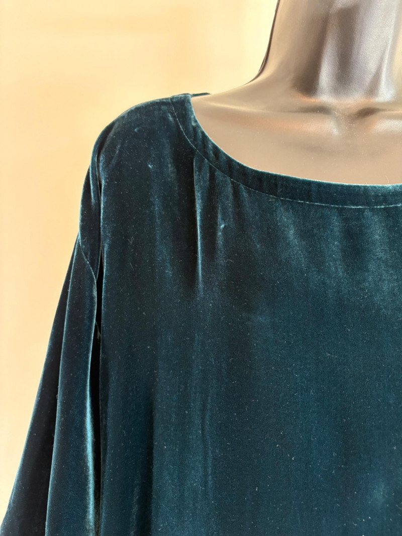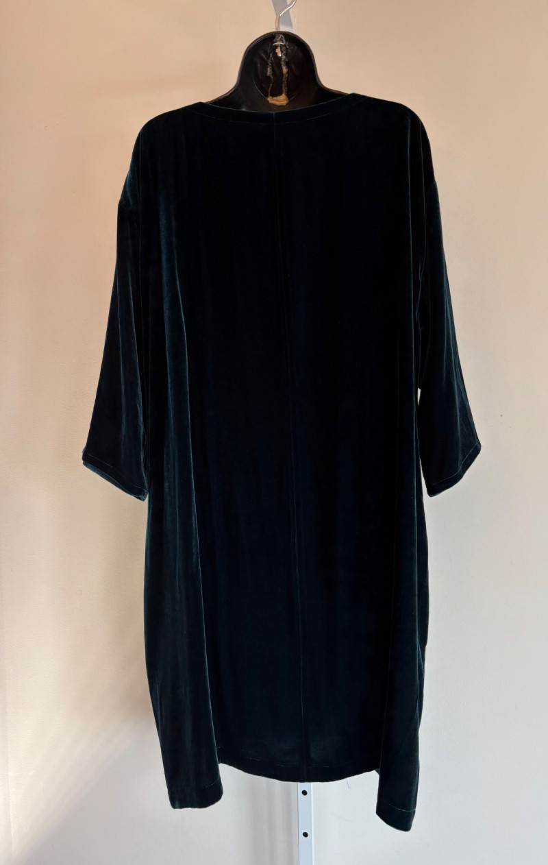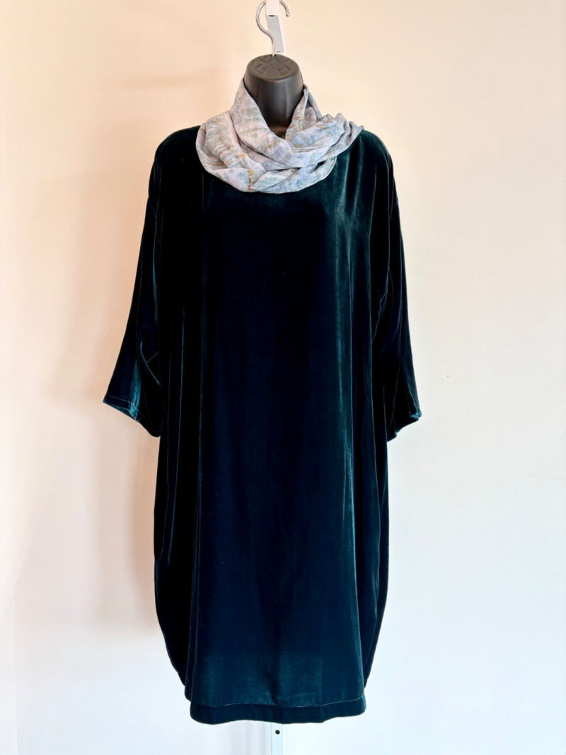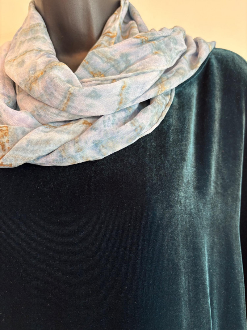 Gorgeous jewel-tone blue-green velvet dress from Eileen Fisher. Dress has curved neckline, dropped shoulder seams, subtle cocoon/ lantern shaping, and in-seam side pockets. Rayon/silk blend. Measures 25.5" pit to pit and 37" from back neckline to hem. Size tag says L. Paired with filmy scarf in brown and various hues of blue. Measures approx. 62" x 72". No maker or fabric tag, but appears to be hand painted.