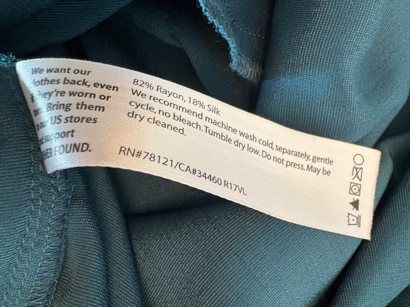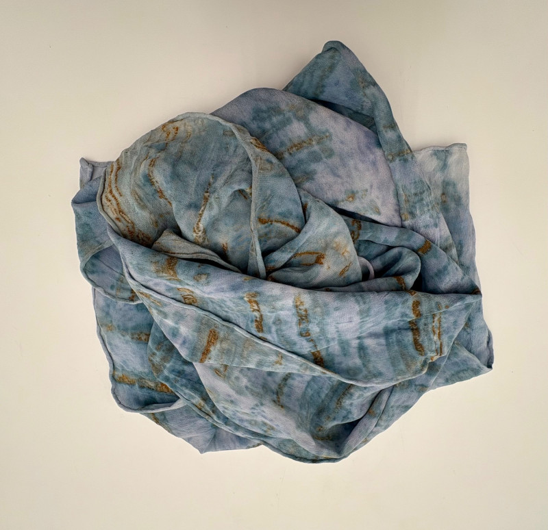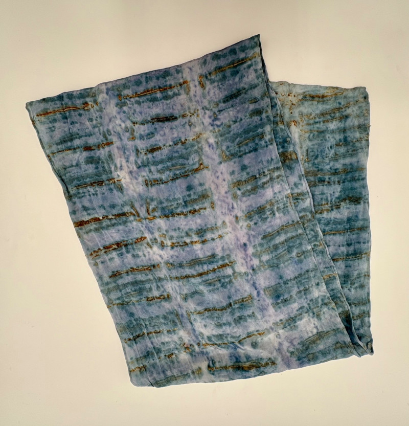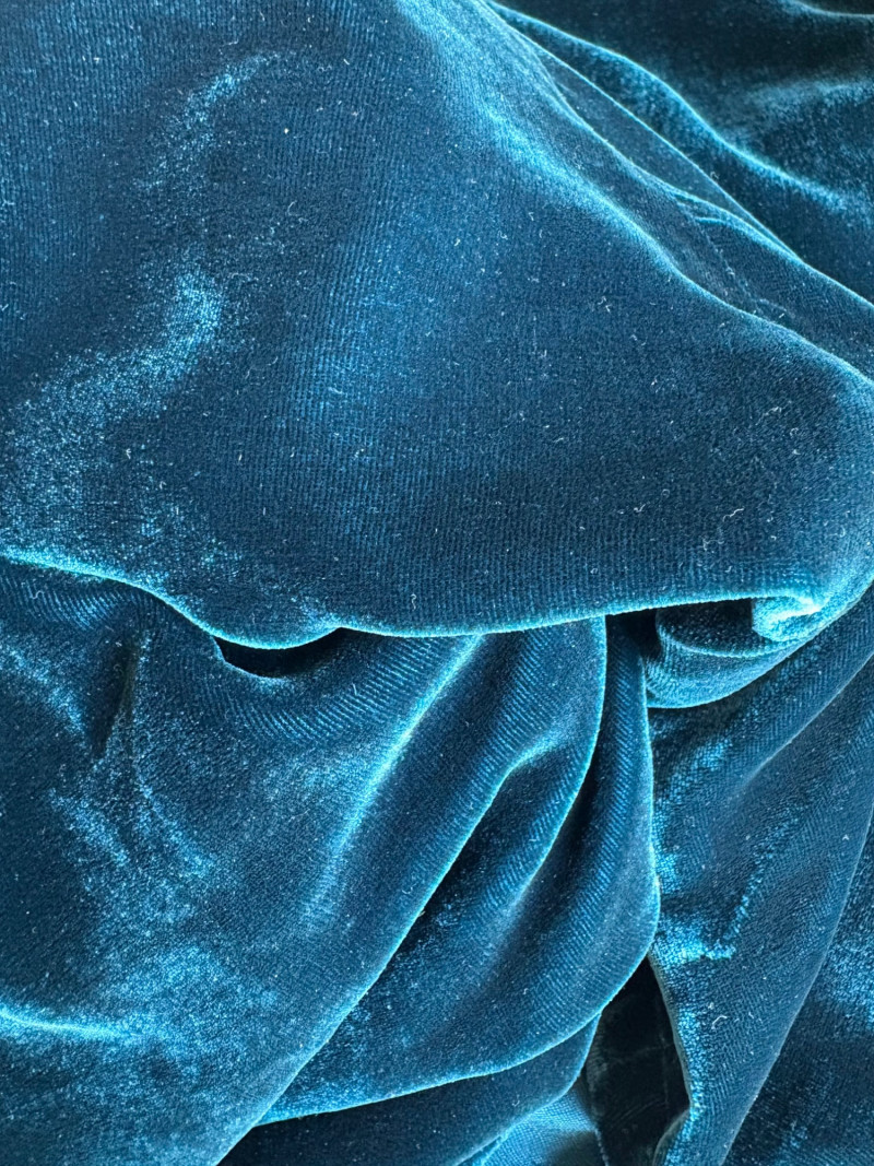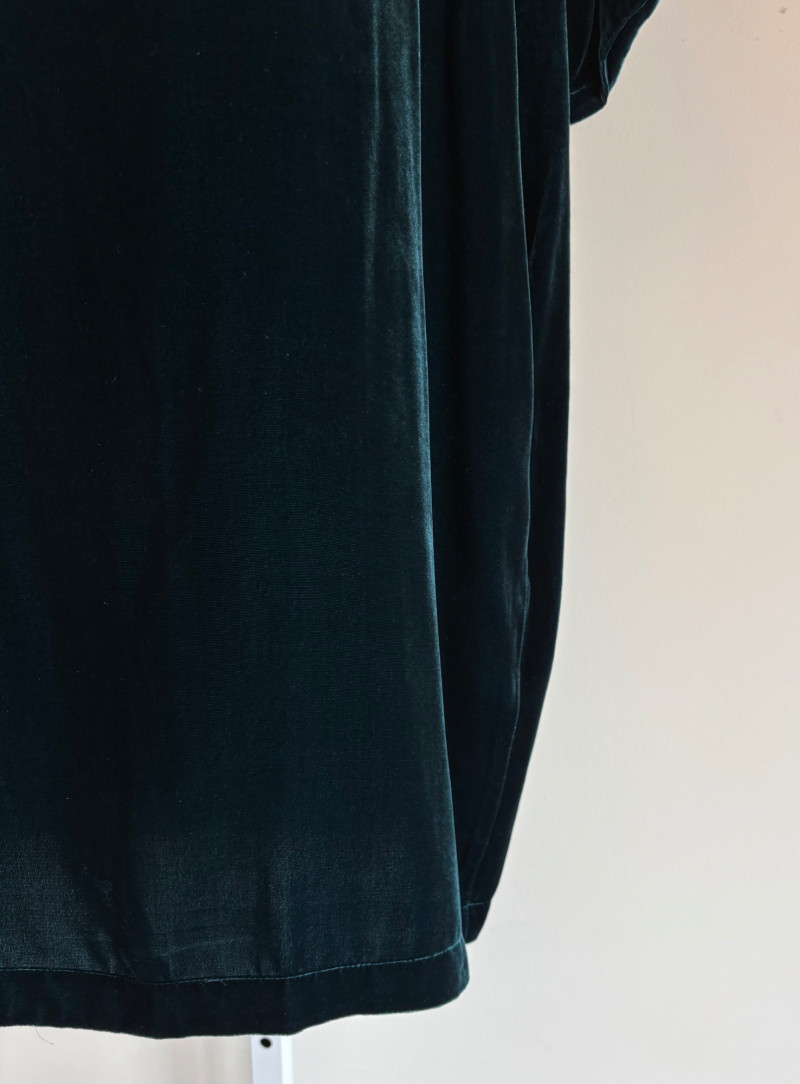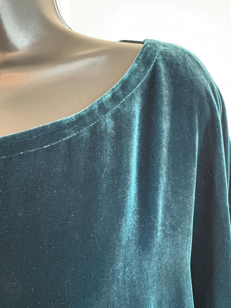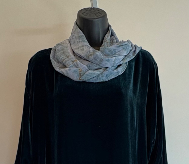 Gorgeous jewel-tone blue-green velvet dress from Eileen Fisher. Dress has curved neckline, dropped shoulder seams, subtle cocoon/ lantern shaping, and in-seam side pockets. Rayon/silk blend. Measures 25.5" pit to pit and 37" from back neckline to hem. Size tag says L. Paired with filmy scarf in brown and various hues of blue. Measures approx. 62" x 72". No maker or fabric tag, but appears to be hand painted.