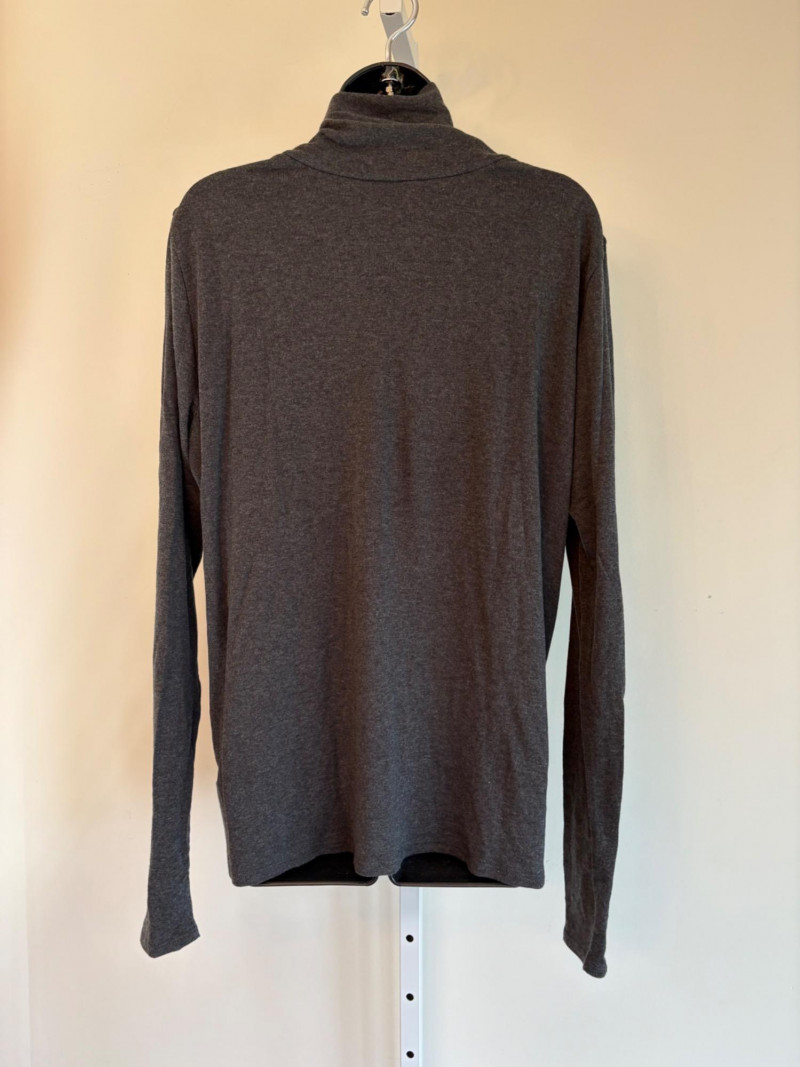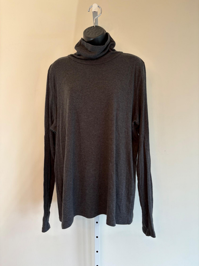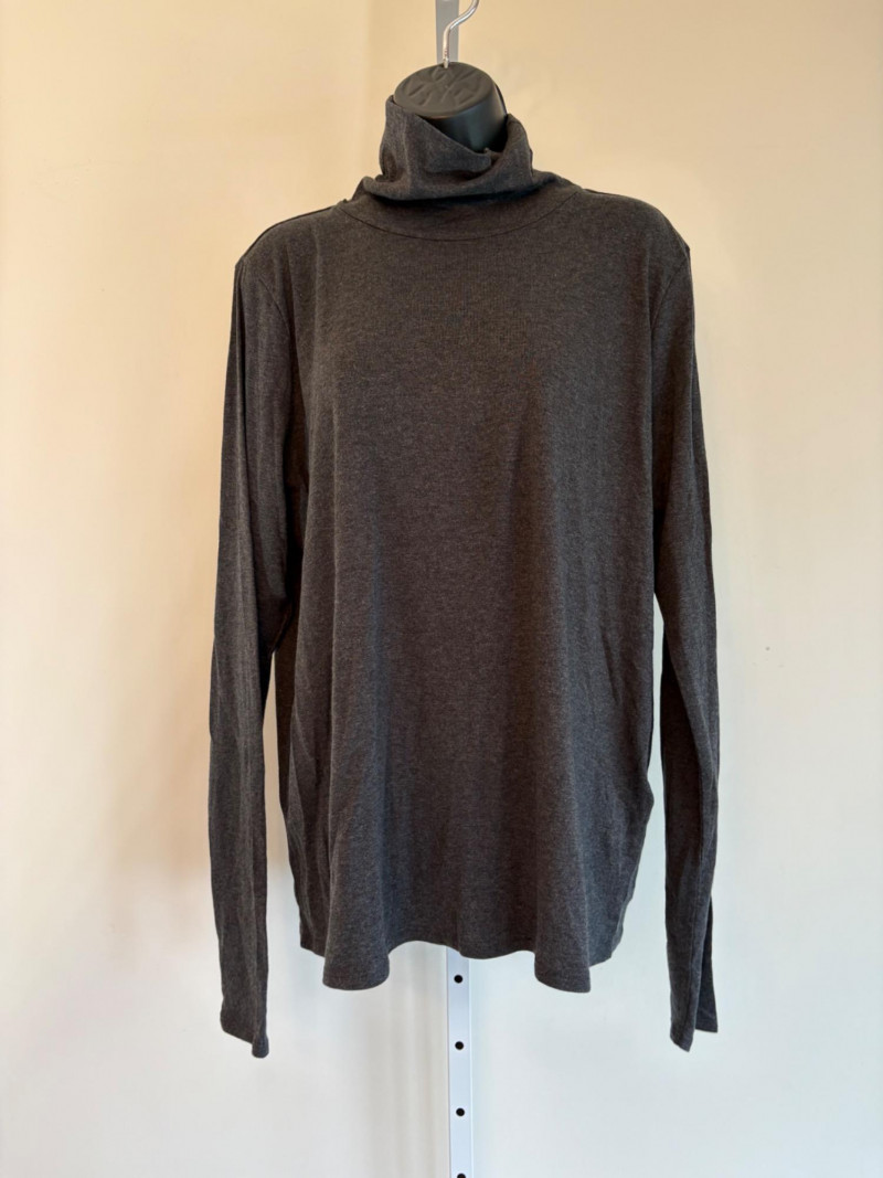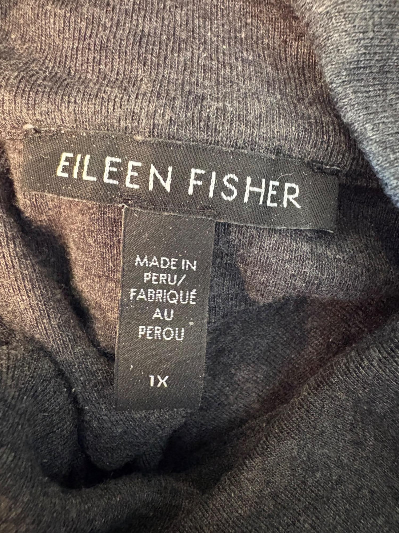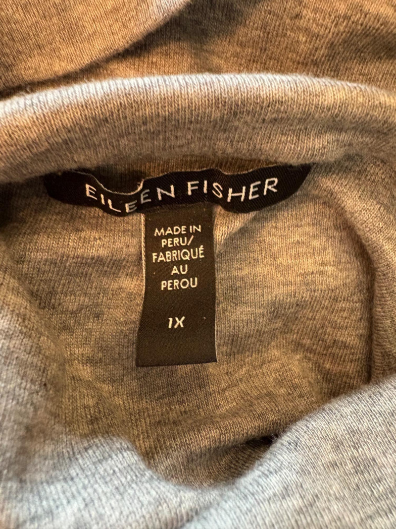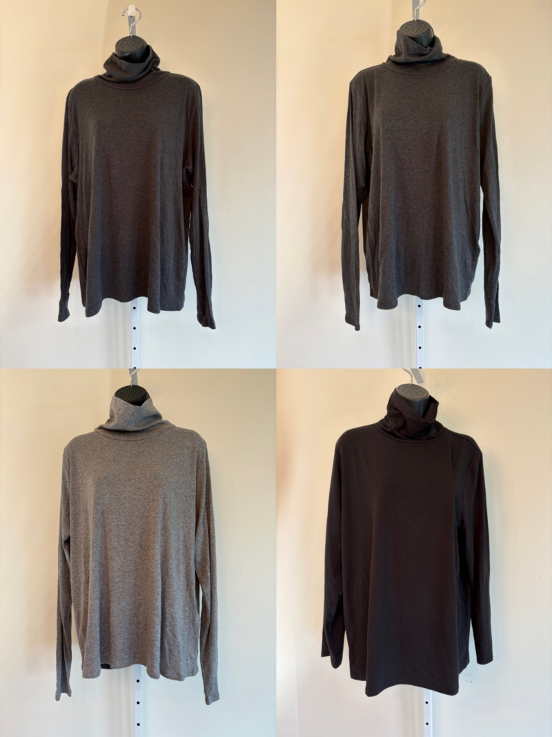 4 turtlenecks in dark neutral colors from Eileen Fisher for transitional fall season. All measure between 24" - 25" pit to pit and all are extremely soft to the touch. 2 identical dark grey turtlenecks from Eileen Fisher. This particular shade of grey looks great with black, white, and a host of other colors (our client had A LOT of this color). One shirt is new with tag. Both are organic cotton/Tencel Lyocell blend. Size tag on the older one says 1X. Size tag on the new one says XL. Light grey turtleneck is also an organic cotton/Tencel Lyocell blend. Size tag says 1X. Black turtleneck is a Tencel Lyocell/elastane blend. Size tag says 1X.