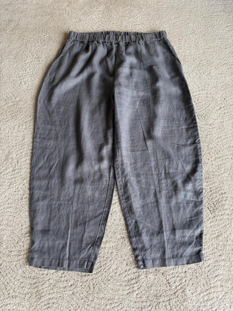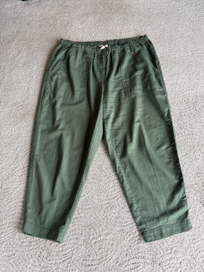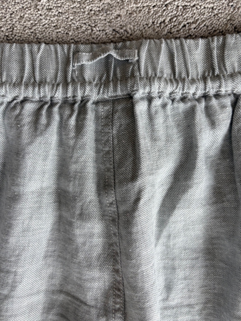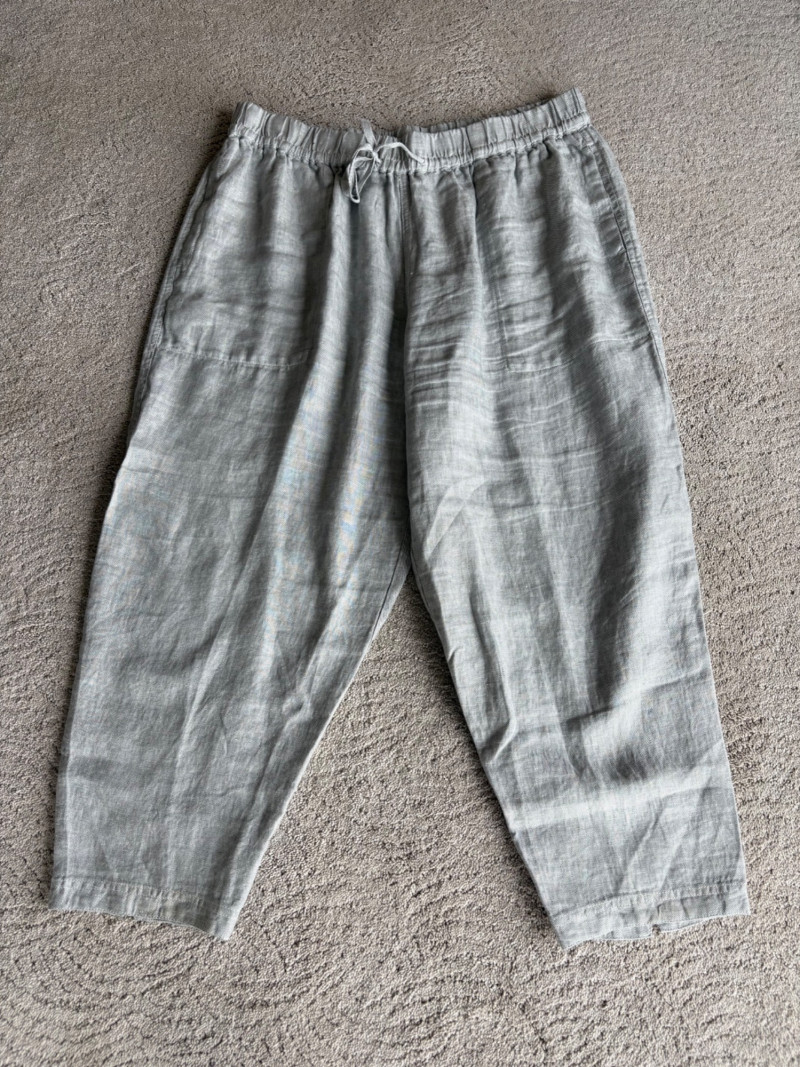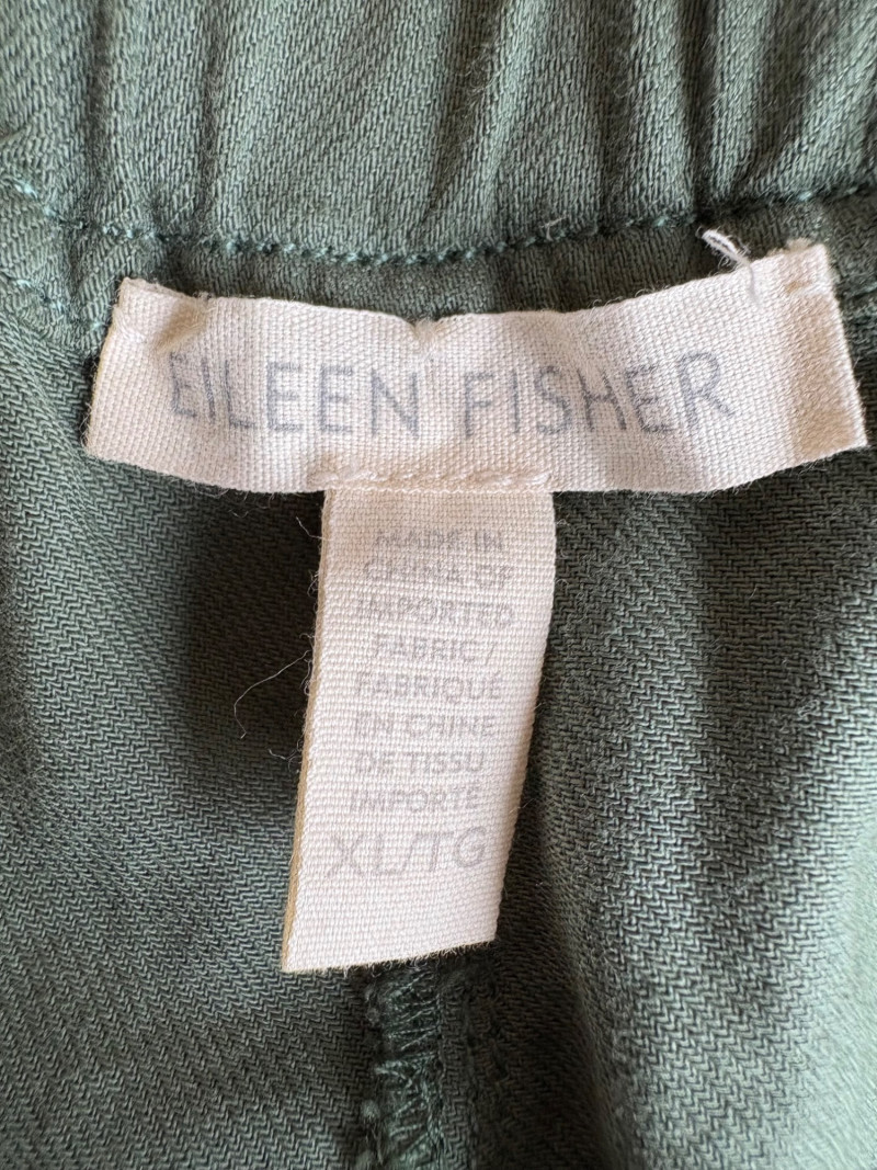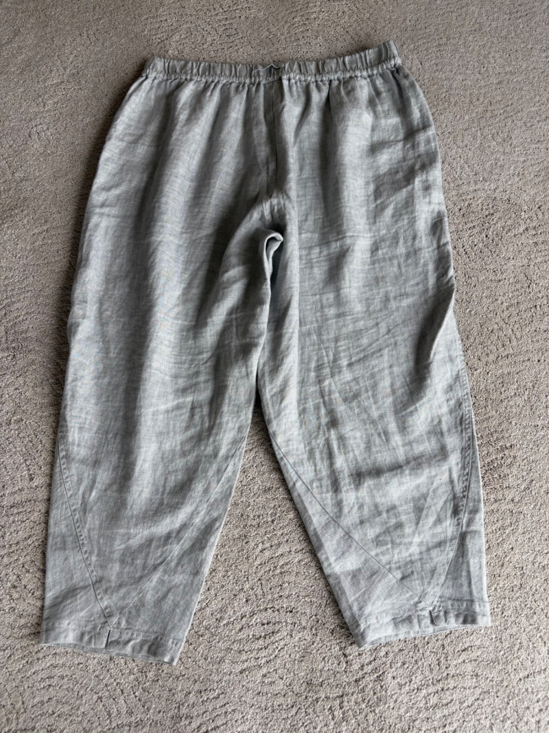 Natural fibers that fall beautifully from Eileen Fisher & Poetry. Poetry blue-grey linen pants have elasticated waistband, set-in front pockets, and generously cut legs. Measure 18" side to side at waist. Size tag says 16. Eileen Fisher green lightweight cotton pants have elasticated waistband, fly front, back welted pocket, and front patch pockets. Measure 18" side to side at waist. Size tag says XL. Poetry grey/white linen twill pants have elasticated waist with drawstring, in-seam side pockets with top-stitching, and generous lantern-cut legs. Measure 18" side to side at waist. Size tag says 16.