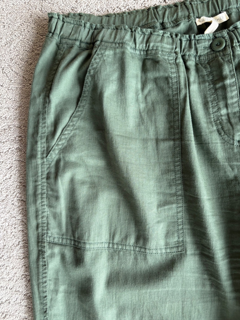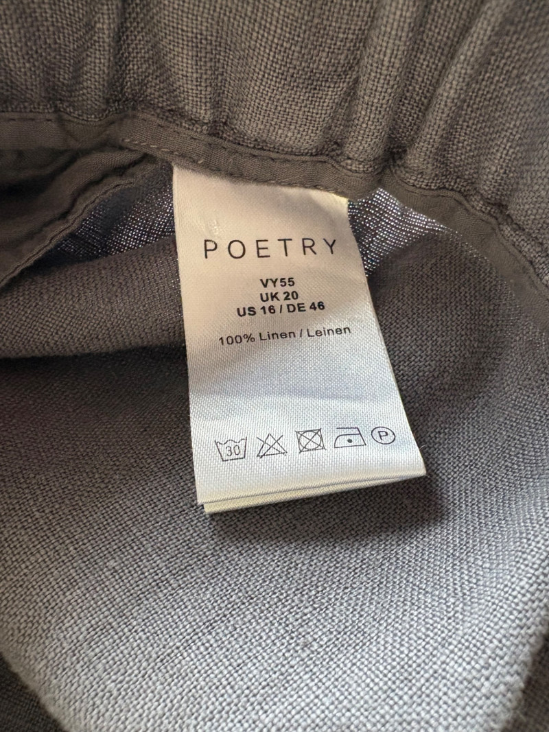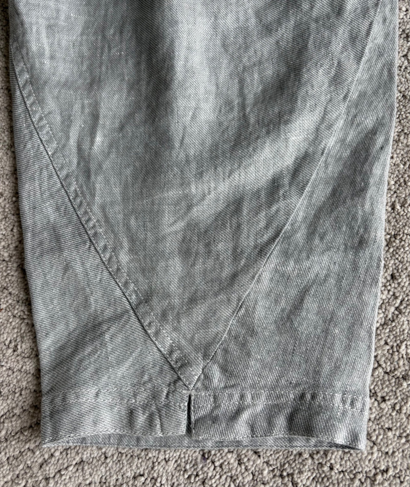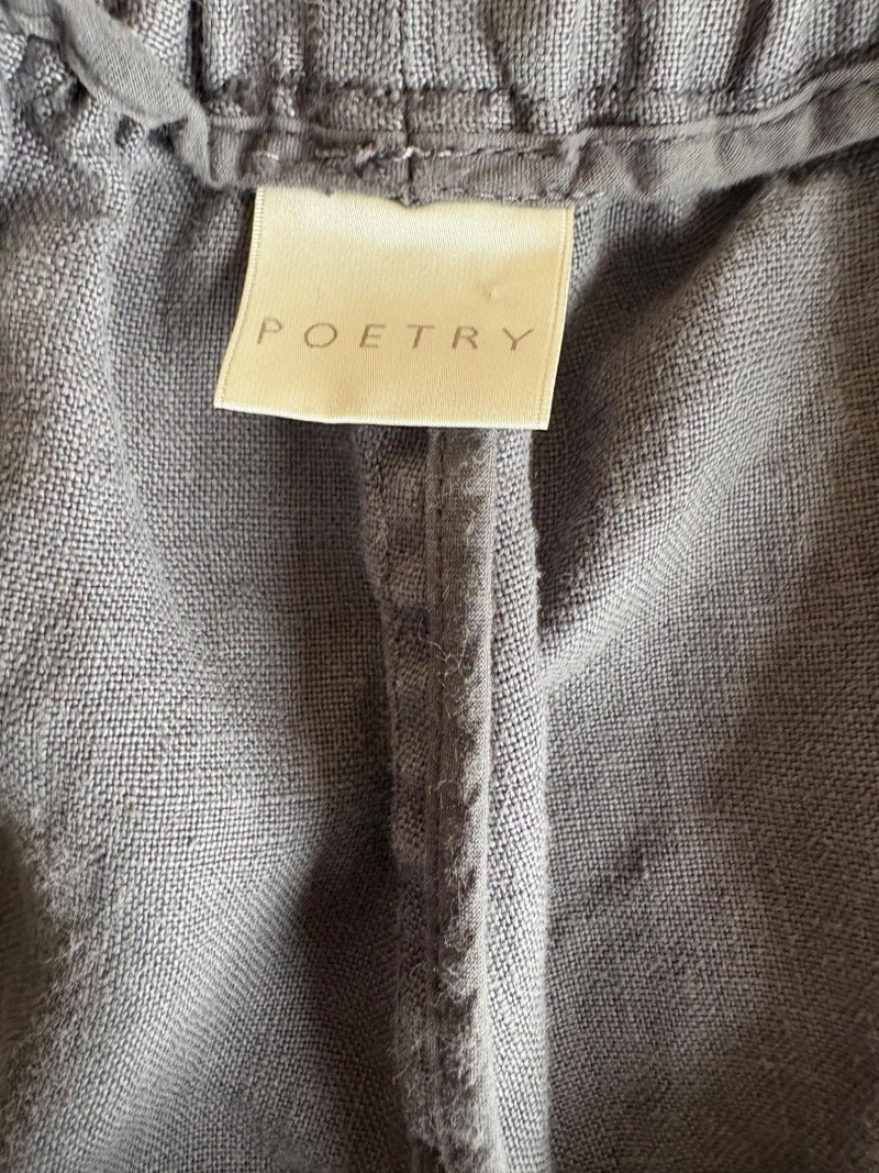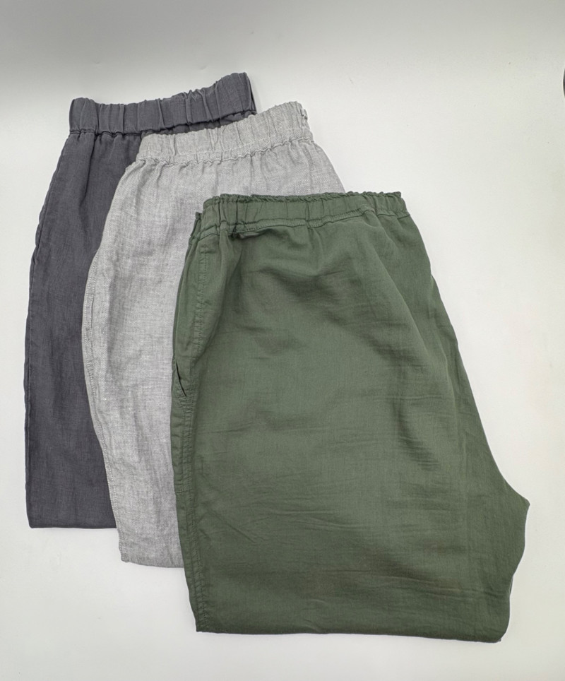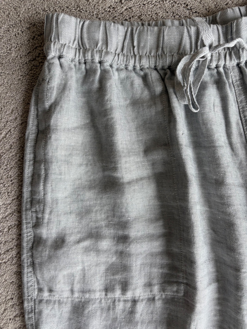 Natural fibers that fall beautifully from Eileen Fisher & Poetry. Poetry blue-grey linen pants have elasticated waistband, set-in front pockets, and generously cut legs. Measure 18" side to side at waist. Size tag says 16. Eileen Fisher green lightweight cotton pants have elasticated waistband, fly front, back welted pocket, and front patch pockets. Measure 18" side to side at waist. Size tag says XL. Poetry grey/white linen twill pants have elasticated waist with drawstring, in-seam side pockets with top-stitching, and generous lantern-cut legs. Measure 18" side to side at waist. Size tag says 16.