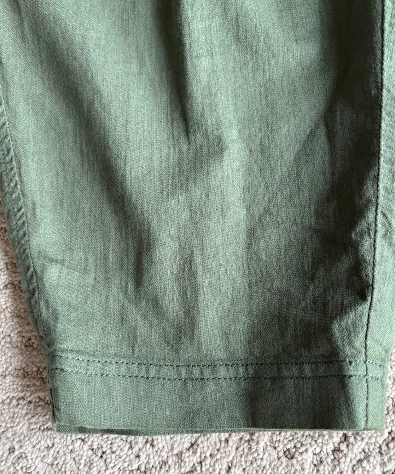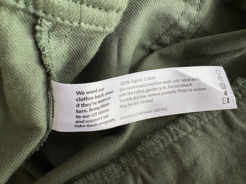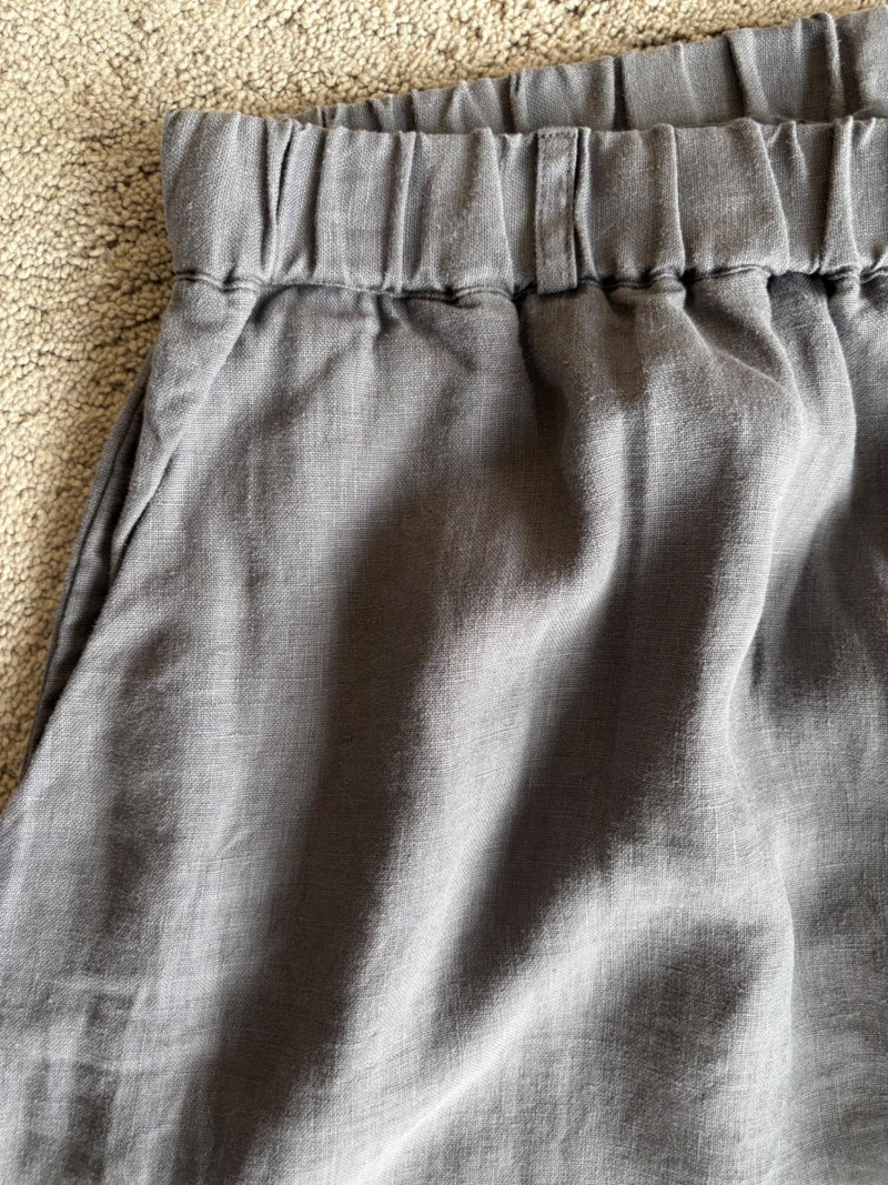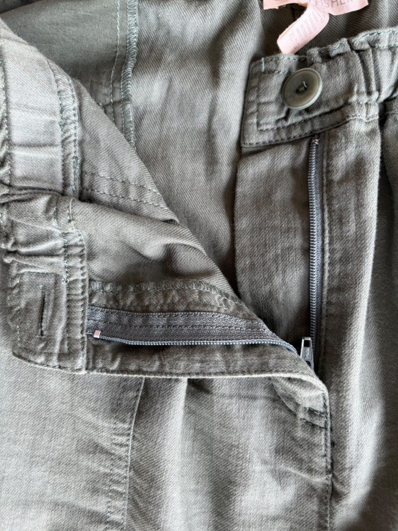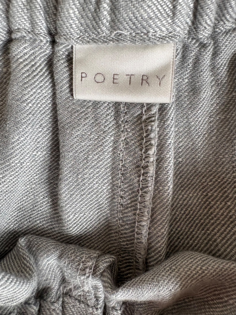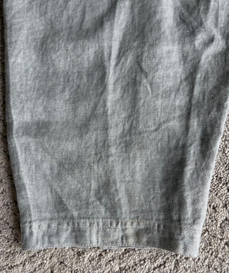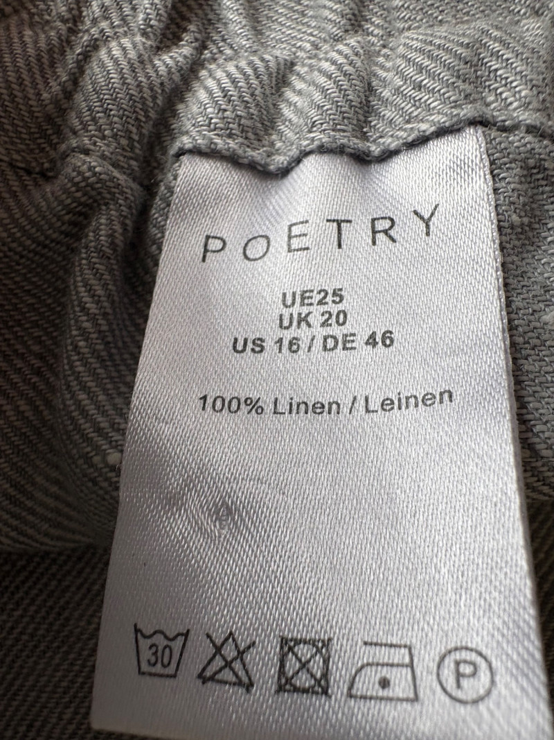 Natural fibers that fall beautifully from Eileen Fisher & Poetry. Poetry blue-grey linen pants have elasticated waistband, set-in front pockets, and generously cut legs. Measure 18" side to side at waist. Size tag says 16. Eileen Fisher green lightweight cotton pants have elasticated waistband, fly front, back welted pocket, and front patch pockets. Measure 18" side to side at waist. Size tag says XL. Poetry grey/white linen twill pants have elasticated waist with drawstring, in-seam side pockets with top-stitching, and generous lantern-cut legs. Measure 18" side to side at waist. Size tag says 16.