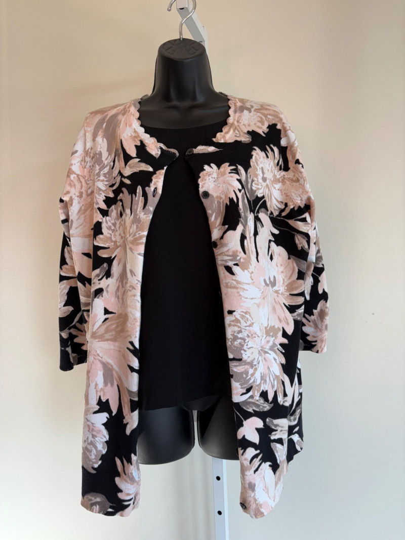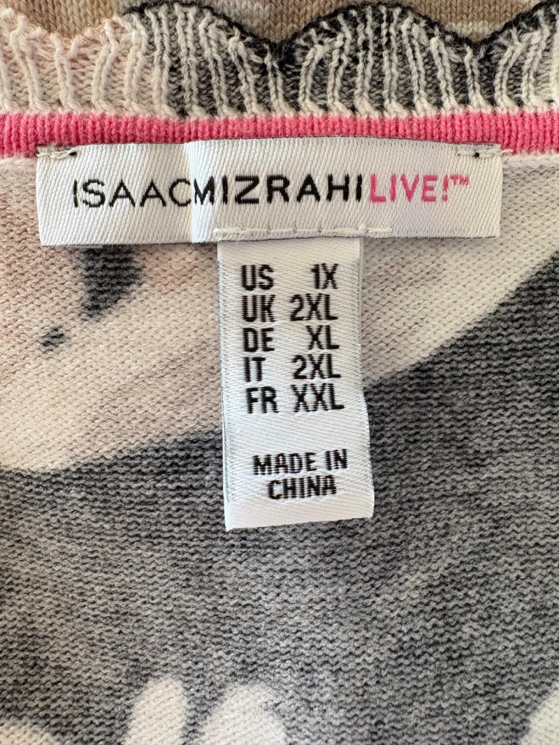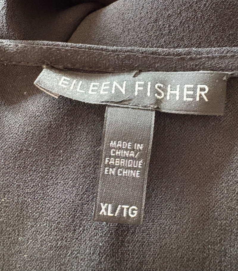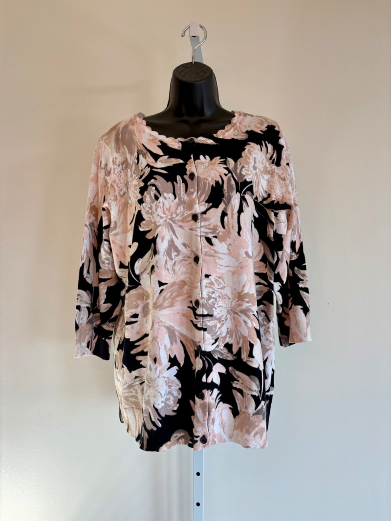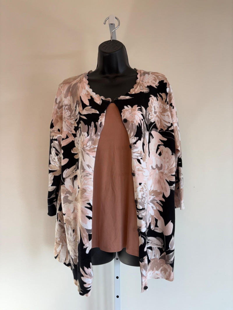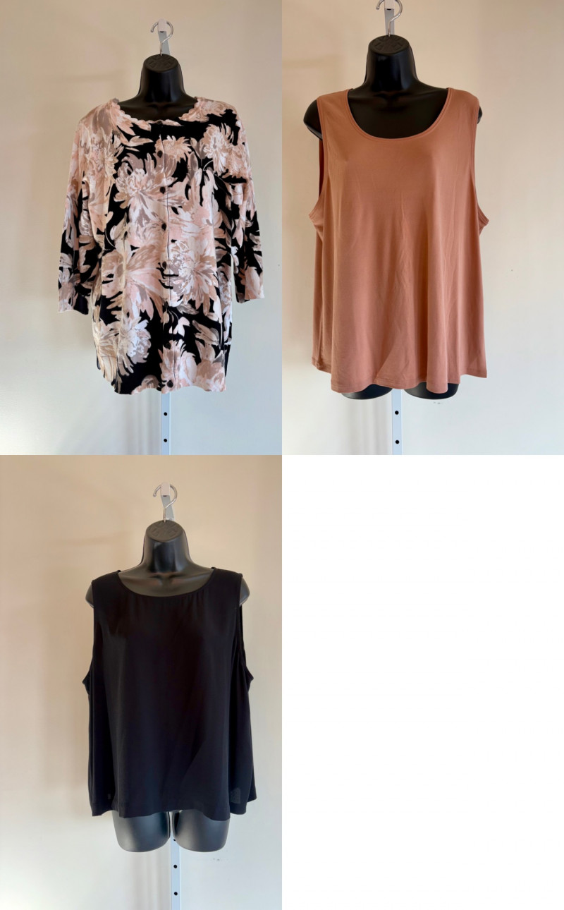 3 coordinating separates from Eileen Fisher & Isaac Mizrahi. Pink shell has curved neckline. 100% silk. Measures 21.5" pit to pit and 24.5" from back neckline to hem. Size tag says XL. Black shell has curved neckline, button back neck closure, and small split hem. 100% silk. Measures 22" pit to pit and 23" from back neckline to hem. Size tag says XL. Pink, taupe, black, and white cardigan sweater from Isaac Mizrahi has scalloped rib trim on round neckline, 8 button front closure, and ribbing on sleeve ends and hem. Cotton/nylon blend. Measures 23" pit to pit and 25" from back neckline to hem. Size tag says 1X.