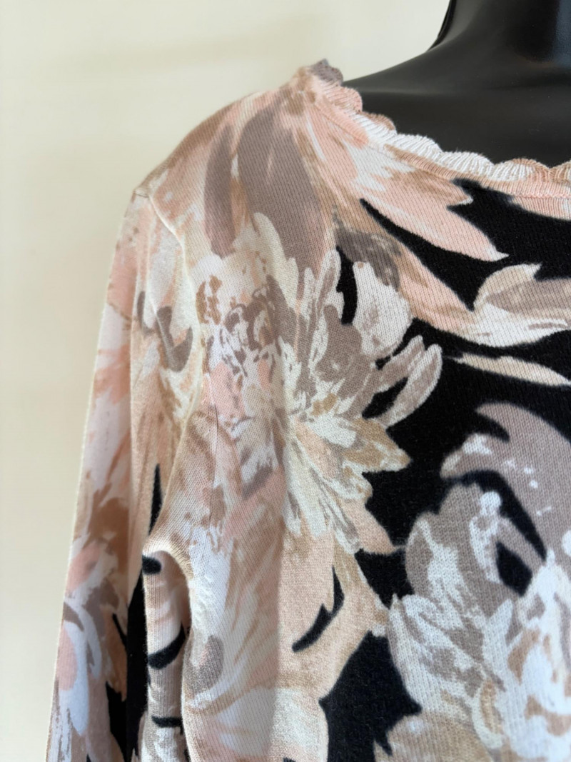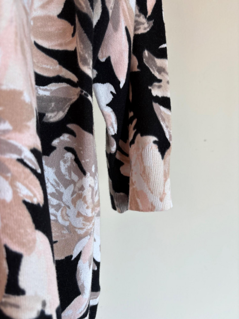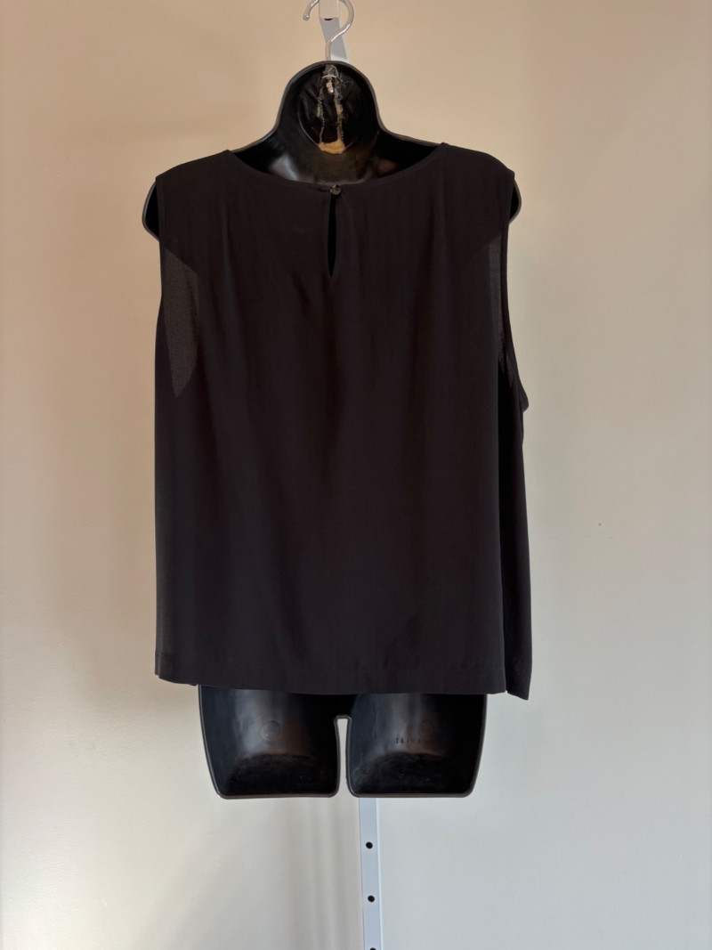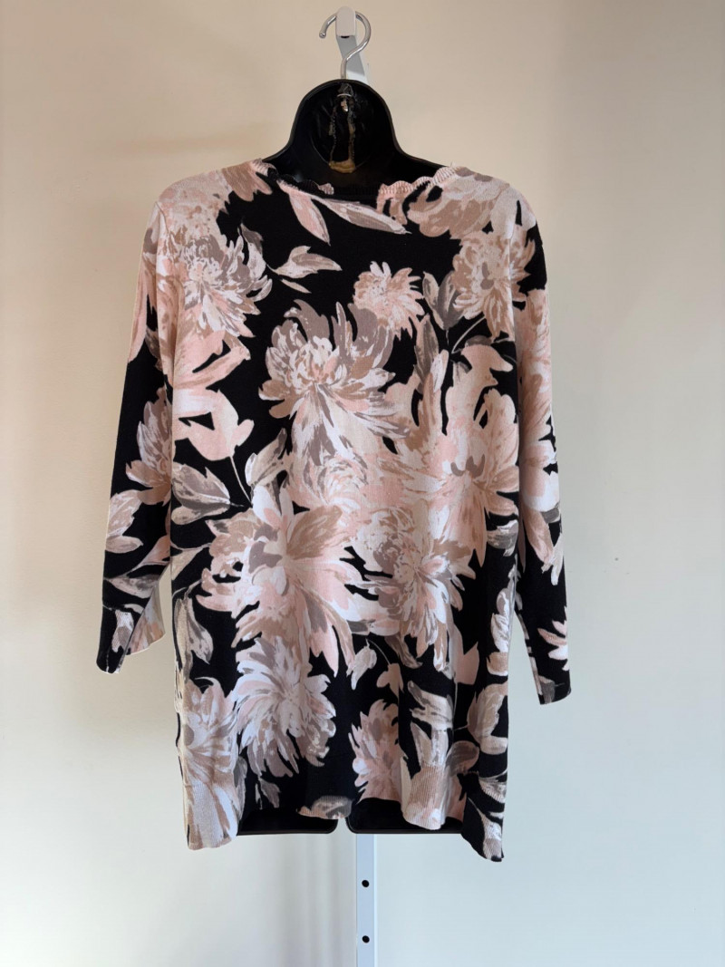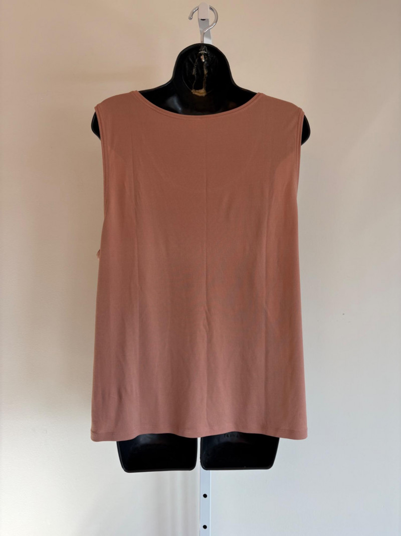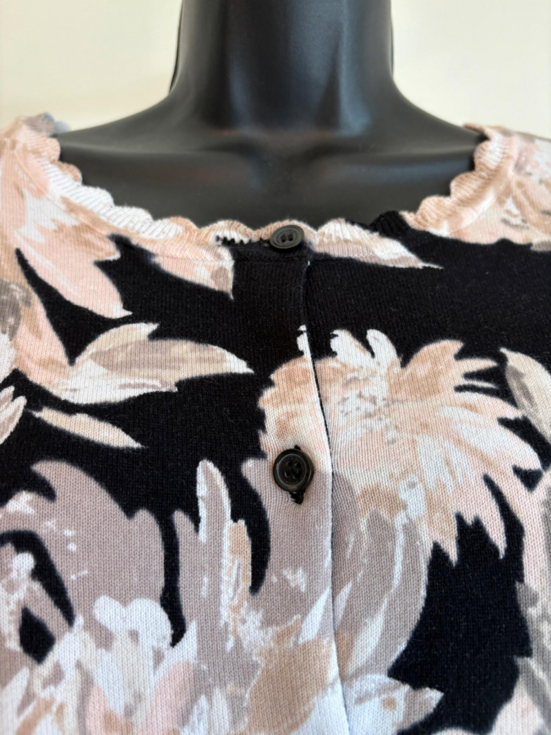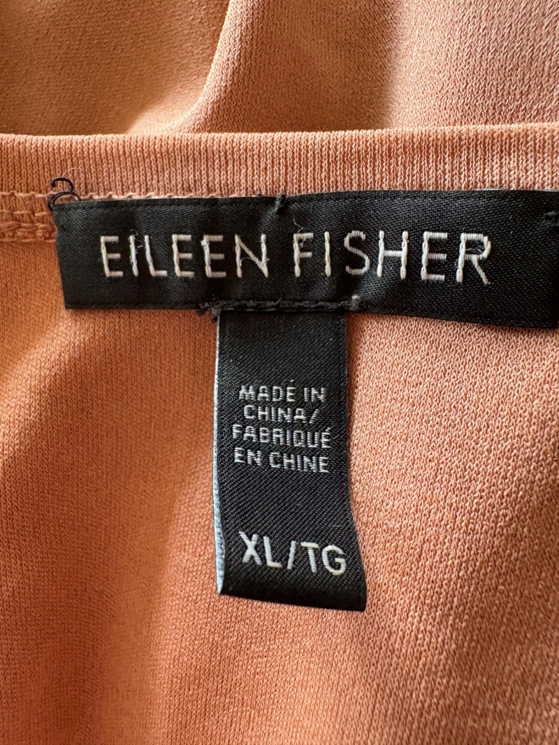 3 coordinating separates from Eileen Fisher & Isaac Mizrahi. Pink shell has curved neckline. 100% silk. Measures 21.5" pit to pit and 24.5" from back neckline to hem. Size tag says XL. Black shell has curved neckline, button back neck closure, and small split hem. 100% silk. Measures 22" pit to pit and 23" from back neckline to hem. Size tag says XL. Pink, taupe, black, and white cardigan sweater from Isaac Mizrahi has scalloped rib trim on round neckline, 8 button front closure, and ribbing on sleeve ends and hem. Cotton/nylon blend. Measures 23" pit to pit and 25" from back neckline to hem. Size tag says 1X.
