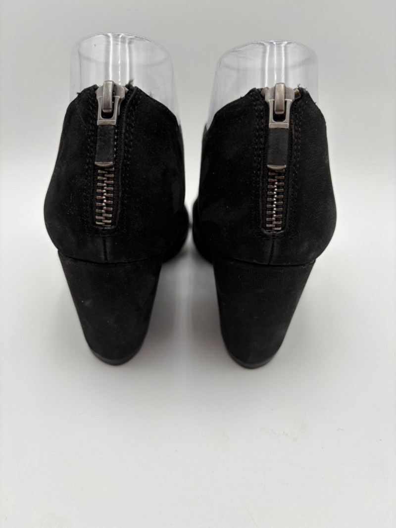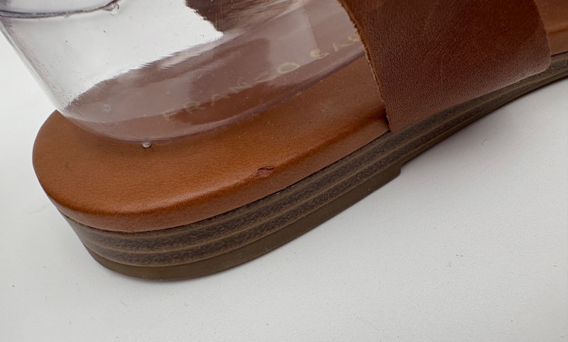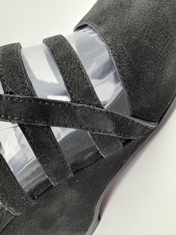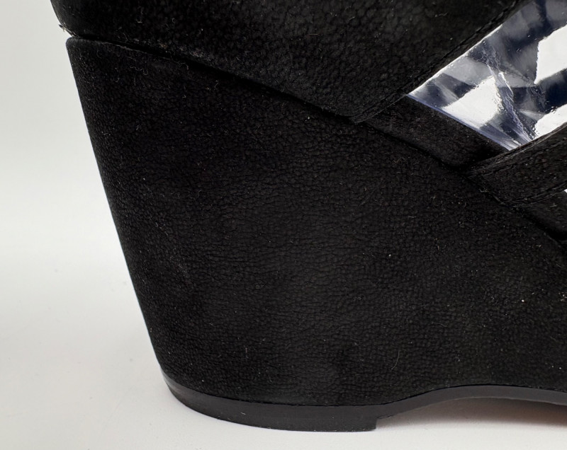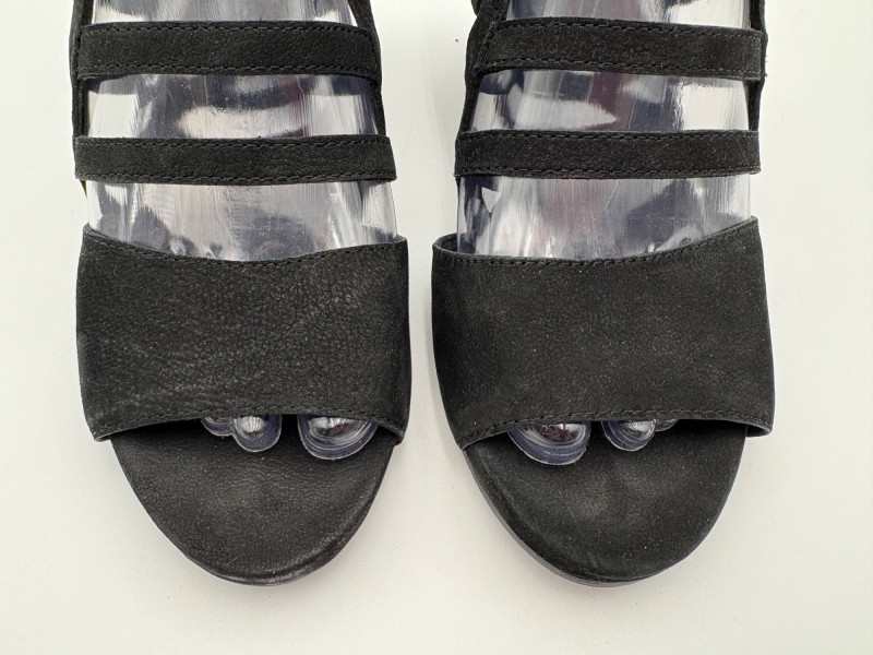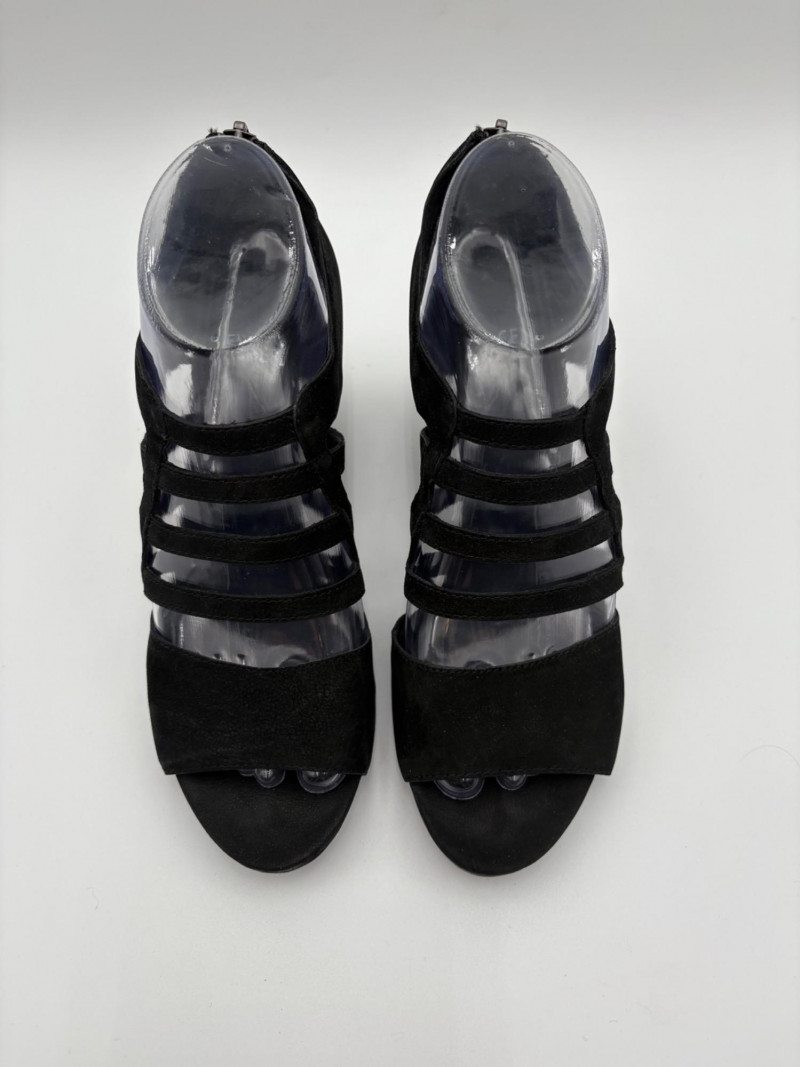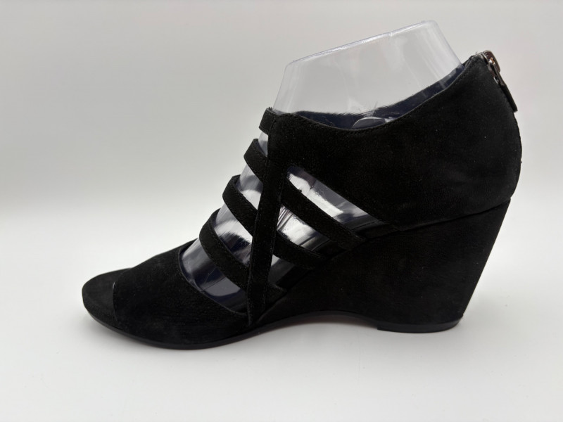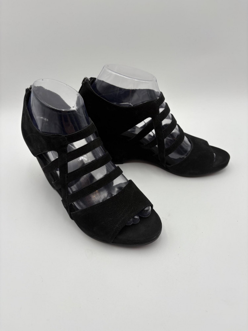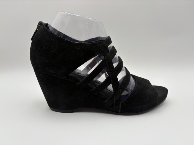 Black strappy sandals in suede with wedge heel, open toe, and back zip heel. Size 7. Franco Sarto brown sandals with low wedge heel, smooth leather uppers, and ankle buckle. Size 7.