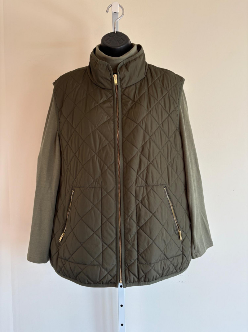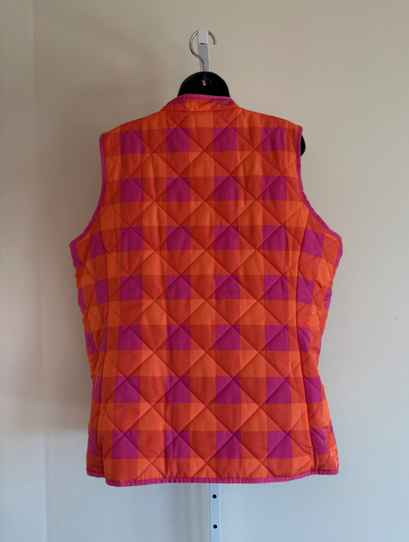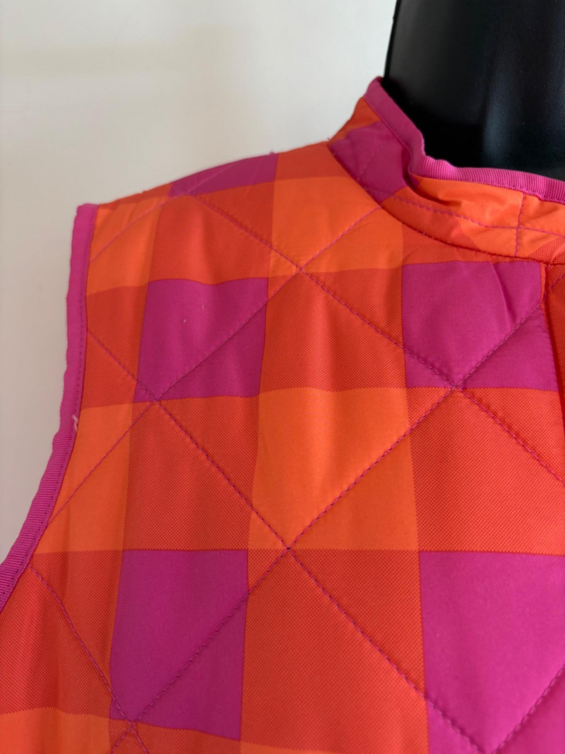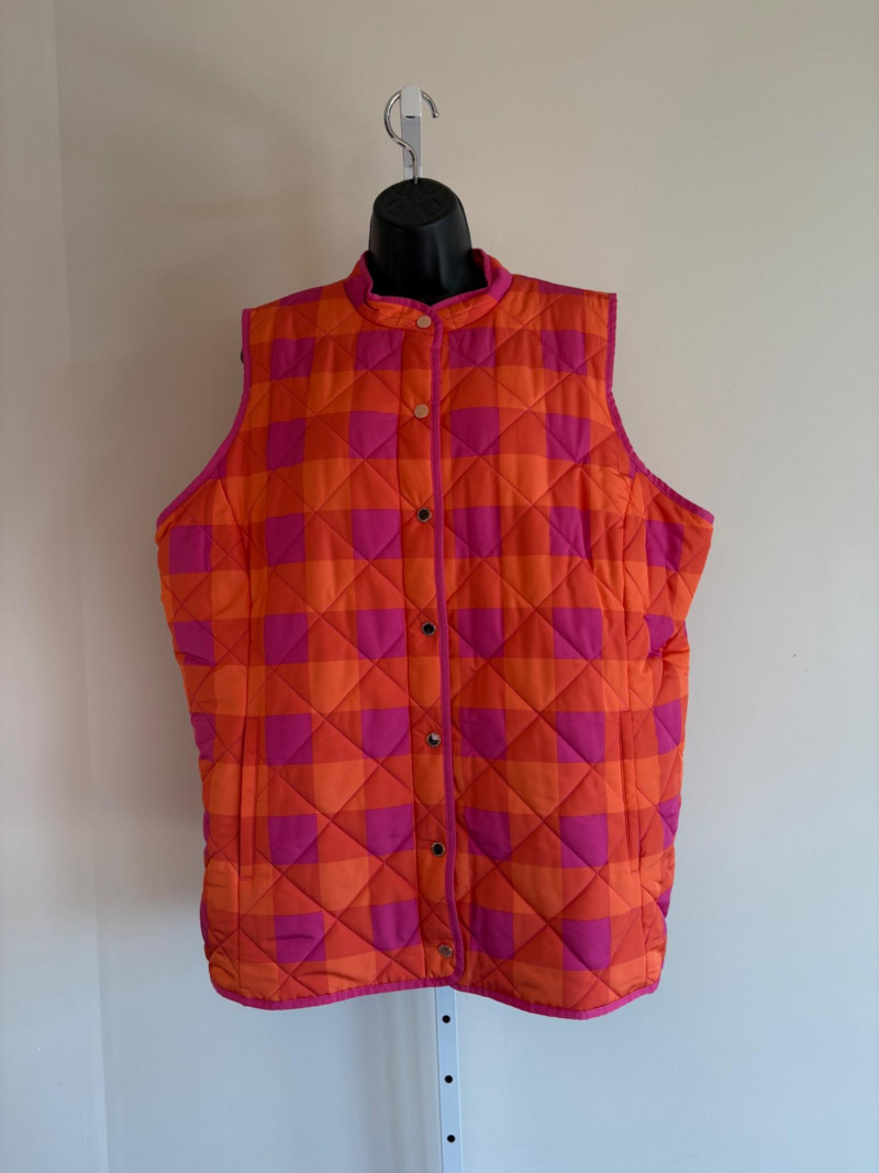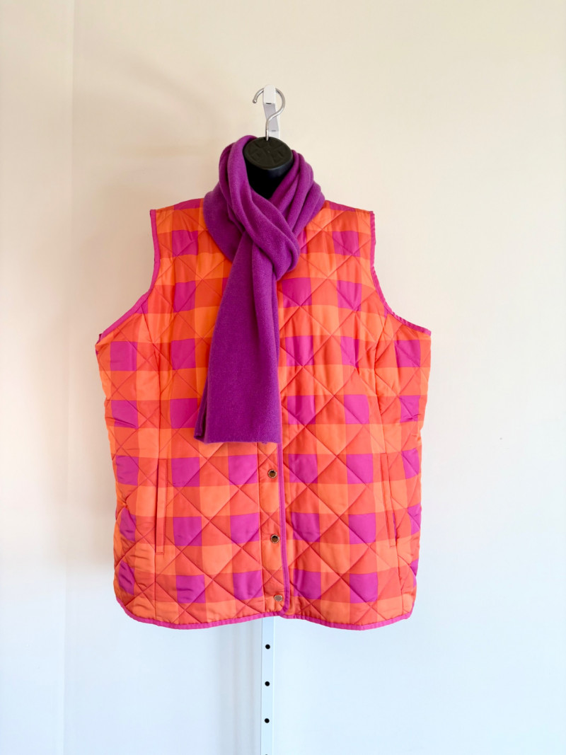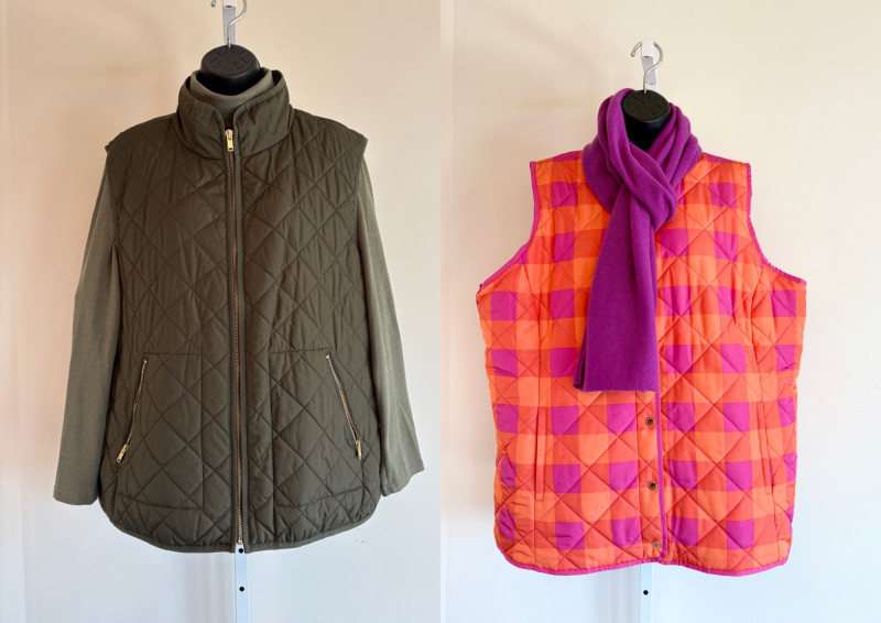 2 vests and coordinates from various makers. Old Navy quilted polyester vest has gold zippers, front angled pockets, and gold zip front closure with green tape trim on armholes and edges. Measures 26" pit to pit and 26" from back neckline to hem. Size tag says XXL. Paired with almost same shade of green turtleneck from Karen Scott. 100% stretchy cotton knit. Measures 22" pit to pit and 24" from neckline to hem. Size tag says PXL. Pink and orange plaid vest with diamond quilting from Isaac Mizrahi has princess seaming, welted pockets on the front, ribbon tape trim along the armholes/edges, inside hidden pocket, and seven gold snaps for closure down the front. Lined in pink. Measures 26" pit to pit and 28" from back neckline to hem. Size tag 1X. Paired with a pink knit sweater scarf from Garnet Hill. Measures 11“ x 72“. 100% cashmere.