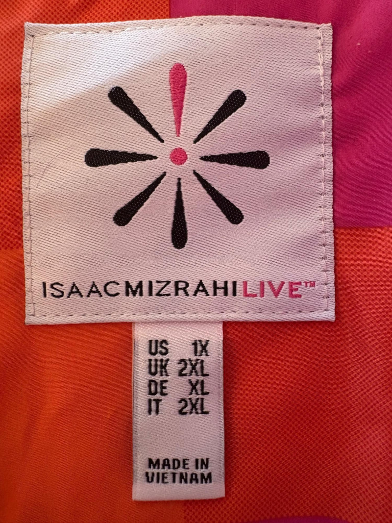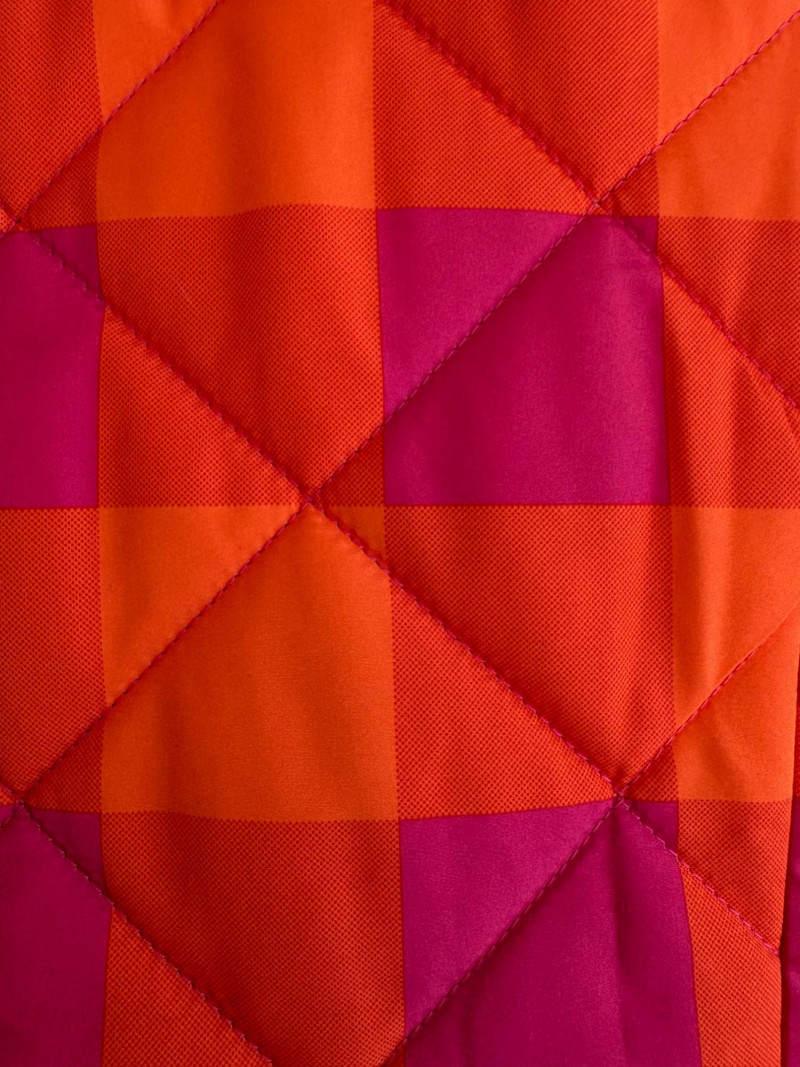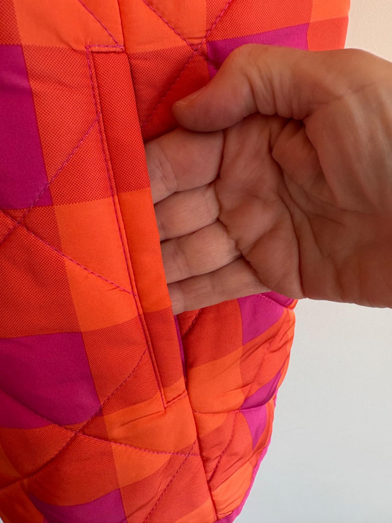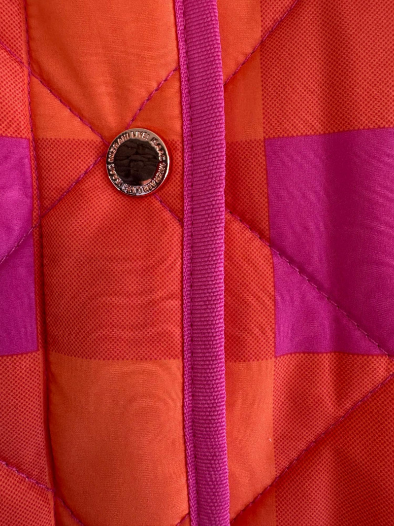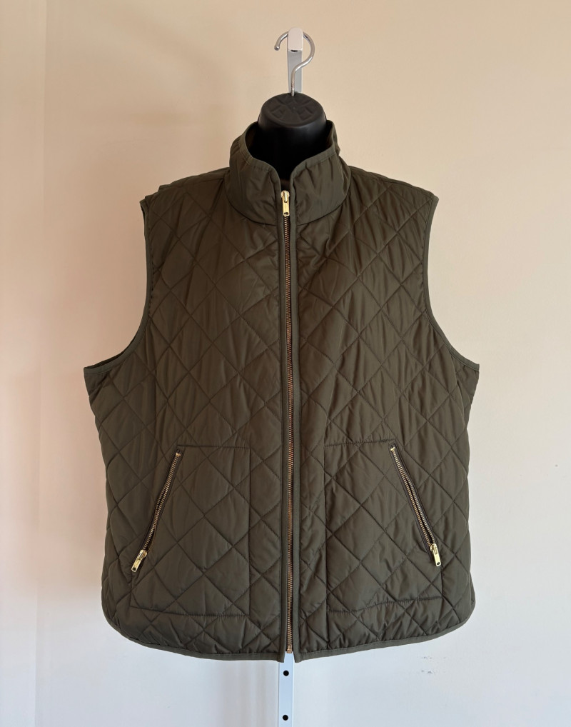 2 vests and coordinates from various makers. Old Navy quilted polyester vest has gold zippers, front angled pockets, and gold zip front closure with green tape trim on armholes and edges. Measures 26" pit to pit and 26" from back neckline to hem. Size tag says XXL. Paired with almost same shade of green turtleneck from Karen Scott. 100% stretchy cotton knit. Measures 22" pit to pit and 24" from neckline to hem. Size tag says PXL. Pink and orange plaid vest with diamond quilting from Isaac Mizrahi has princess seaming, welted pockets on the front, ribbon tape trim along the armholes/edges, inside hidden pocket, and seven gold snaps for closure down the front. Lined in pink. Measures 26" pit to pit and 28" from back neckline to hem. Size tag 1X. Paired with a pink knit sweater scarf from Garnet Hill. Measures 11“ x 72“. 100% cashmere.