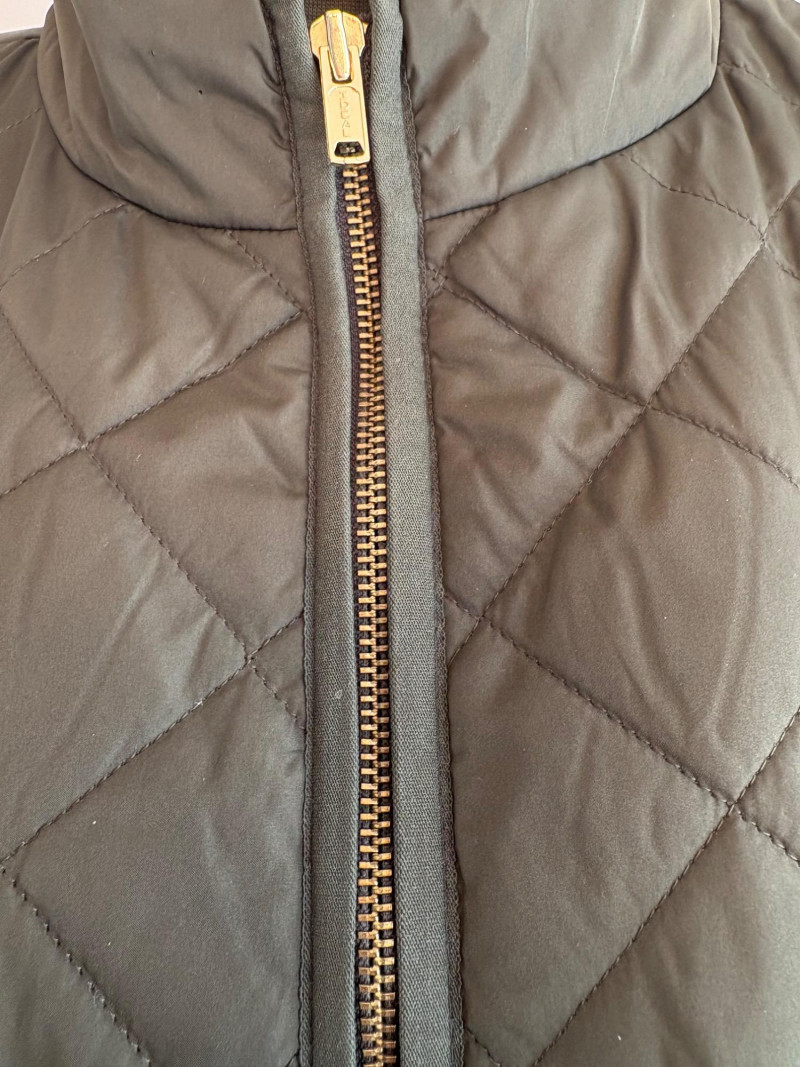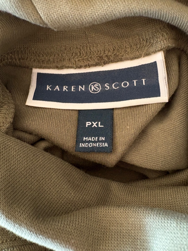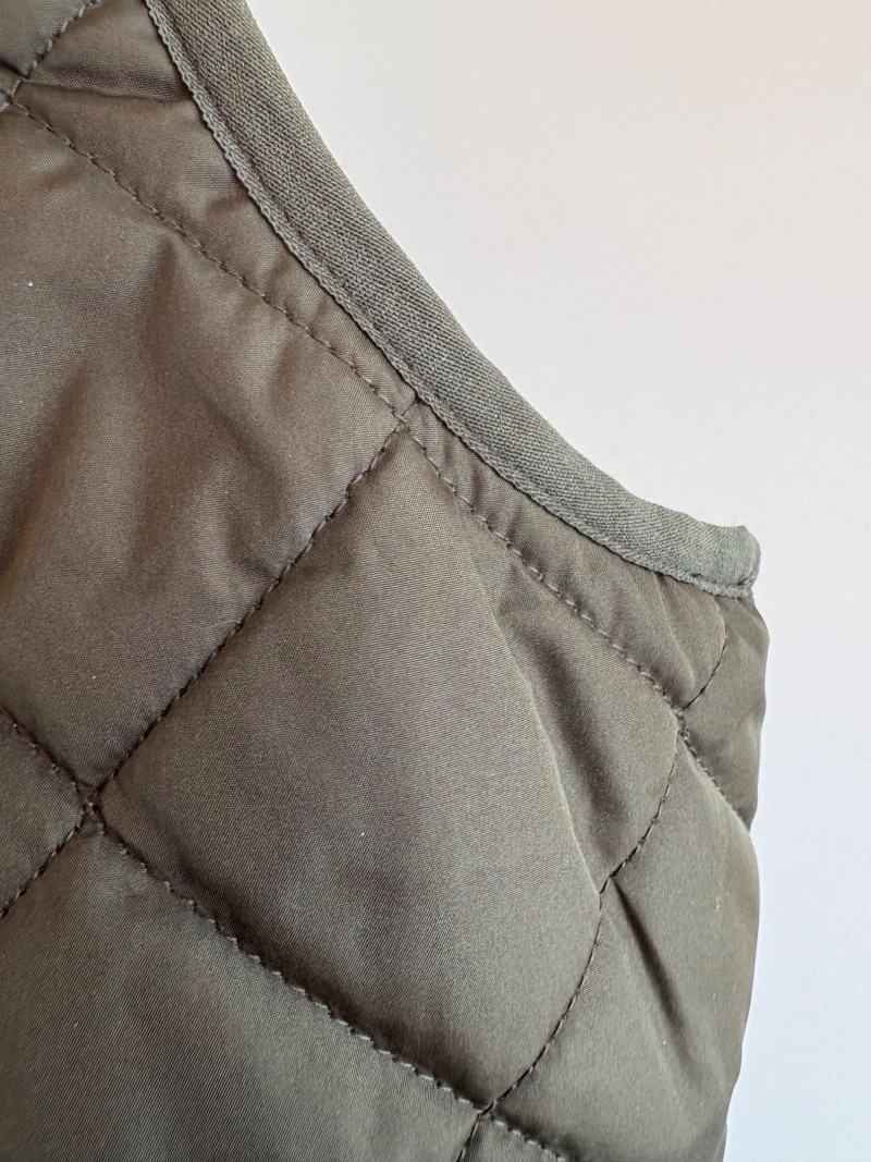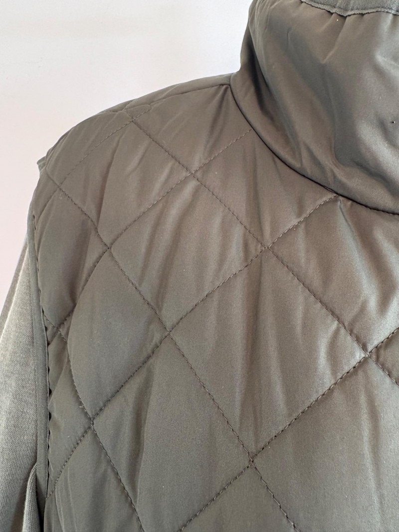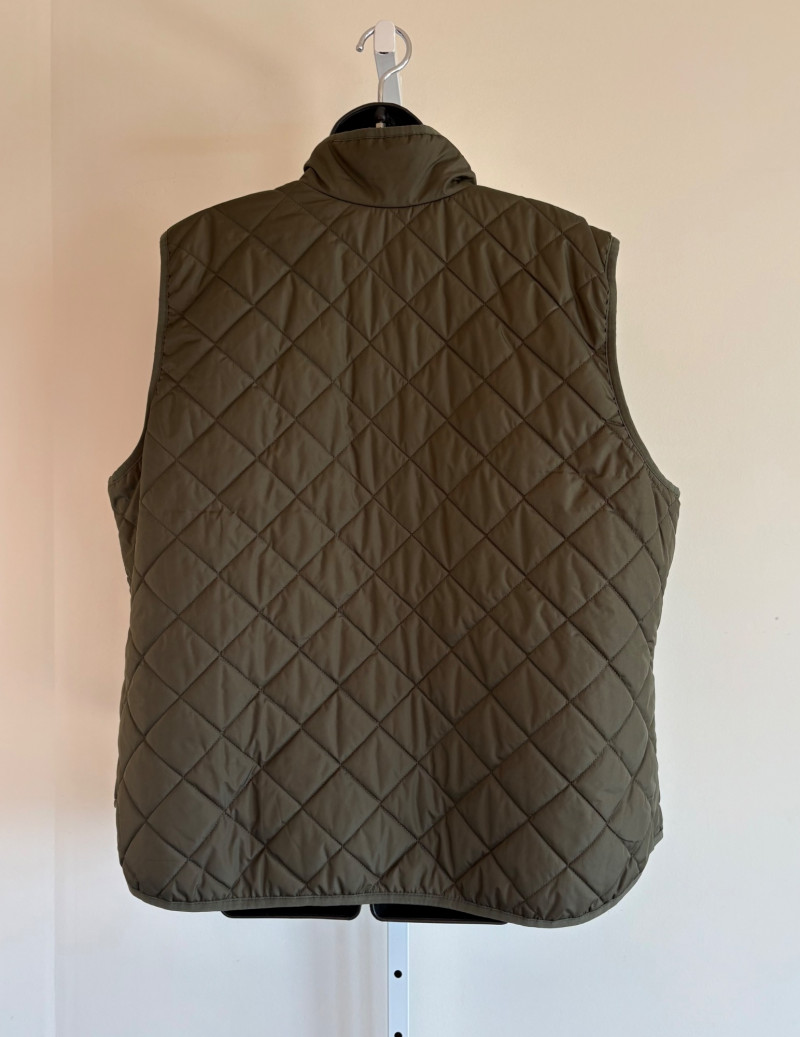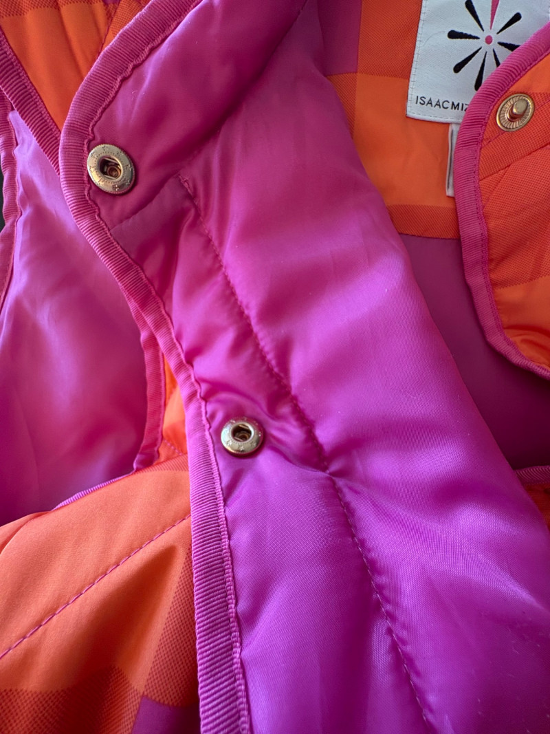 2 vests and coordinates from various makers. Old Navy quilted polyester vest has gold zippers, front angled pockets, and gold zip front closure with green tape trim on armholes and edges. Measures 26" pit to pit and 26" from back neckline to hem. Size tag says XXL. Paired with almost same shade of green turtleneck from Karen Scott. 100% stretchy cotton knit. Measures 22" pit to pit and 24" from neckline to hem. Size tag says PXL. Pink and orange plaid vest with diamond quilting from Isaac Mizrahi has princess seaming, welted pockets on the front, ribbon tape trim along the armholes/edges, inside hidden pocket, and seven gold snaps for closure down the front. Lined in pink. Measures 26" pit to pit and 28" from back neckline to hem. Size tag 1X. Paired with a pink knit sweater scarf from Garnet Hill. Measures 11“ x 72“. 100% cashmere.