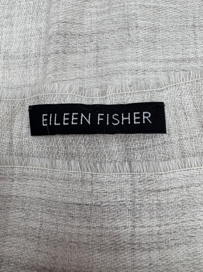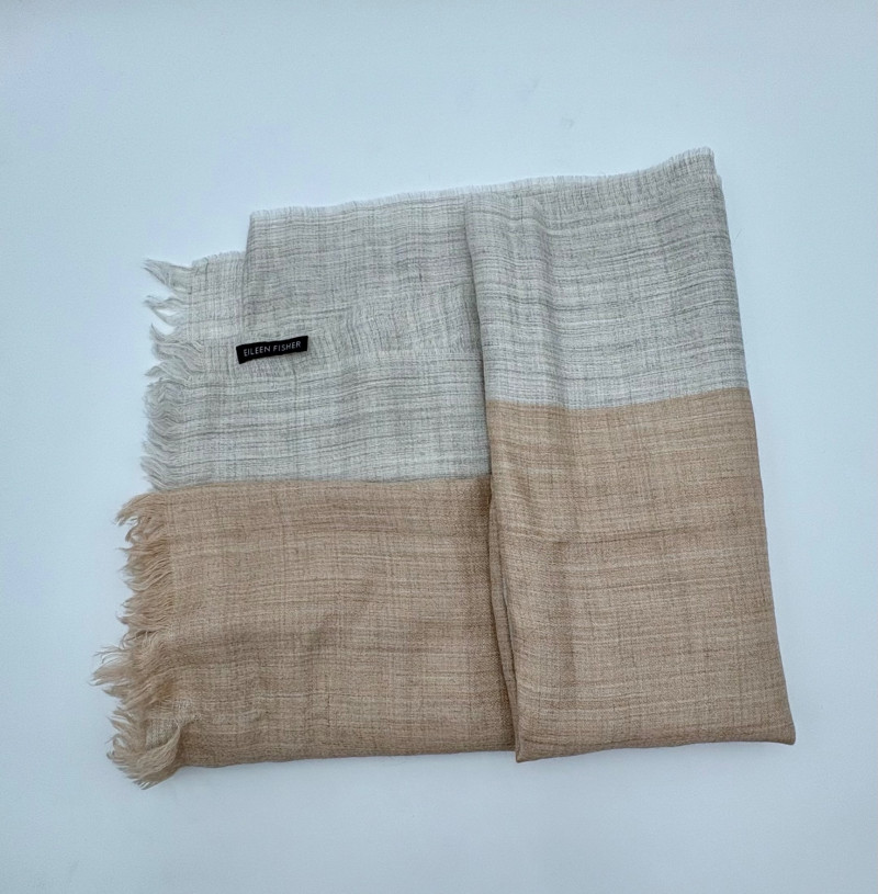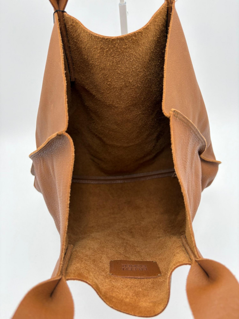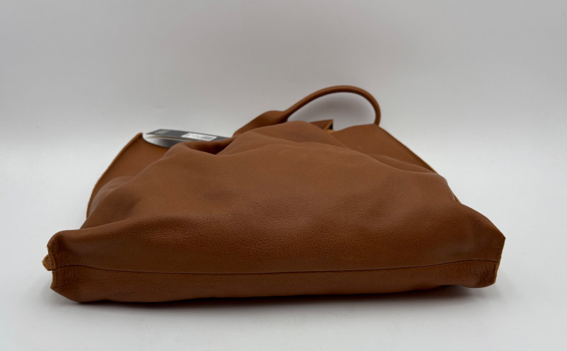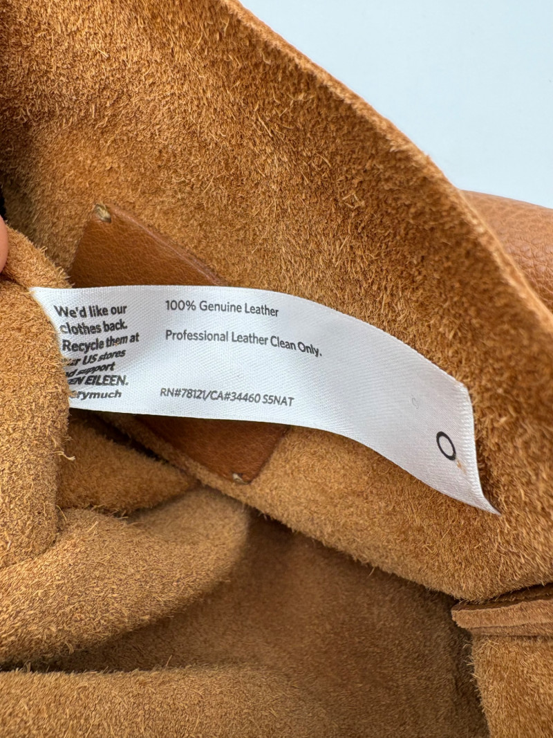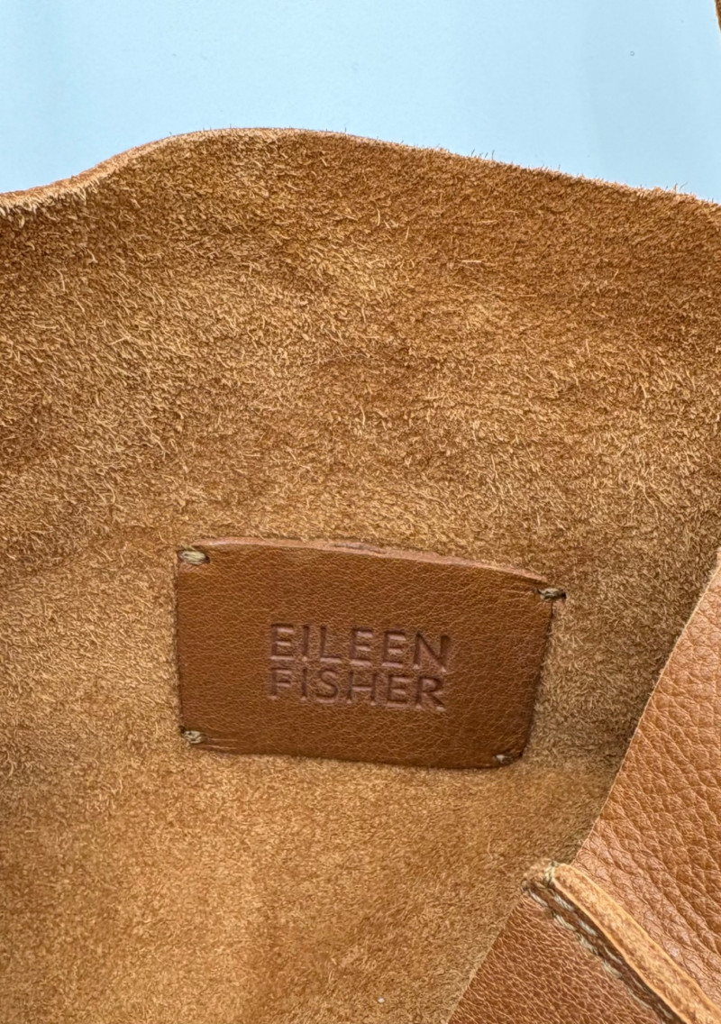 Super soft tan leather small tote - small enough not to be bulky, but large enough for purse contents or a change of clothes. New with tag. Smooth nubuck exterior with natural finish interior, exterior pleated handle attachments, and interior Fisher tag. Note that there are a few extremely minor leather variations - see last 2 photos.. Paired with lovely large Eileen Fisher scarf in broad cream & tan stripes with fringe on short ends. Measures approx. 36" x 80". No fabric tag, but is soft like a natural fiber.