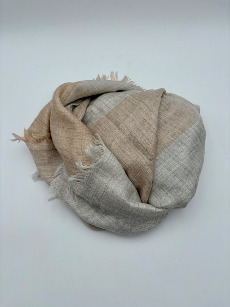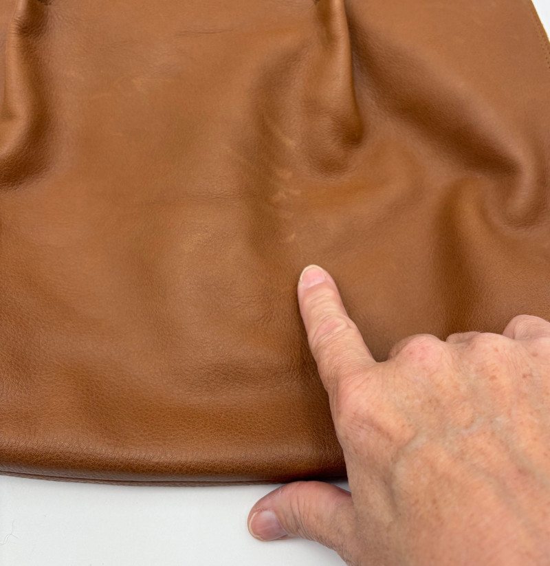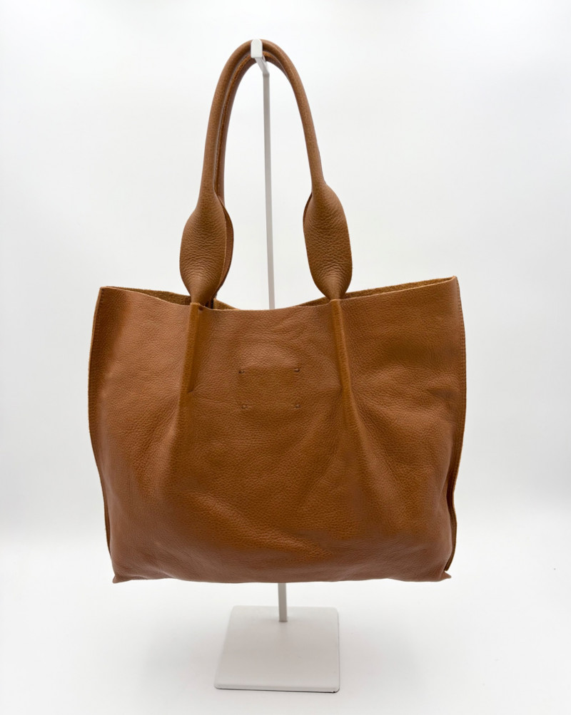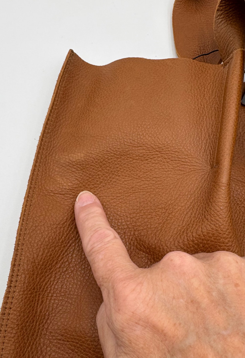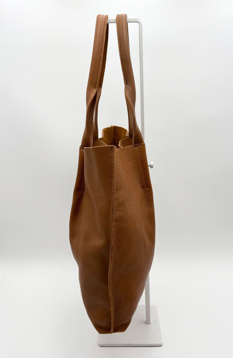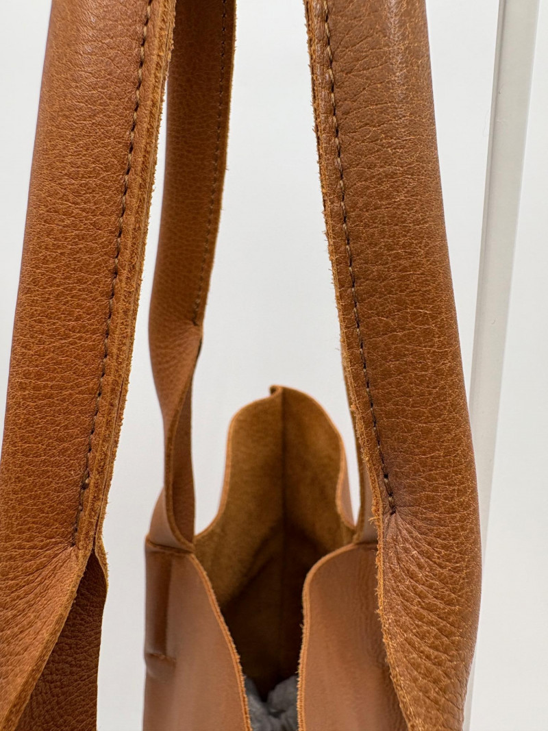Super soft tan leather small tote - small enough not to be bulky, but large enough for purse contents or a change of clothes. New with tag. Smooth nubuck exterior with natural finish interior, exterior pleated handle attachments, and interior Fisher tag. Note that there are a few extremely minor leather variations - see last 2 photos.. Paired with lovely large Eileen Fisher scarf in broad cream & tan stripes with fringe on short ends. Measures approx. 36" x 80". No fabric tag, but is soft like a natural fiber.