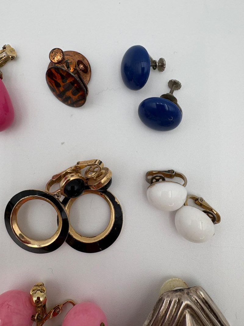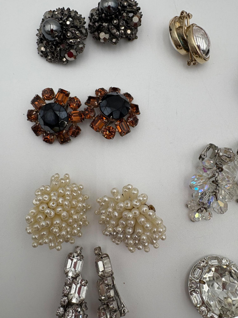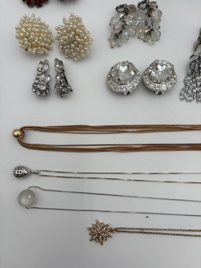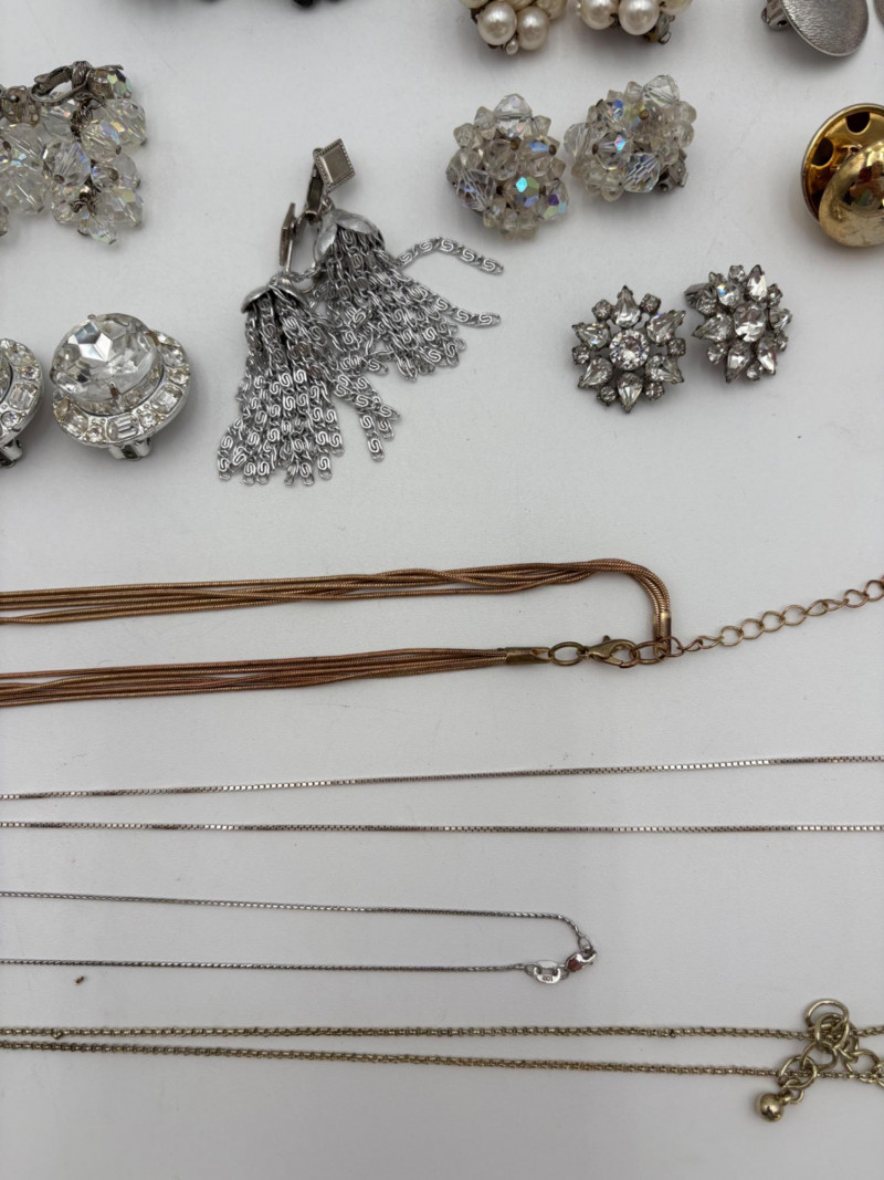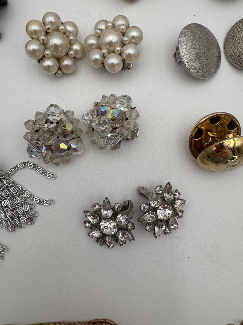 Mixed jewelry lot of clip earrings - some vintage - and a couple of necklaces. What you see is what you get. Please note that while we gave the pieces a look, they were not inspected; nothing egregious was noted during that quick look, however.