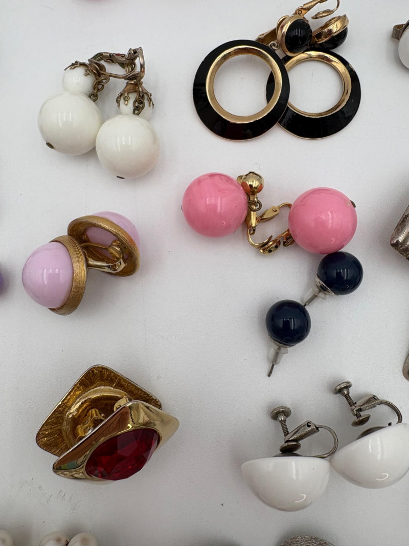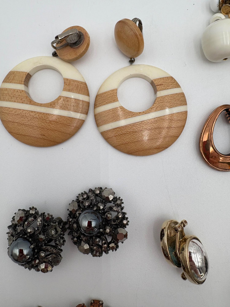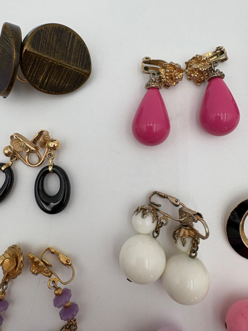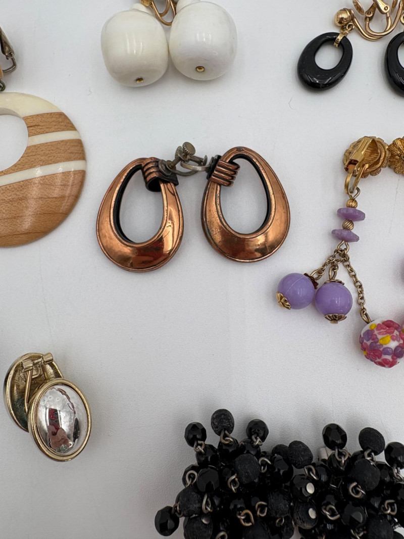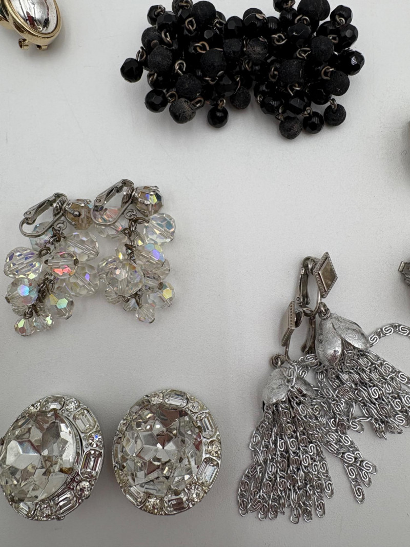 Mixed jewelry lot of clip earrings - some vintage - and a couple of necklaces. What you see is what you get. Please note that while we gave the pieces a look, they were not inspected; nothing egregious was noted during that quick look, however.