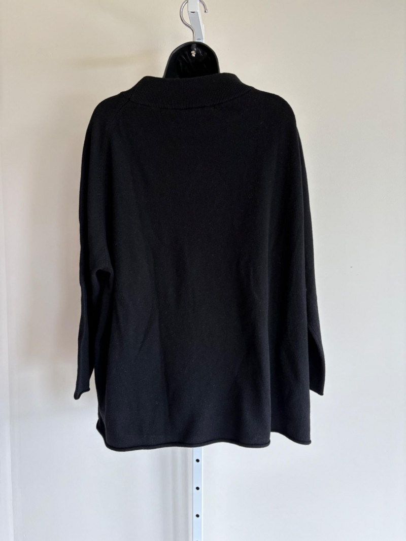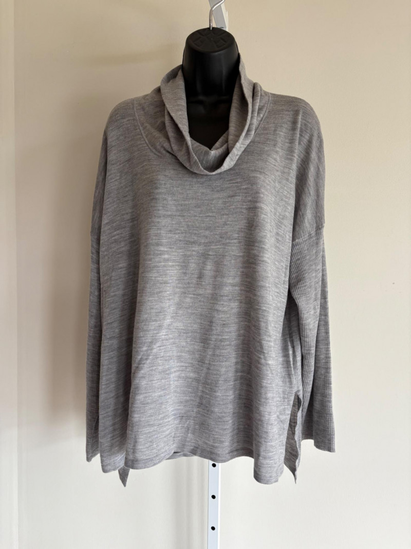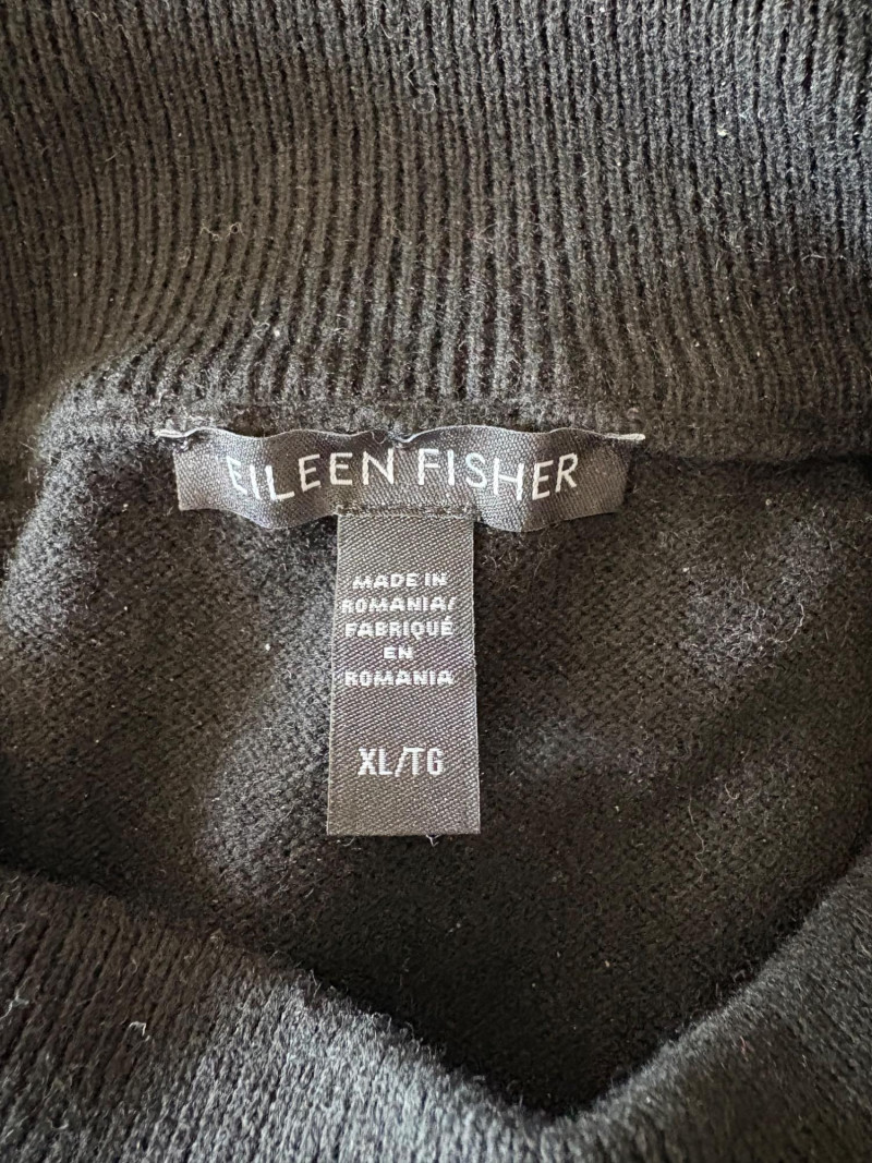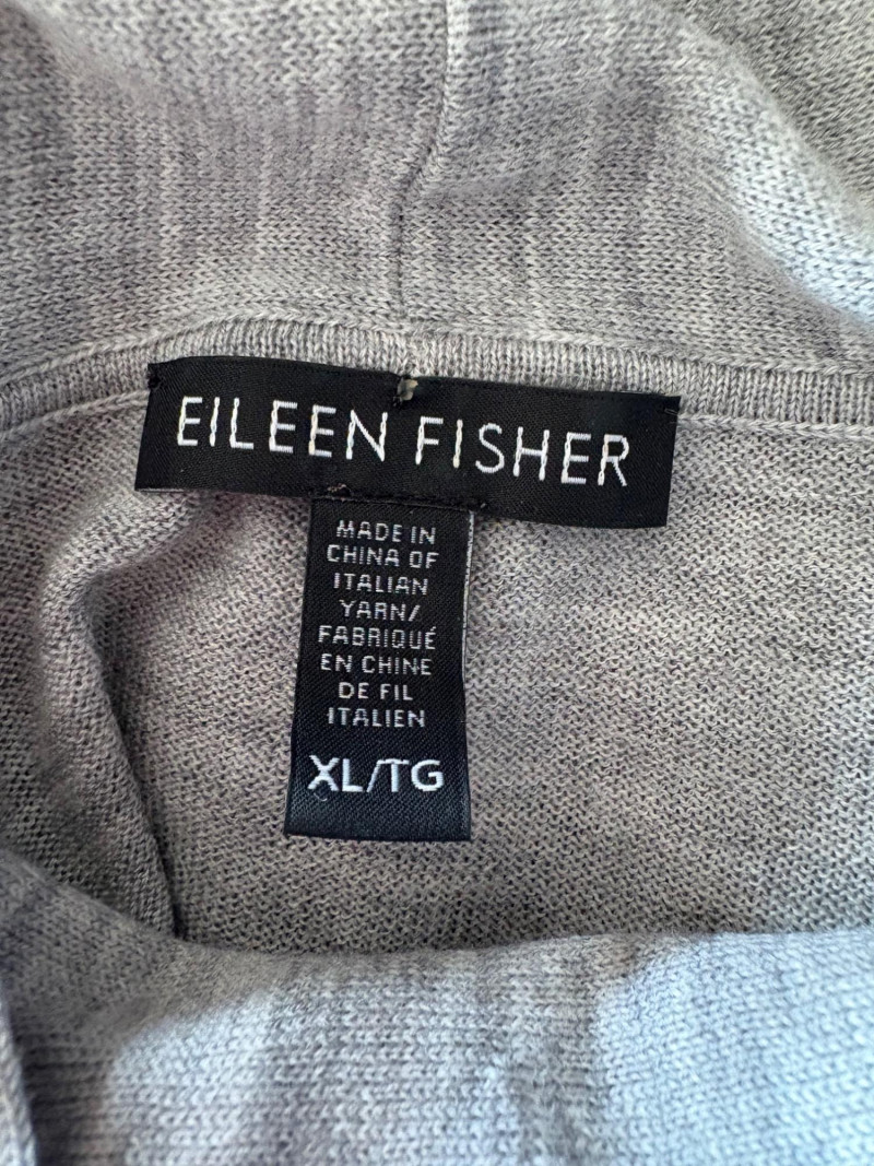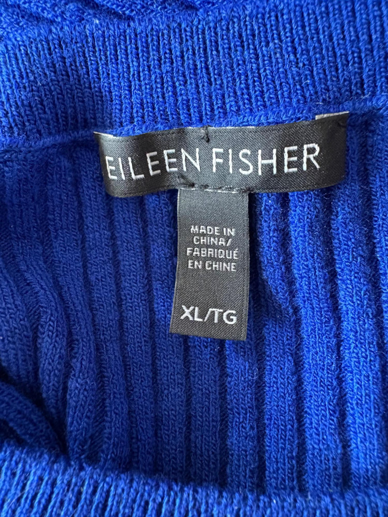 Trio of soft Eileen Fisher sweaters for all occasions. All measure 27" pit to pit and size tags say XL. Black sweater has mock turtleneck, 3/4 raglan sleeves, and rolled cuffs/hem. Recycled cashmere/wool blend. Brilliant blue sweater has dropped shoulder seams, ribbed curved neckline/cuffs/hem, and vertical rib knit pattern. Super soft hand in wool/polyester blend. Grey lightweight sweater has dropped shoulder seams, ribbed sleeves, wide modified funnel neck/cowl, and split hem with back several inches longer than front. 100% merino wool.
