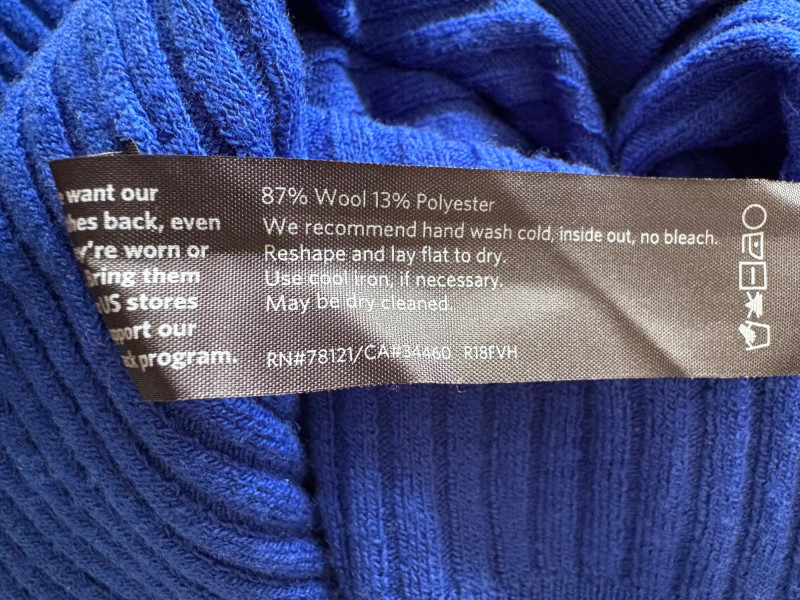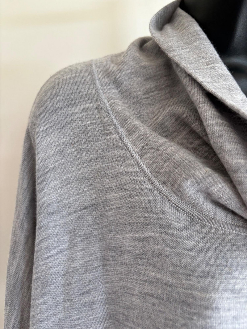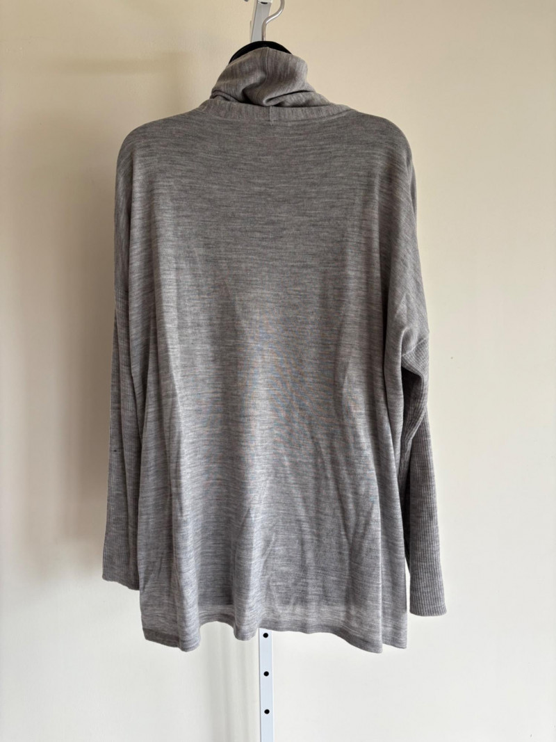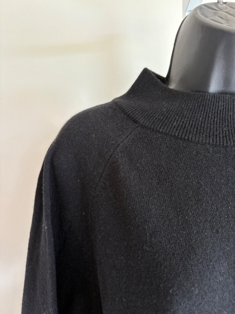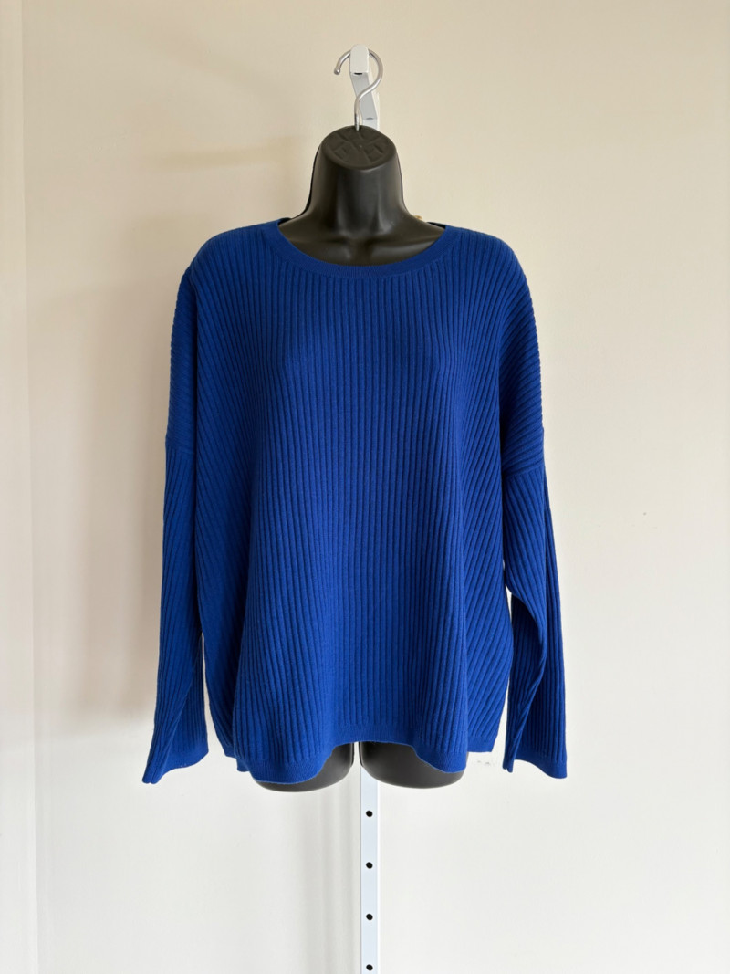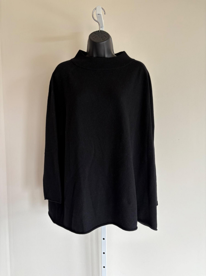 Trio of soft Eileen Fisher sweaters for all occasions. All measure 27" pit to pit and size tags say XL. Black sweater has mock turtleneck, 3/4 raglan sleeves, and rolled cuffs/hem. Recycled cashmere/wool blend. Brilliant blue sweater has dropped shoulder seams, ribbed curved neckline/cuffs/hem, and vertical rib knit pattern. Super soft hand in wool/polyester blend. Grey lightweight sweater has dropped shoulder seams, ribbed sleeves, wide modified funnel neck/cowl, and split hem with back several inches longer than front. 100% merino wool.