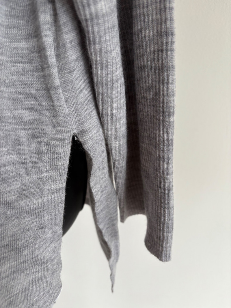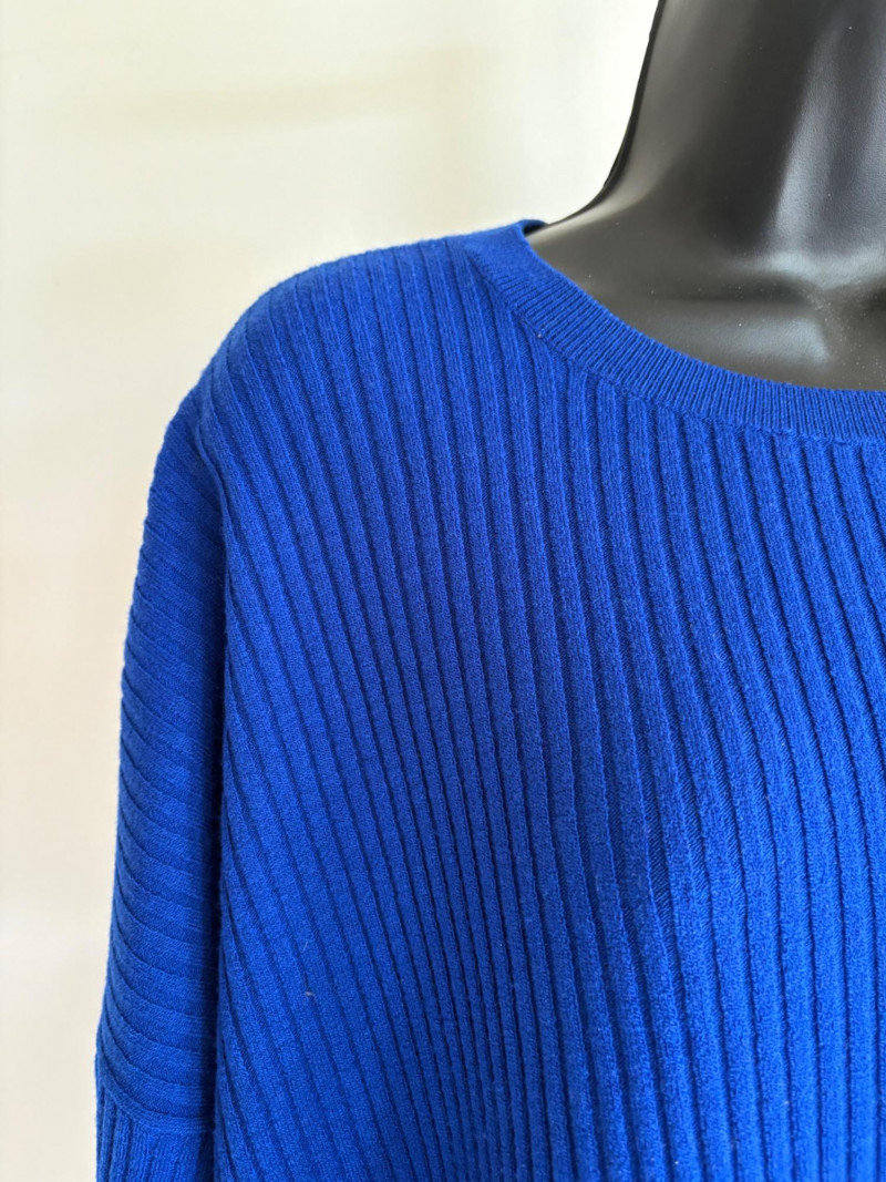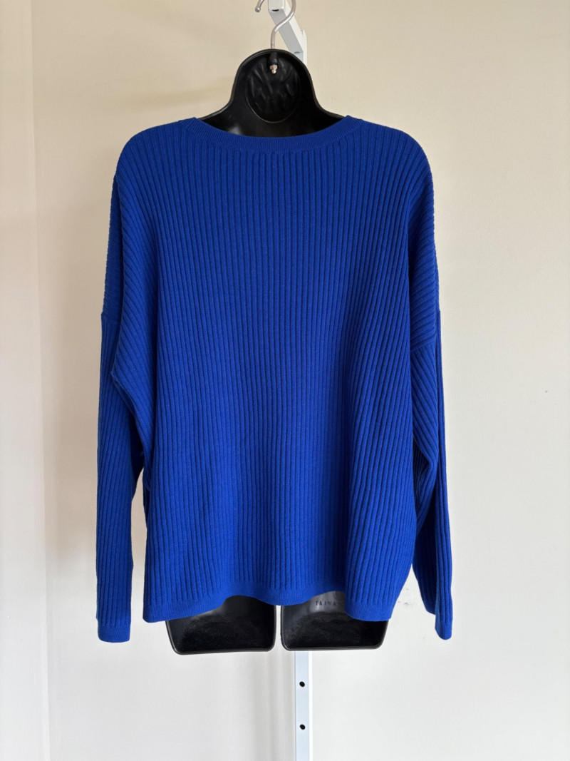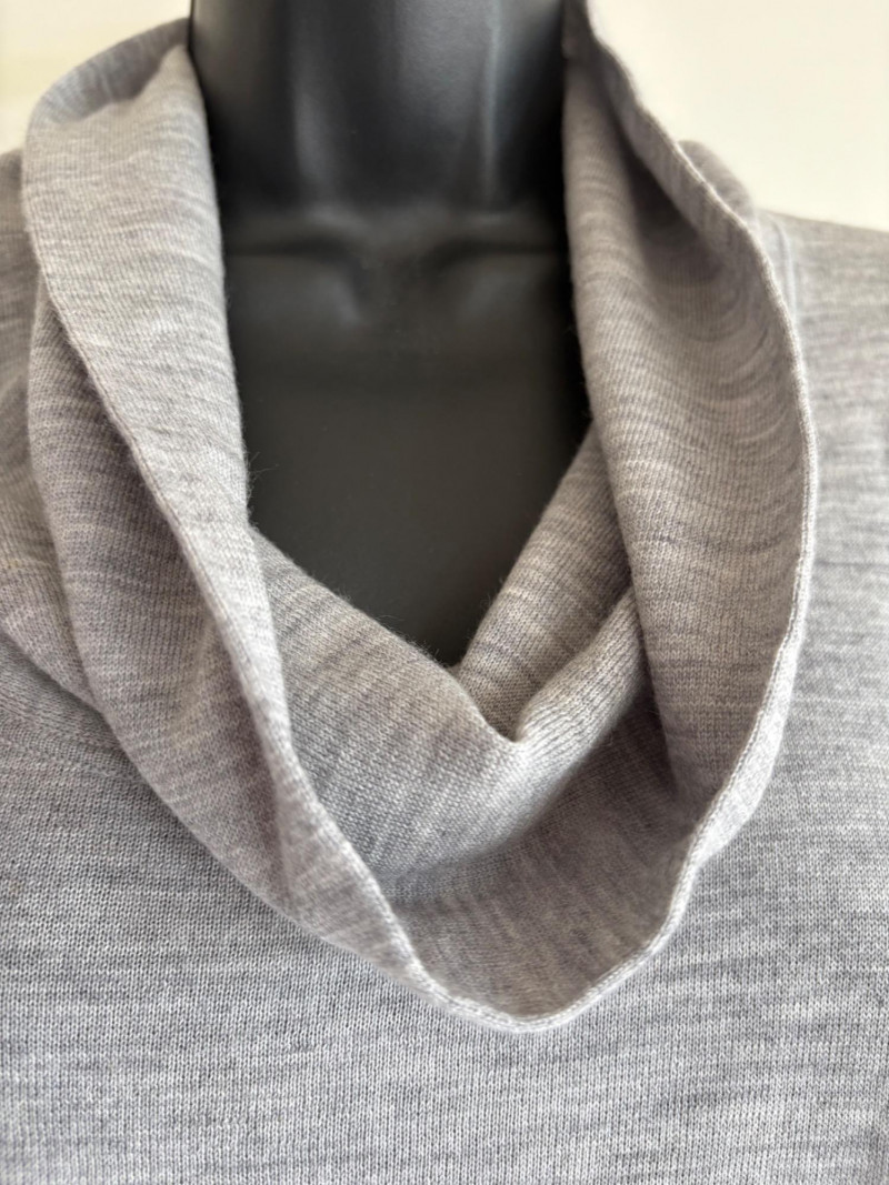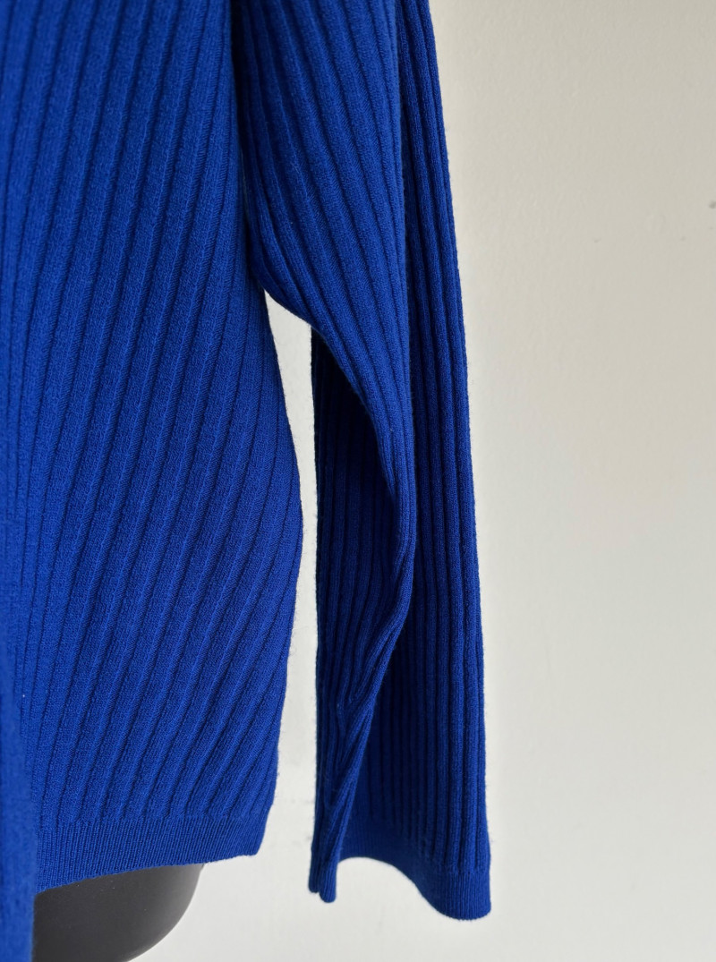 Trio of soft Eileen Fisher sweaters for all occasions. All measure 27" pit to pit and size tags say XL. Black sweater has mock turtleneck, 3/4 raglan sleeves, and rolled cuffs/hem. Recycled cashmere/wool blend. Brilliant blue sweater has dropped shoulder seams, ribbed curved neckline/cuffs/hem, and vertical rib knit pattern. Super soft hand in wool/polyester blend. Grey lightweight sweater has dropped shoulder seams, ribbed sleeves, wide modified funnel neck/cowl, and split hem with back several inches longer than front. 100% merino wool.