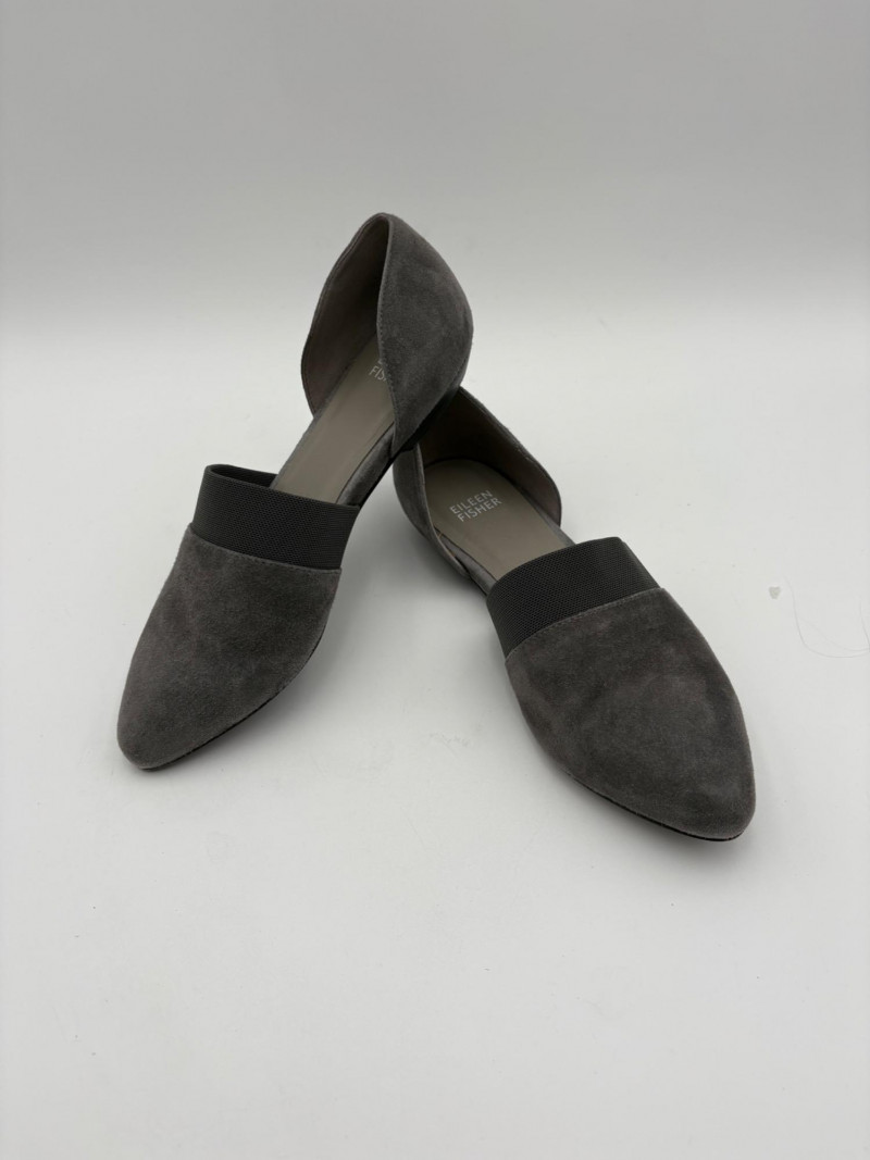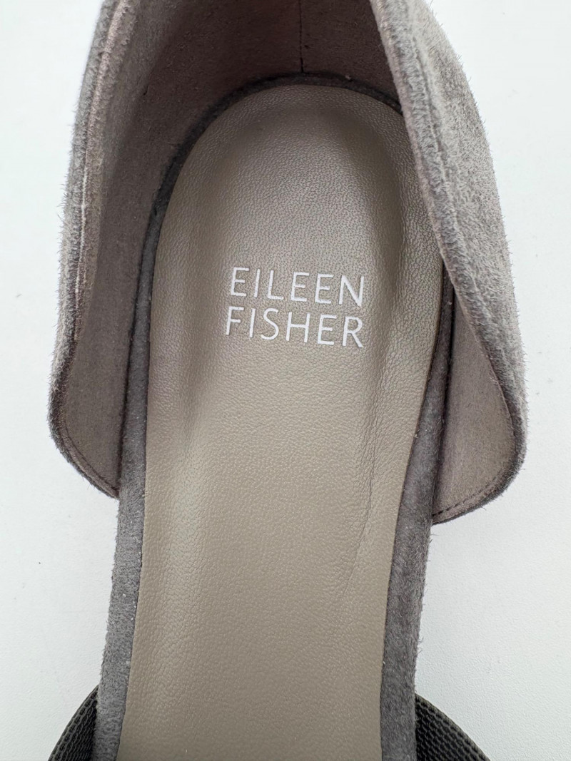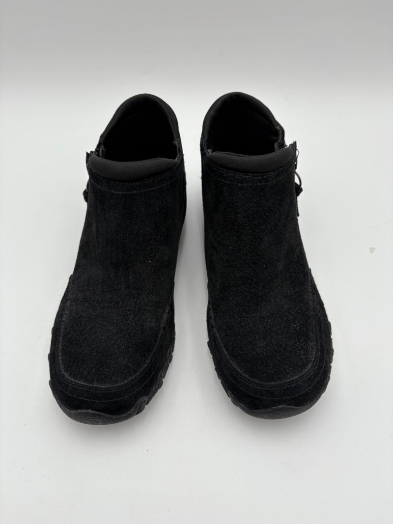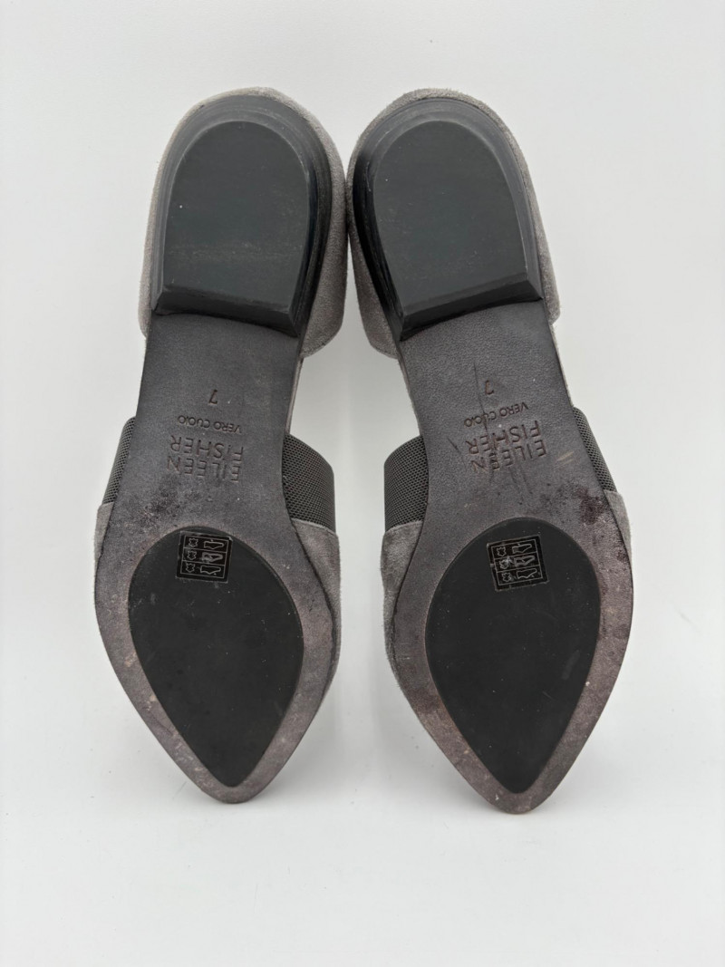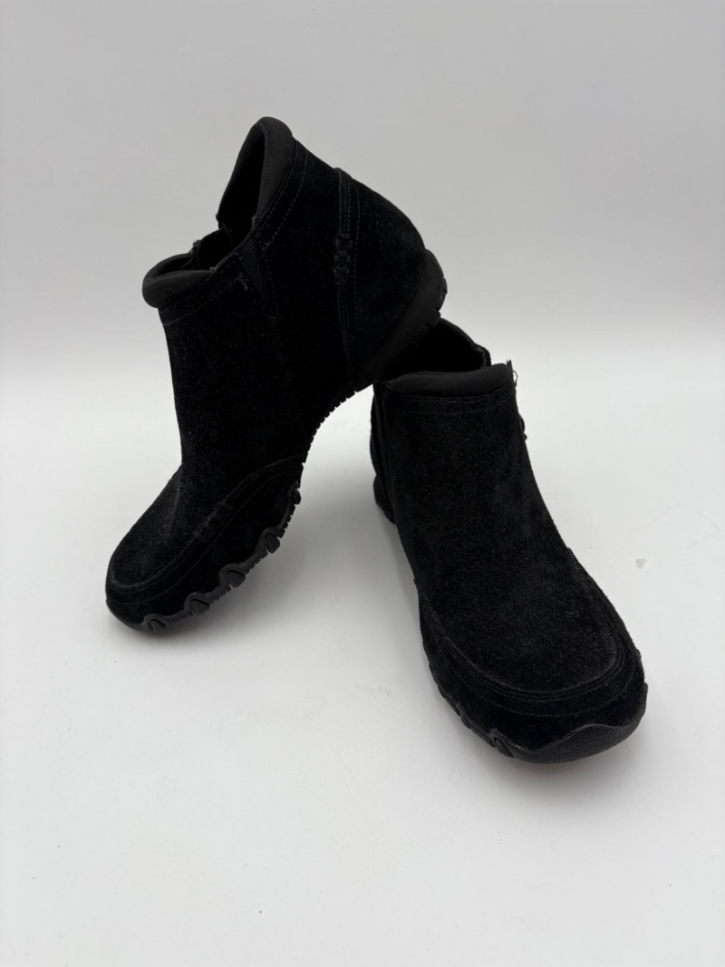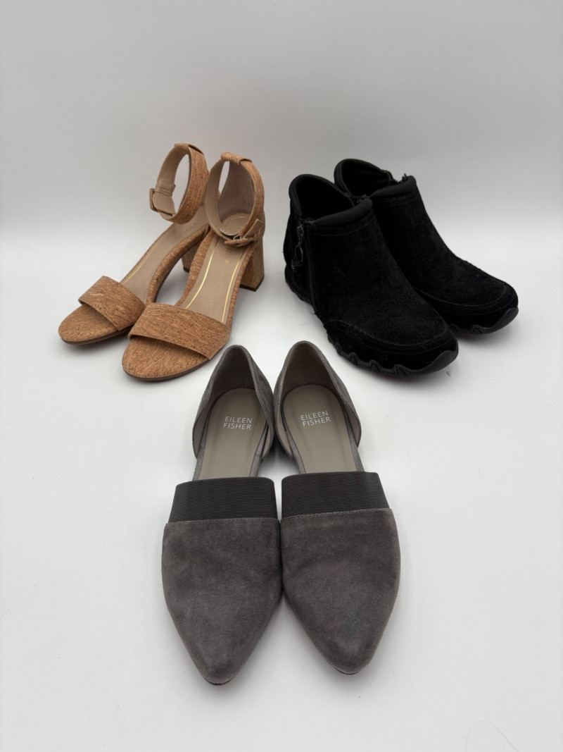 Eileen Fisher grey suede flats with open in-step and elastic band on vamp. Size 7. Vionic chunky heel cork sandals with self-covered buckle and heel. Appear to be new. Size 7. Sketchers black leather casual ankle boots with rubber sole, side zip, and ankle gusset. Size 7.