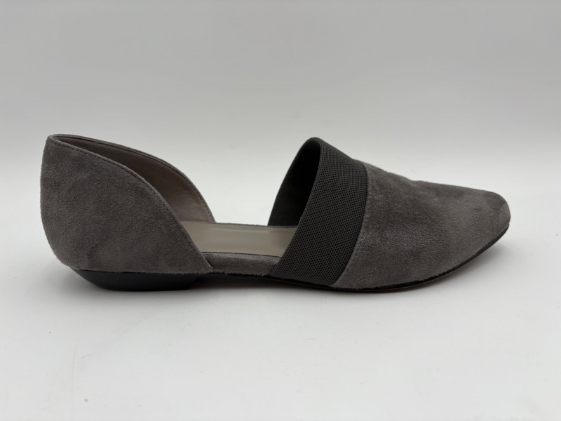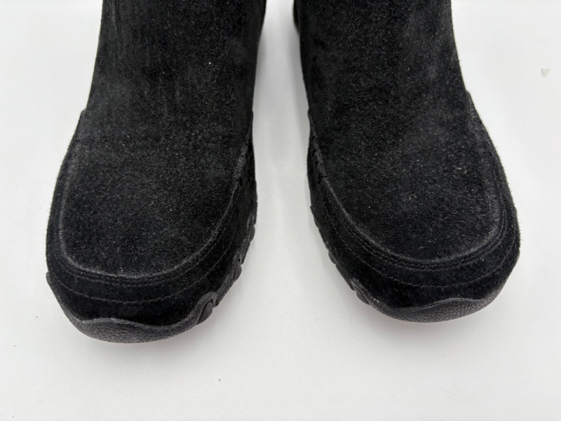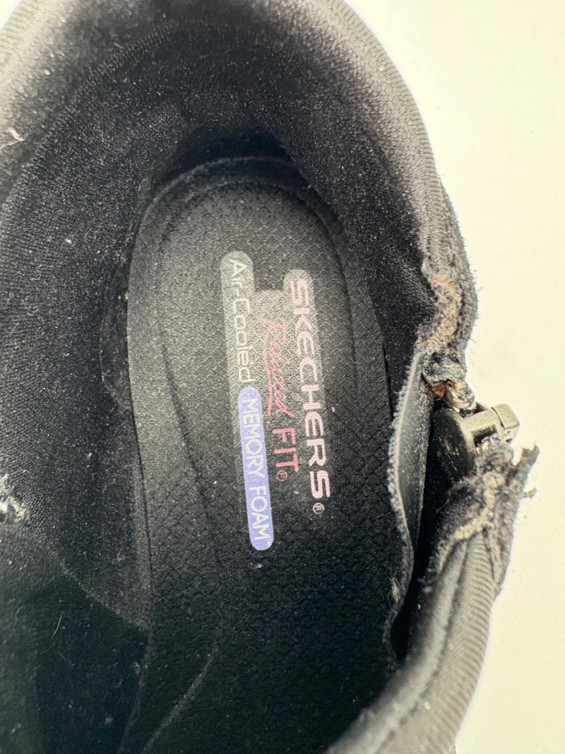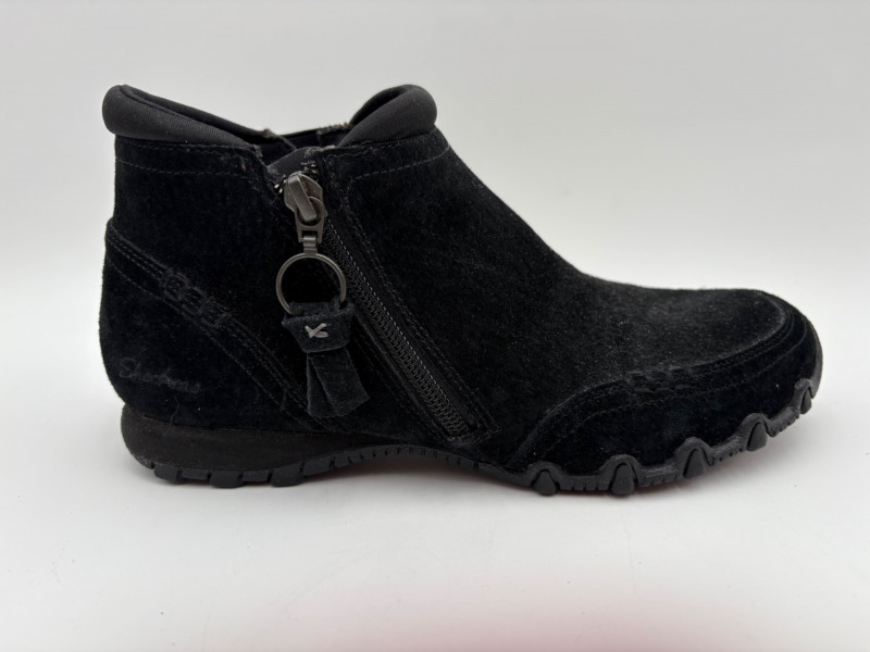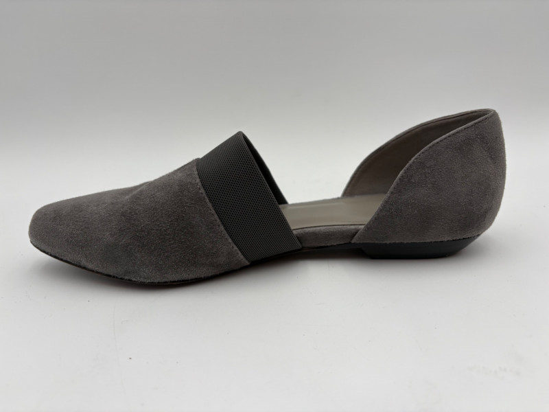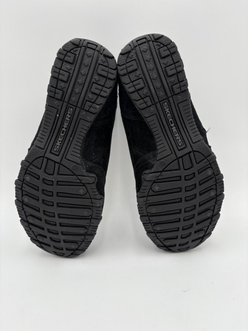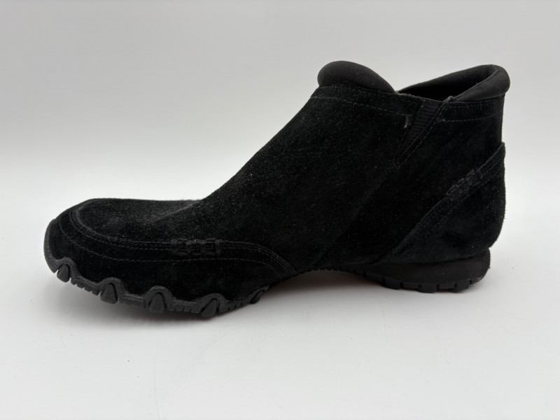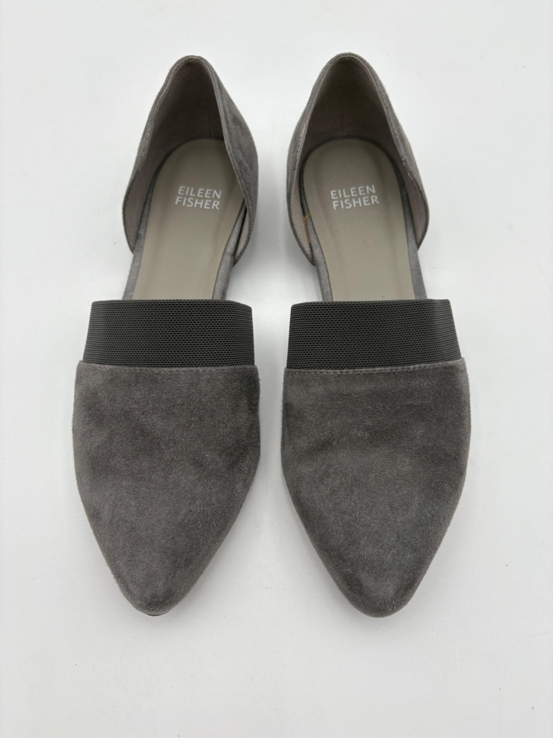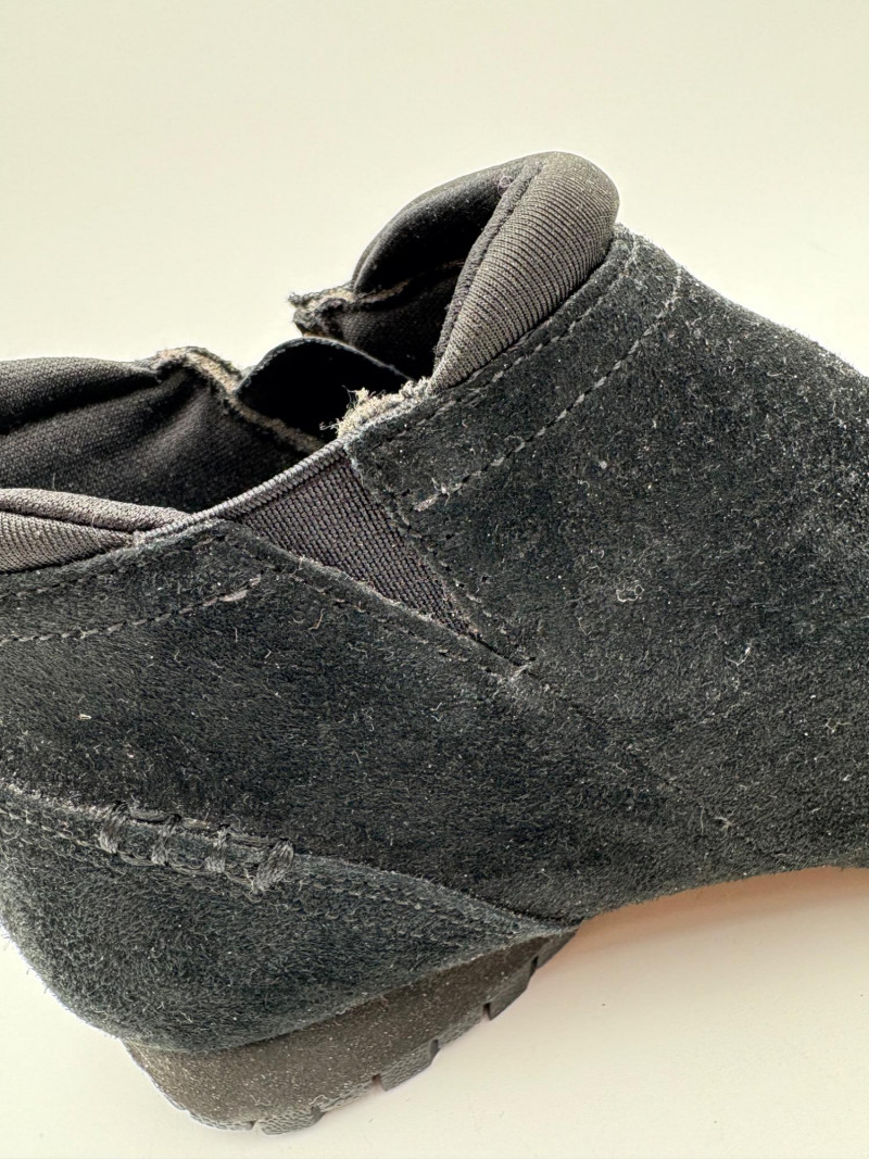 Eileen Fisher grey suede flats with open in-step and elastic band on vamp. Size 7. Vionic chunky heel cork sandals with self-covered buckle and heel. Appear to be new. Size 7. Sketchers black leather casual ankle boots with rubber sole, side zip, and ankle gusset. Size 7.