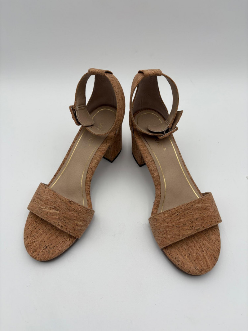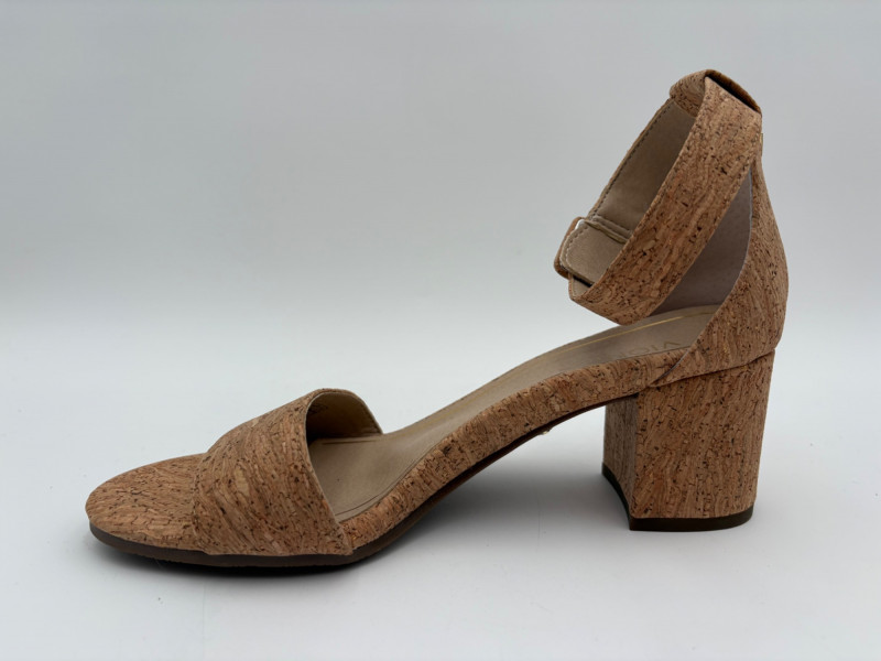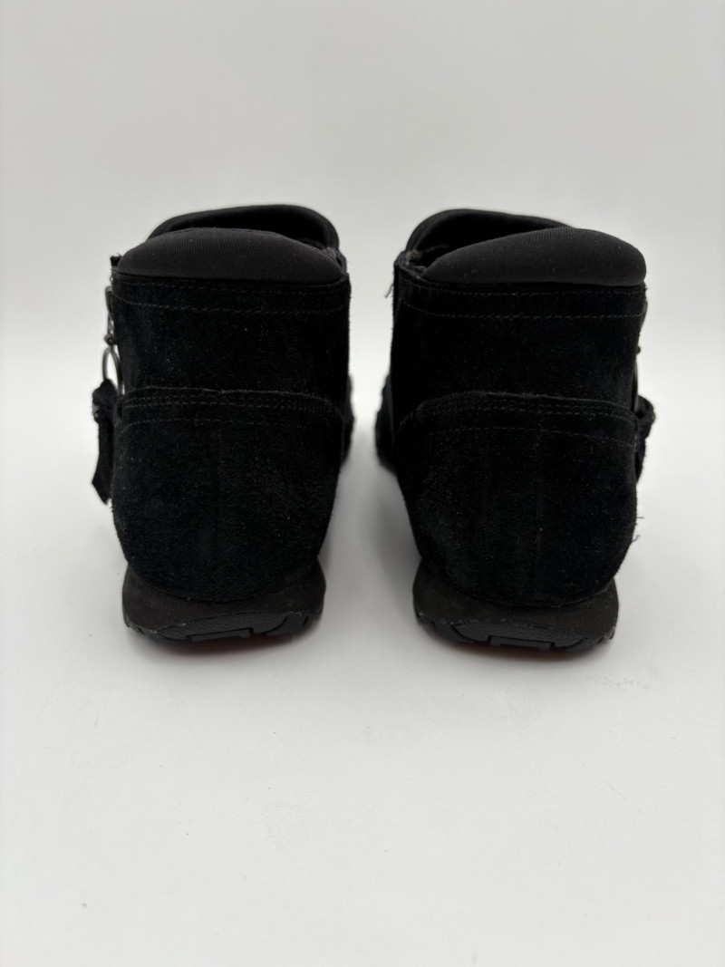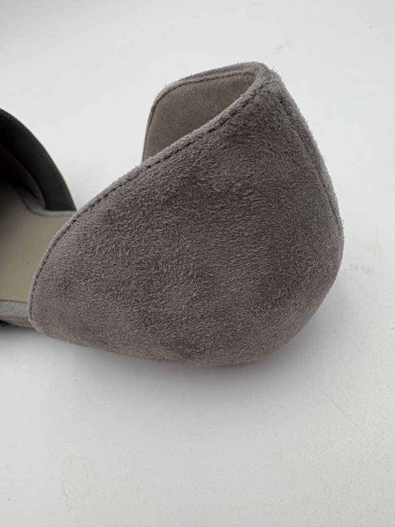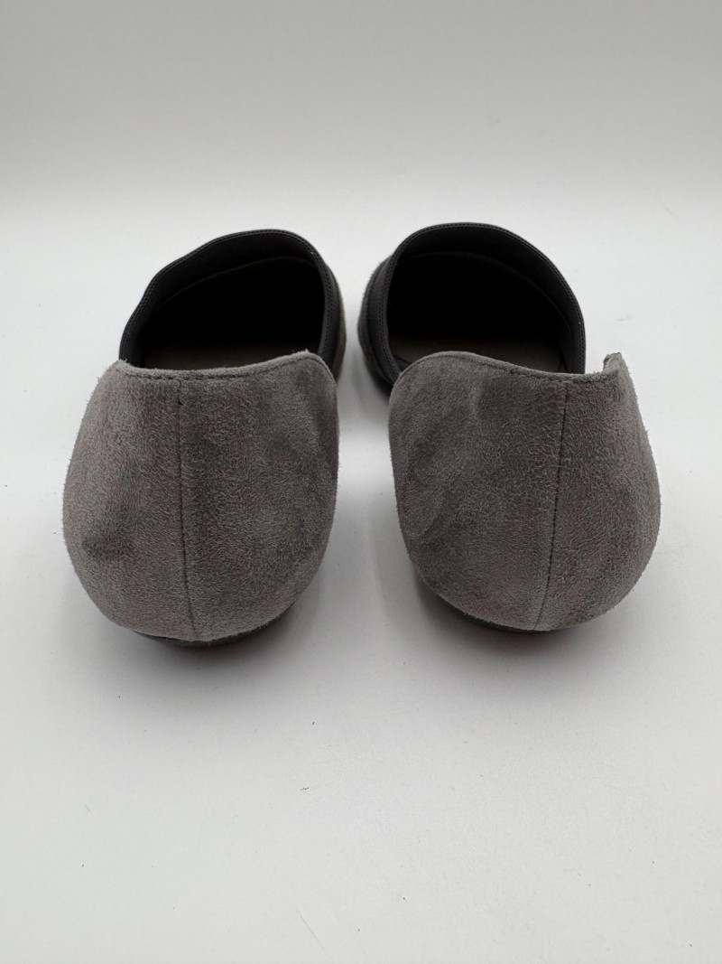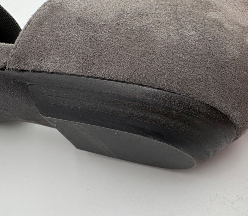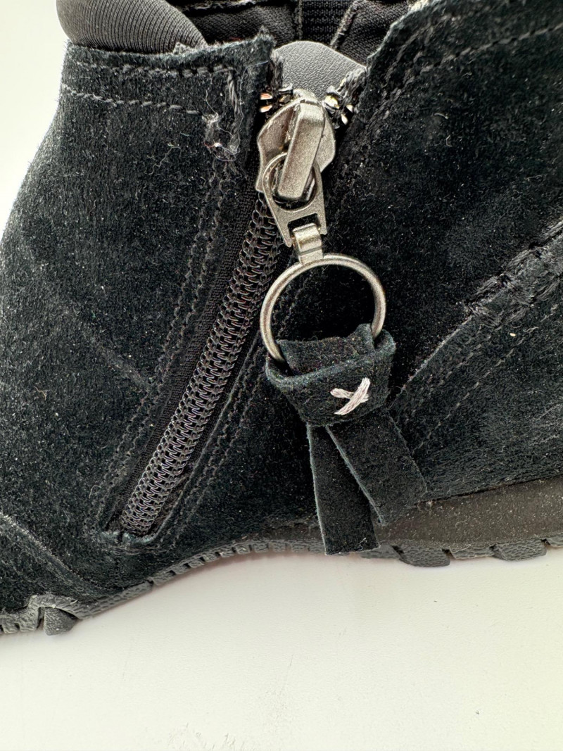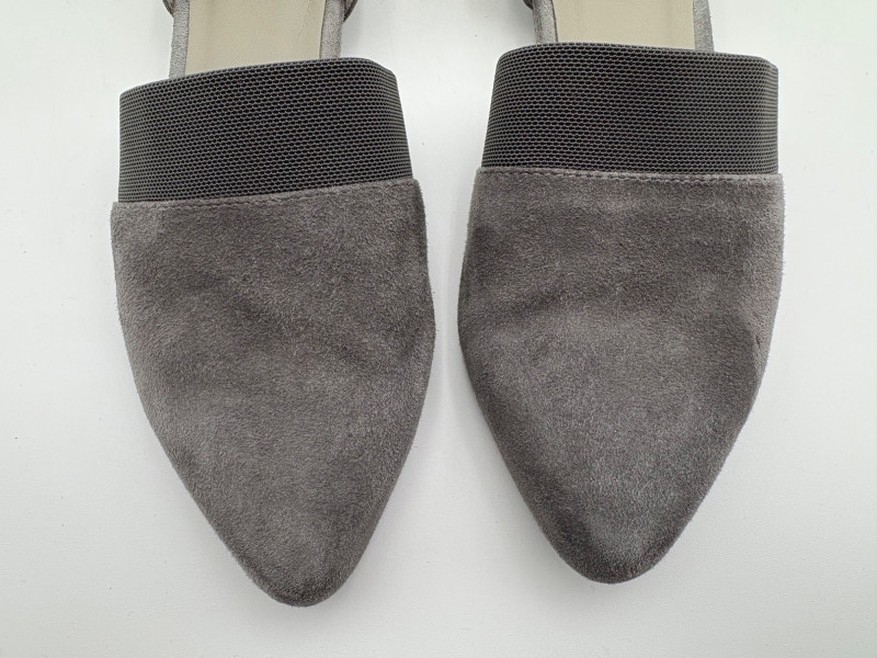 Eileen Fisher grey suede flats with open in-step and elastic band on vamp. Size 7. Vionic chunky heel cork sandals with self-covered buckle and heel. Appear to be new. Size 7. Sketchers black leather casual ankle boots with rubber sole, side zip, and ankle gusset. Size 7.