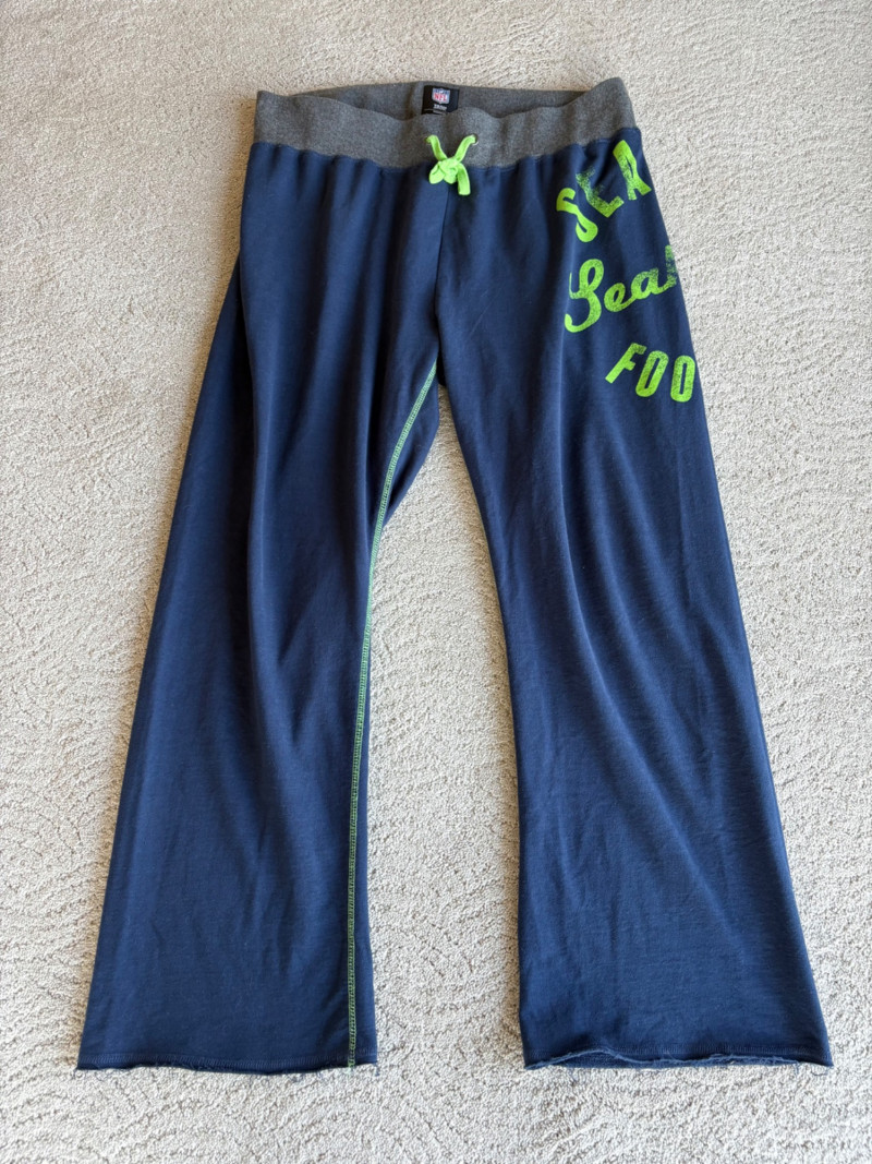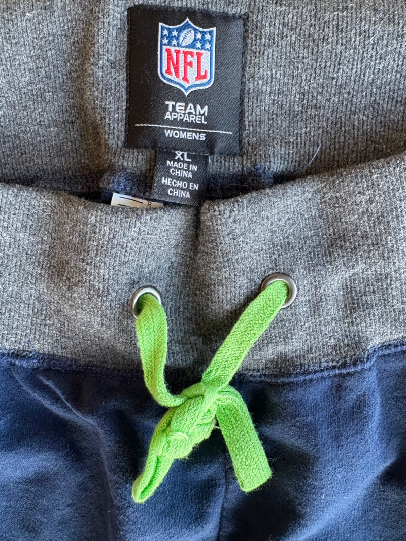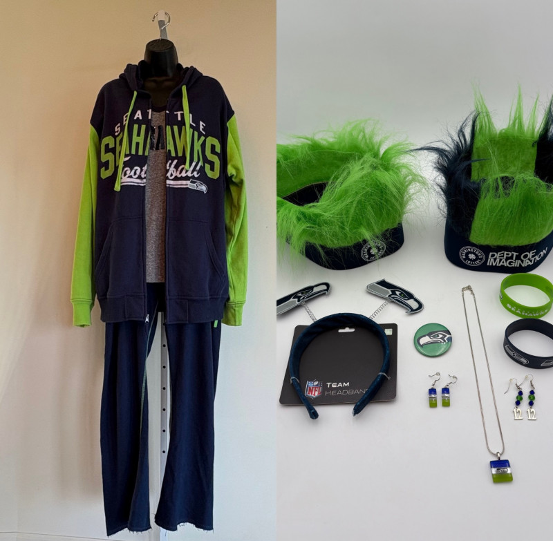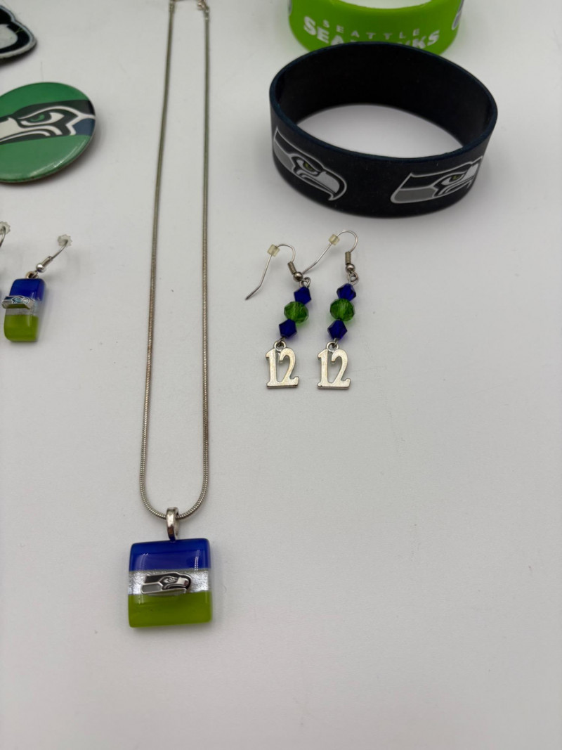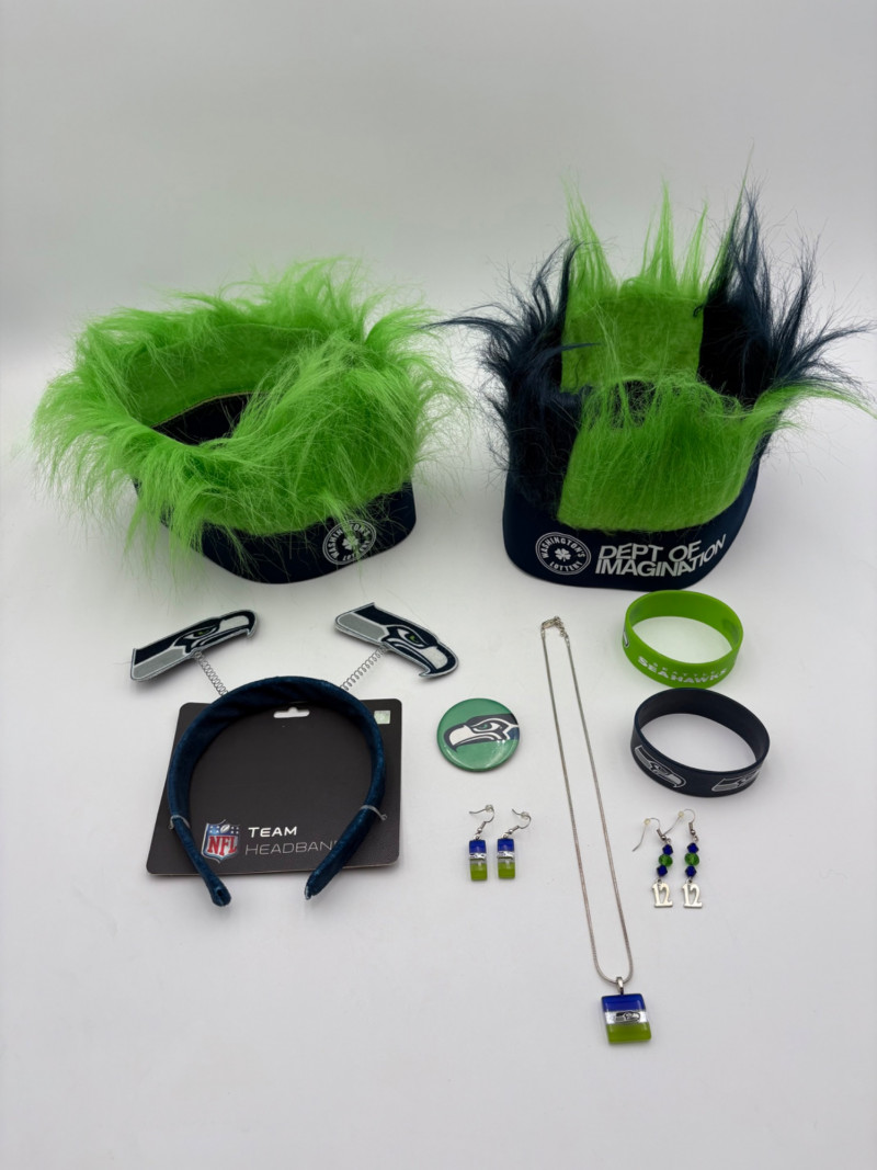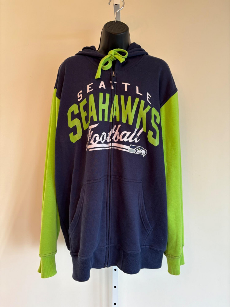 Great group of Seahawks attire and novelties. Official NFL Seattle Seahawks zip front sweat jacket. Traditional sweatshirt styling with dark blue body, green sleeves, hem ribbing, and kangaroo pockets with hood. Measures 26.5" pit to pit. Good quality piece in a cotton/polyester blend. Size tag says XL. Matching NFL sweatpants in dark blue with Seahawks printing on the left leg and hip, ribbed gray waistband, and green drawstring. Cotton/polyester blend. Measures 19" side to side at waist. Size tag says XL. Seahawks T-shirt from Touch Stadium. Body is gray with Seattle Seahawks printed on the front in blue - the "Seahawks" is in blue sequins. Cotton/ polyester blend. Measures 24" pit to pit. Size tag says XXL. 2 sweatbands/hats with faux blue and green fur. Assorted Seahawks novelties: headband (NWT), green and blue logo wristbands, logo button, and jewelry consisting of a logo necklace/logo earrings plus an additional pair of 12th man earrings. Please note that this sweatshirt has been well-loved. There is some wear showing with mild pilling under the arms, but the fabric is not compromised - a quick session with a sweater shaver should take care of any issues.