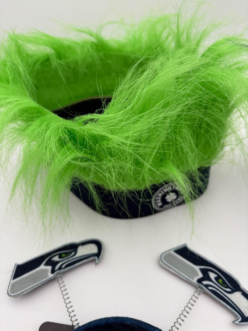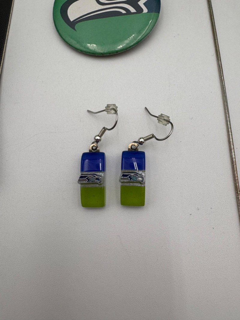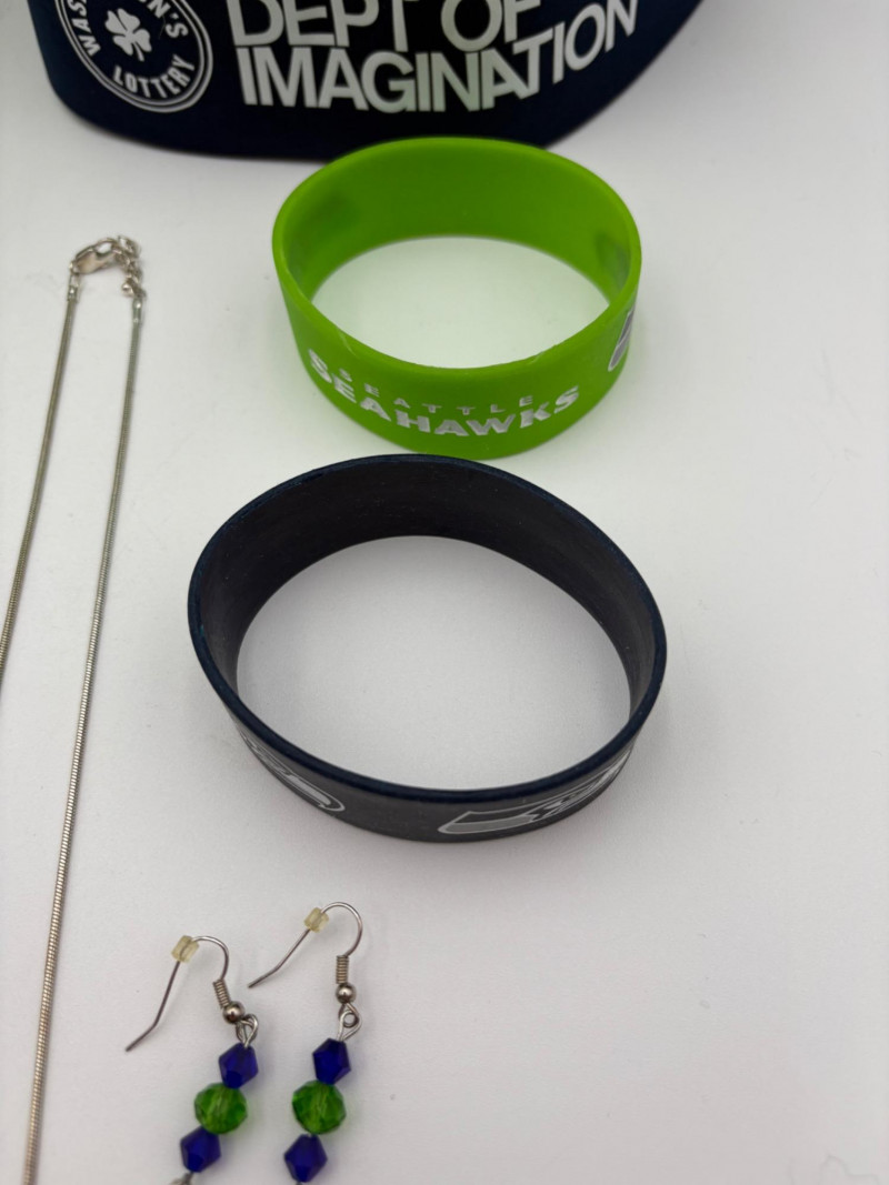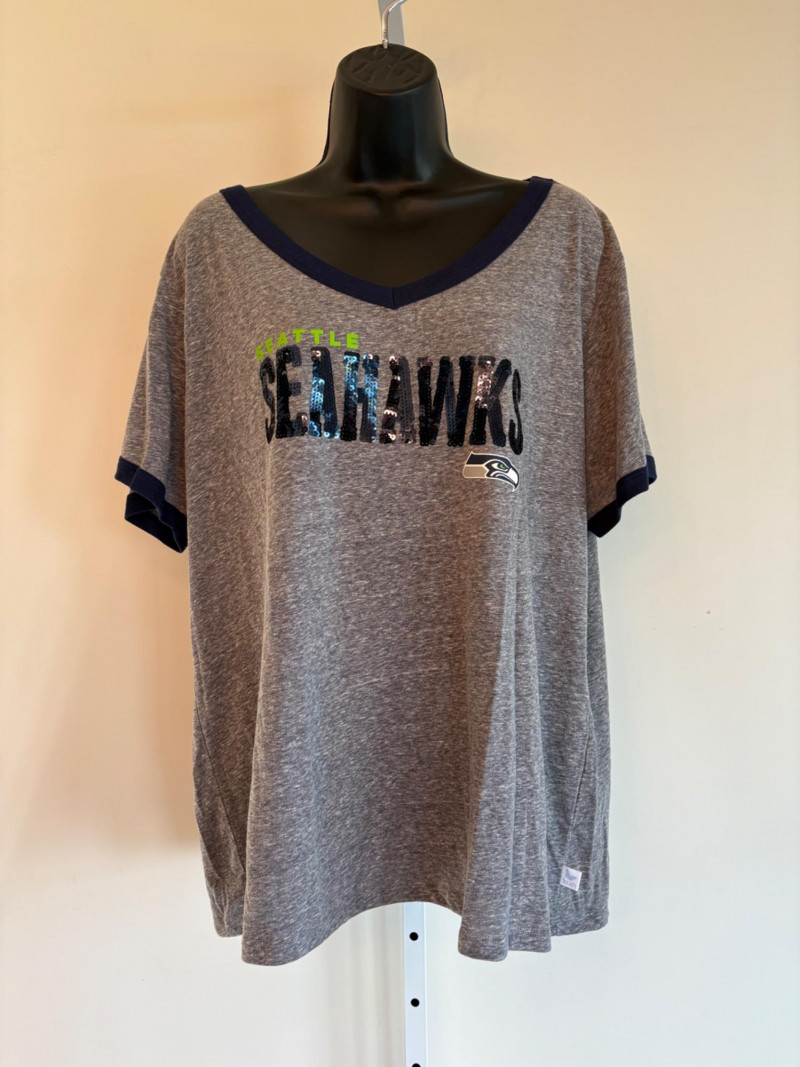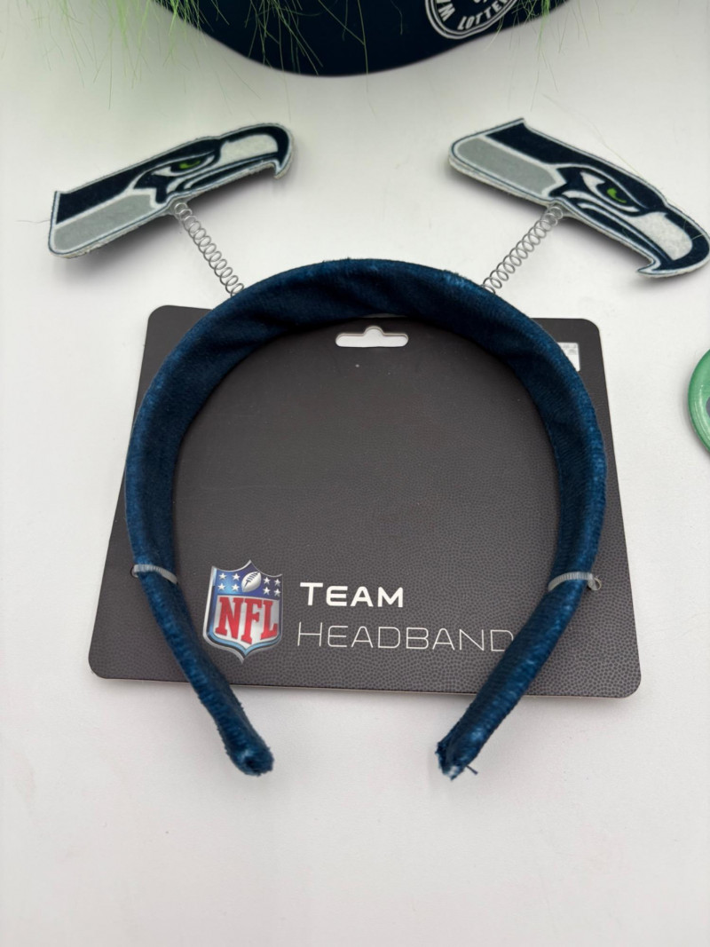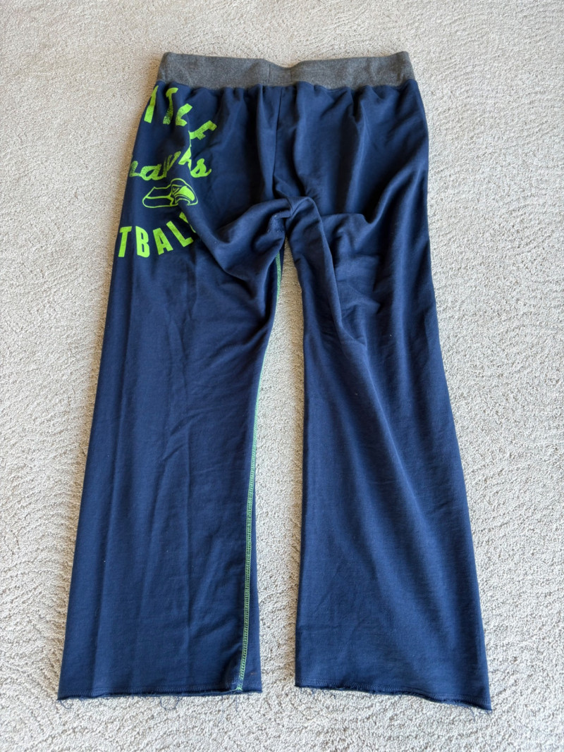 Great group of Seahawks attire and novelties. Official NFL Seattle Seahawks zip front sweat jacket. Traditional sweatshirt styling with dark blue body, green sleeves, hem ribbing, and kangaroo pockets with hood. Measures 26.5" pit to pit. Good quality piece in a cotton/polyester blend. Size tag says XL. Matching NFL sweatpants in dark blue with Seahawks printing on the left leg and hip, ribbed gray waistband, and green drawstring. Cotton/polyester blend. Measures 19" side to side at waist. Size tag says XL. Seahawks T-shirt from Touch Stadium. Body is gray with Seattle Seahawks printed on the front in blue - the "Seahawks" is in blue sequins. Cotton/ polyester blend. Measures 24" pit to pit. Size tag says XXL. 2 sweatbands/hats with faux blue and green fur. Assorted Seahawks novelties: headband (NWT), green and blue logo wristbands, logo button, and jewelry consisting of a logo necklace/logo earrings plus an additional pair of 12th man earrings. Please note that this sweatshirt has been well-loved. There is some wear showing with mild pilling under the arms, but the fabric is not compromised - a quick session with a sweater shaver should take care of any issues.