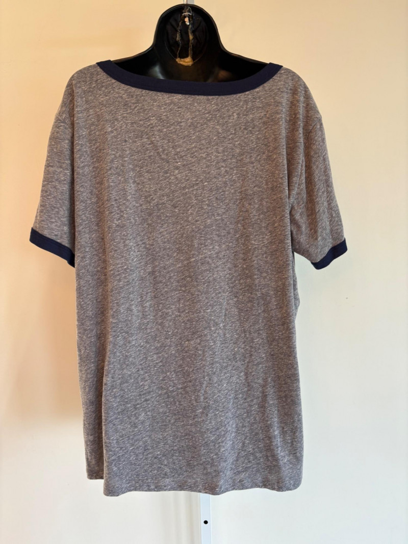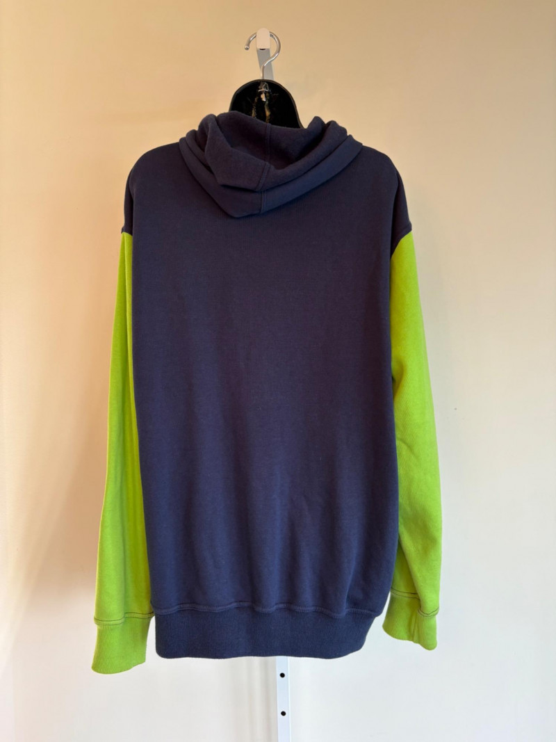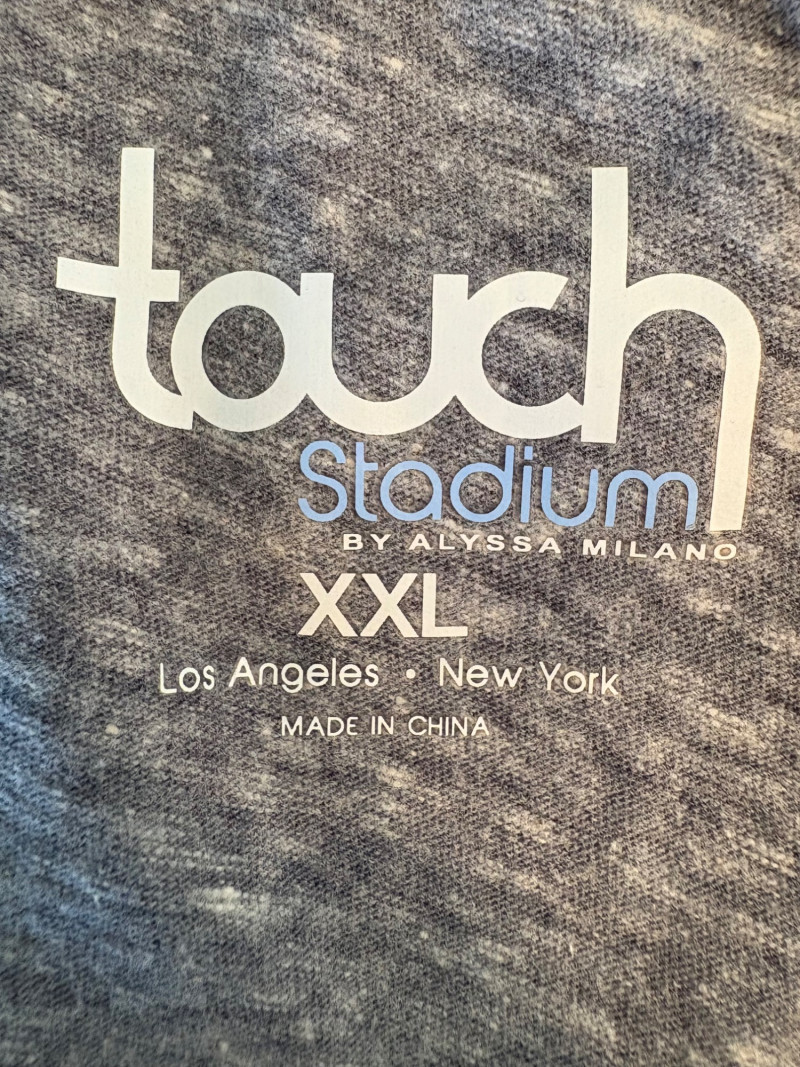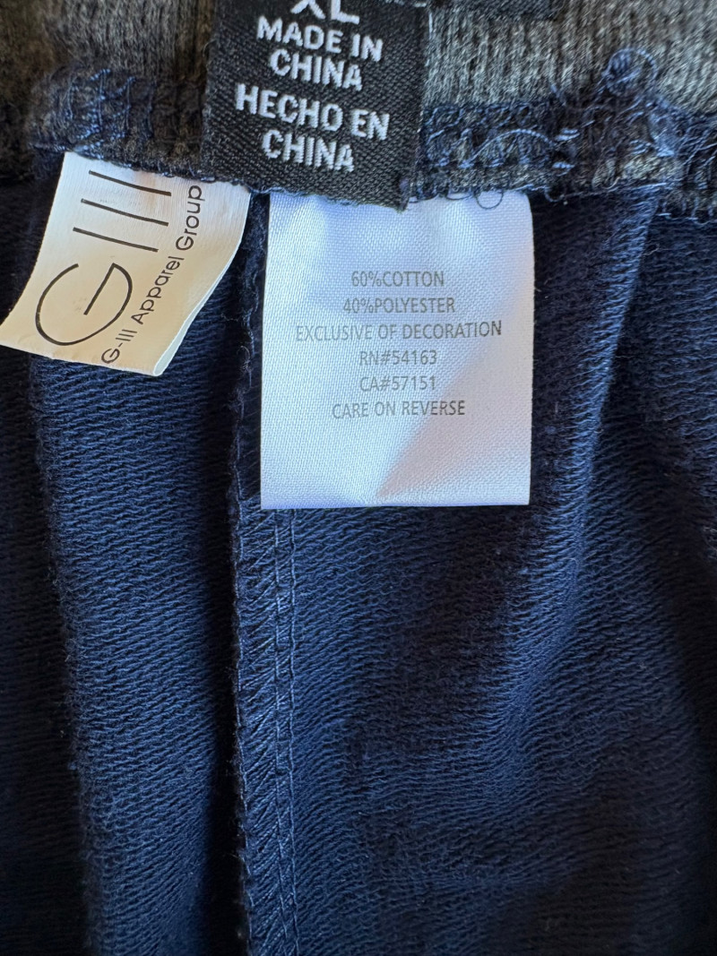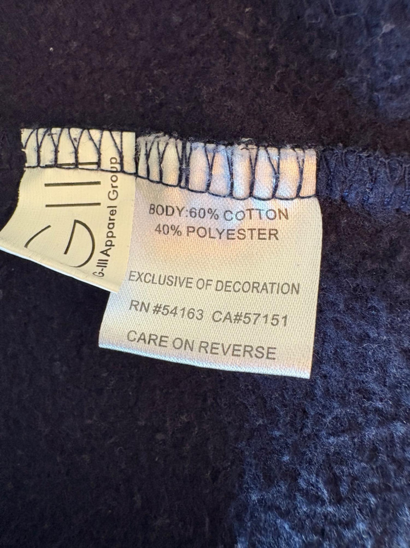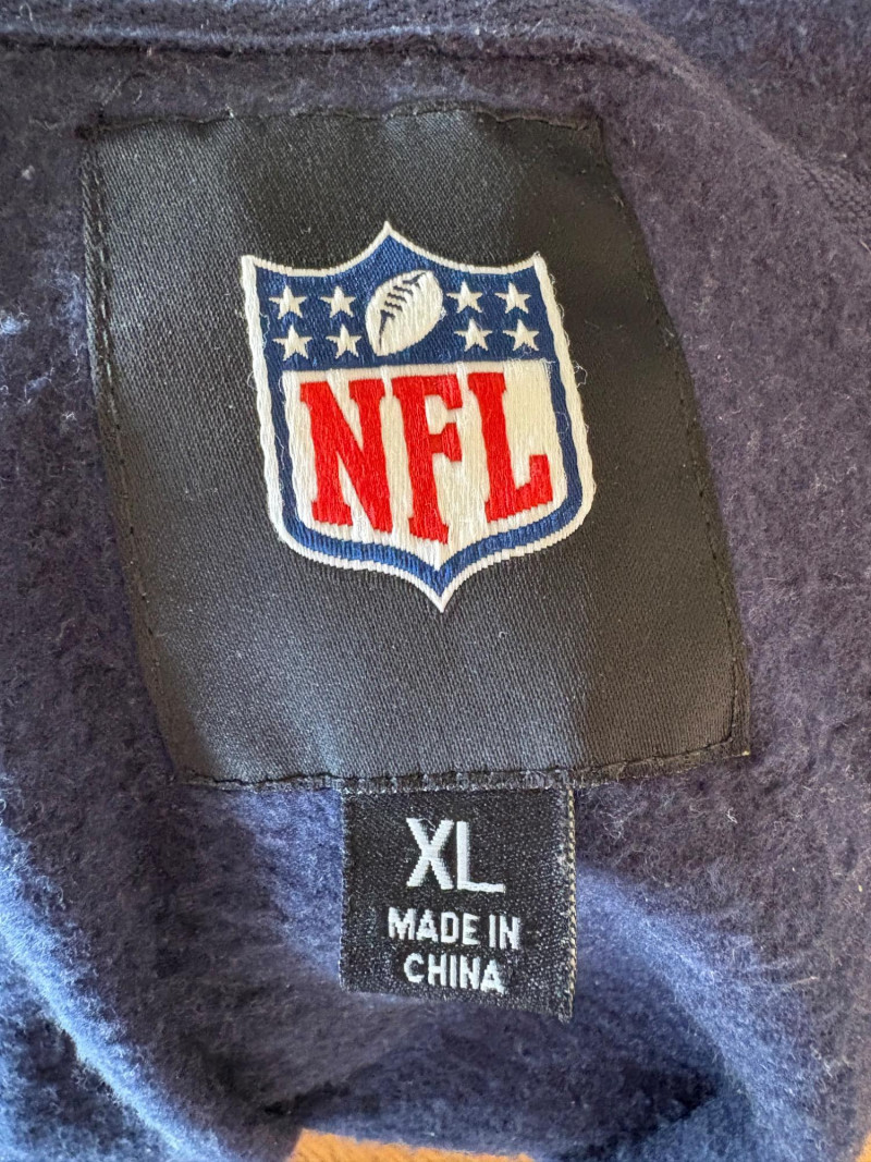 Great group of Seahawks attire and novelties. Official NFL Seattle Seahawks zip front sweat jacket. Traditional sweatshirt styling with dark blue body, green sleeves, hem ribbing, and kangaroo pockets with hood. Measures 26.5" pit to pit. Good quality piece in a cotton/polyester blend. Size tag says XL. Matching NFL sweatpants in dark blue with Seahawks printing on the left leg and hip, ribbed gray waistband, and green drawstring. Cotton/polyester blend. Measures 19" side to side at waist. Size tag says XL. Seahawks T-shirt from Touch Stadium. Body is gray with Seattle Seahawks printed on the front in blue - the "Seahawks" is in blue sequins. Cotton/ polyester blend. Measures 24" pit to pit. Size tag says XXL. 2 sweatbands/hats with faux blue and green fur. Assorted Seahawks novelties: headband (NWT), green and blue logo wristbands, logo button, and jewelry consisting of a logo necklace/logo earrings plus an additional pair of 12th man earrings. Please note that this sweatshirt has been well-loved. There is some wear showing with mild pilling under the arms, but the fabric is not compromised - a quick session with a sweater shaver should take care of any issues.