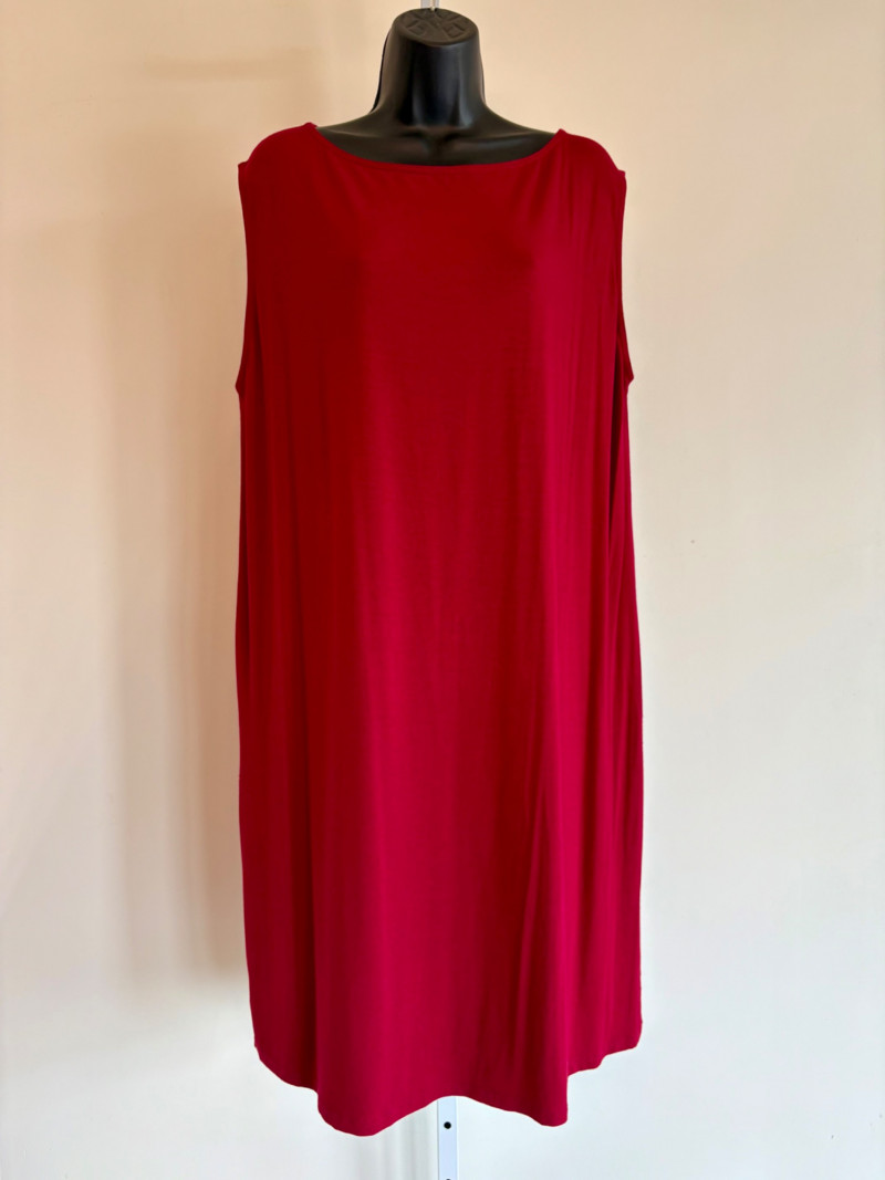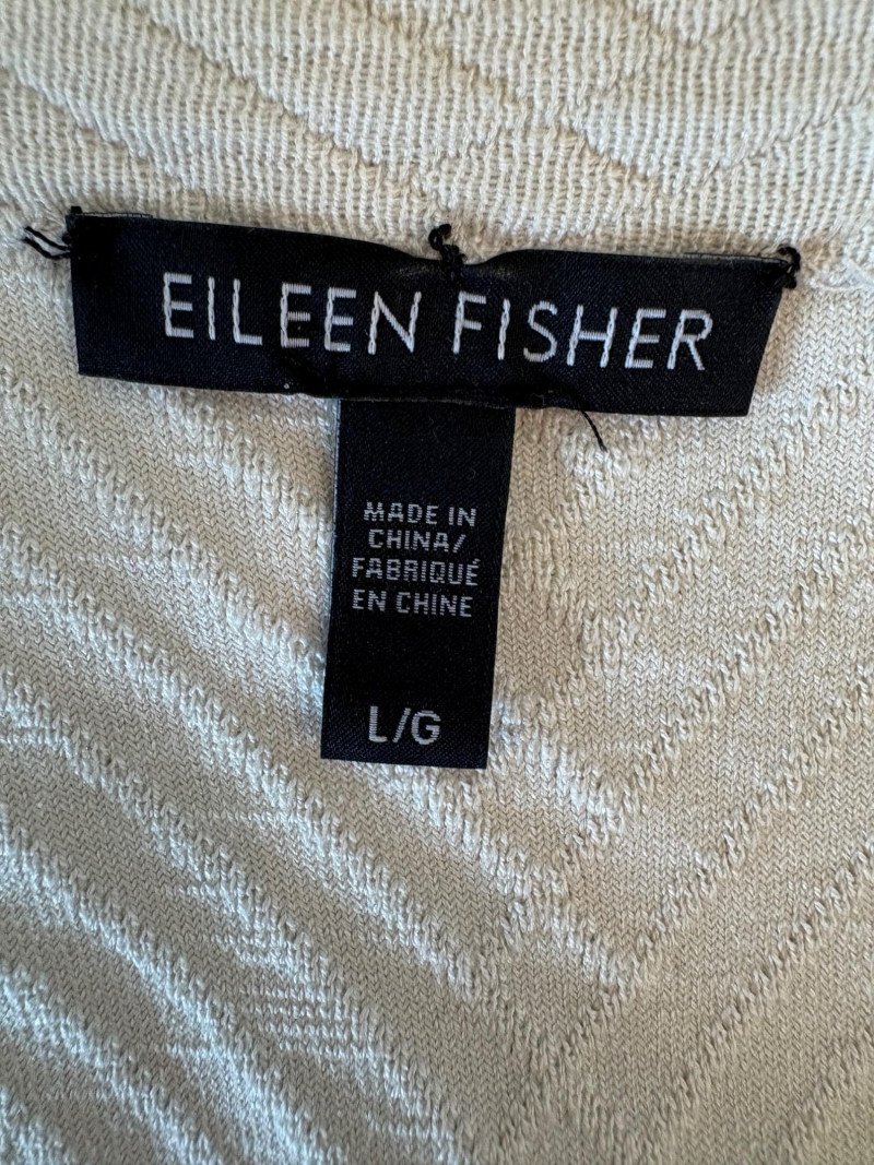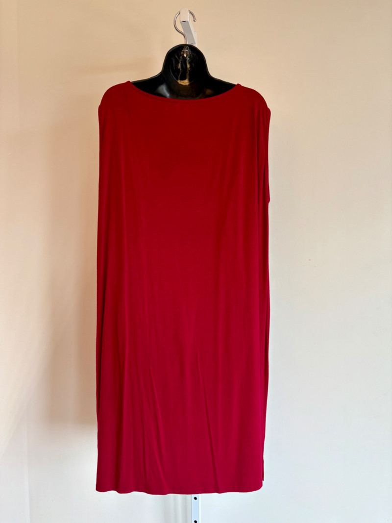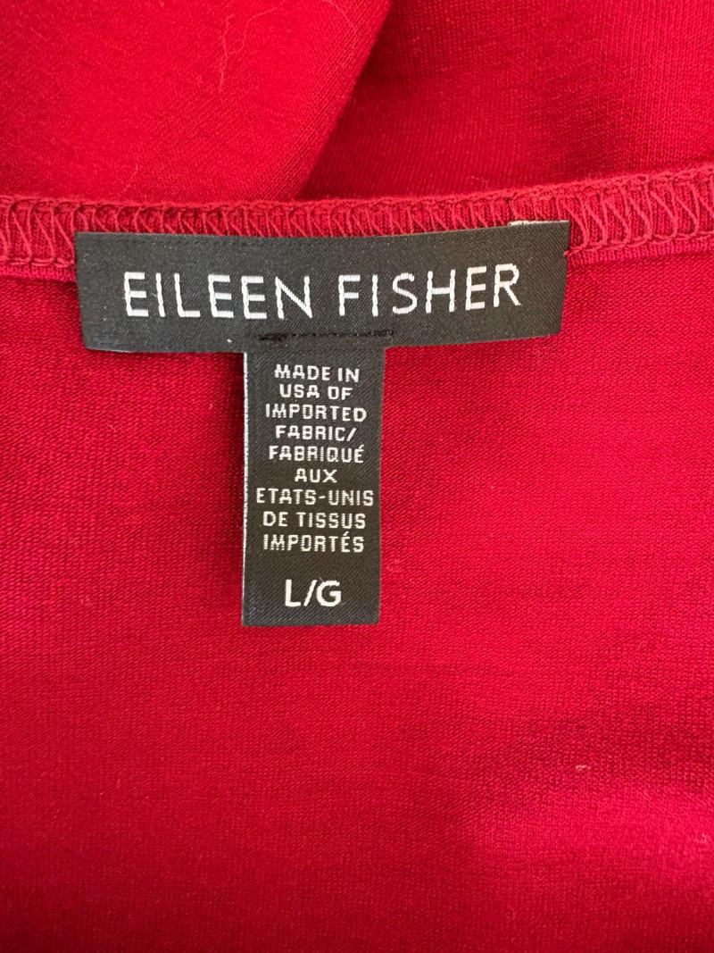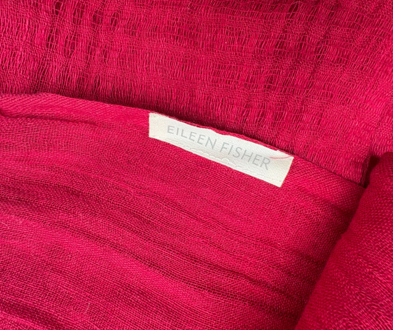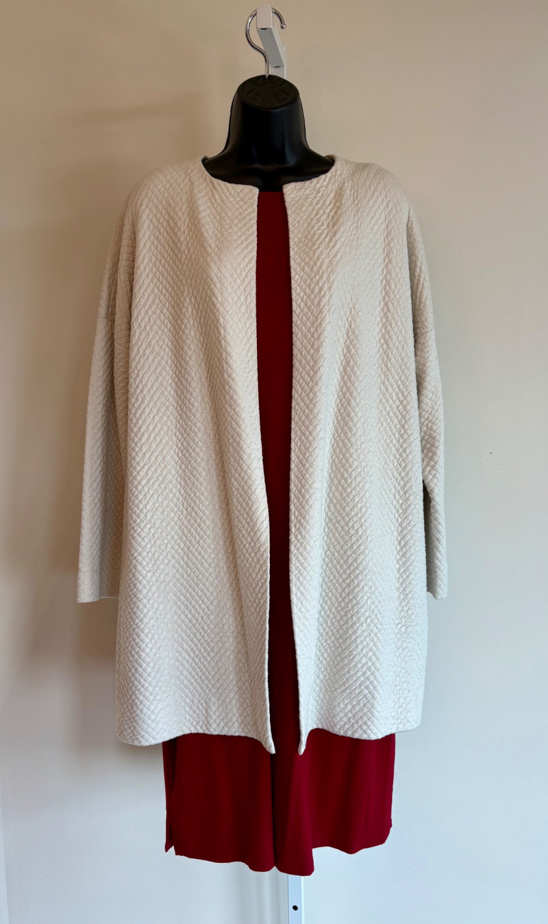 Terrific soft separates with a punch of color from Eileen Fisher. Ivory jacket has round neckline, open front, and soft small diamond shape quilting. Silk/cotton/nylon/spandex blend. Measures 24" pit to pit and 29.5" from back neckline to hem. Size tag says L. Blood red smooth knit dress is sleeveless and straight-cut with small split hem. Viscose/spandex blend. Measures 22.5" pit to pit and 38" from back neckline to hem. Size tag says L. Paired with blood red scarf with fringe on short ends. Measures approx. 24" x 76". No fabric tag, but feels like cotton.