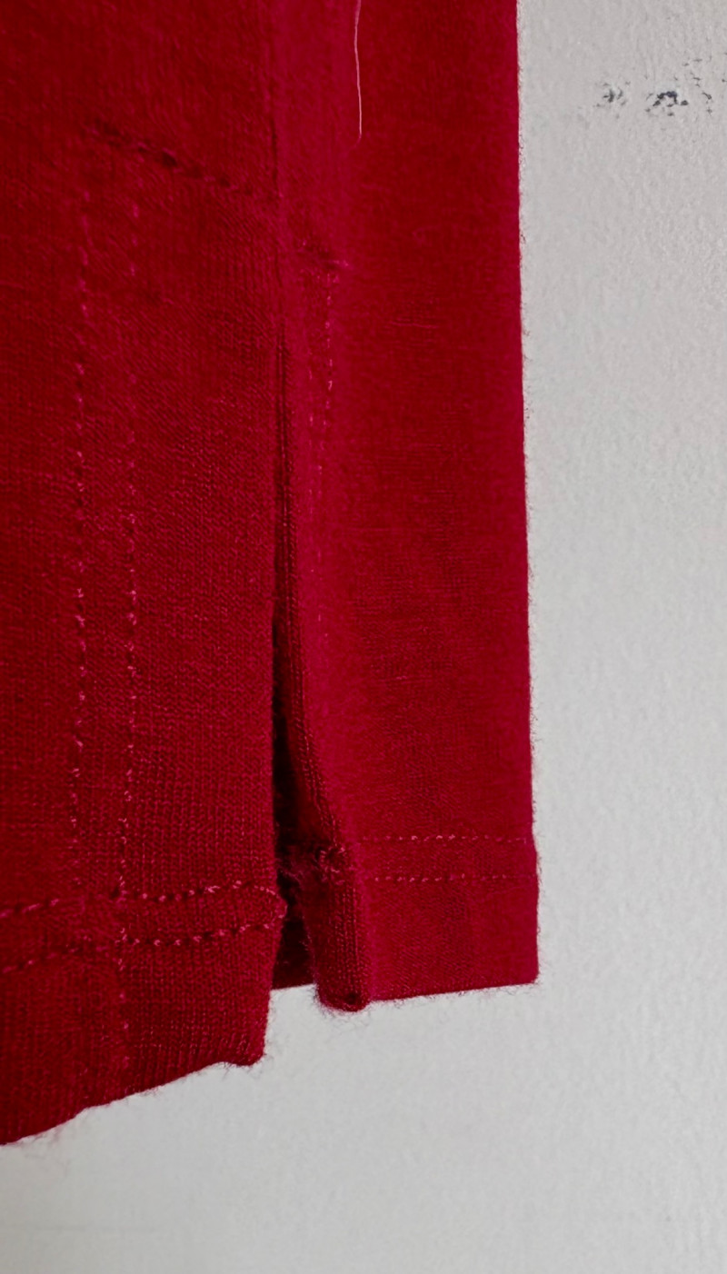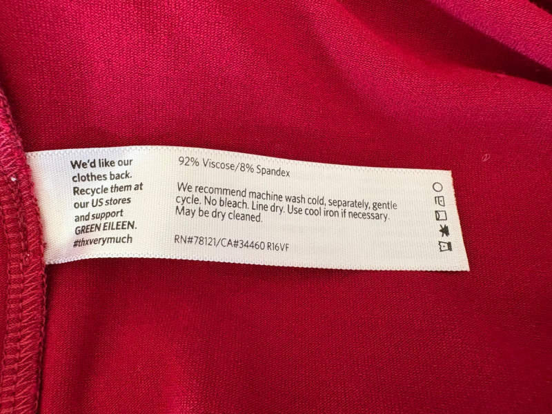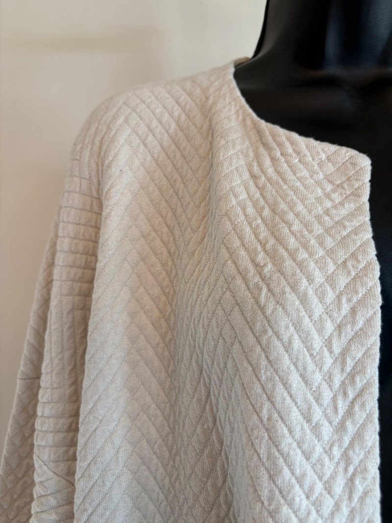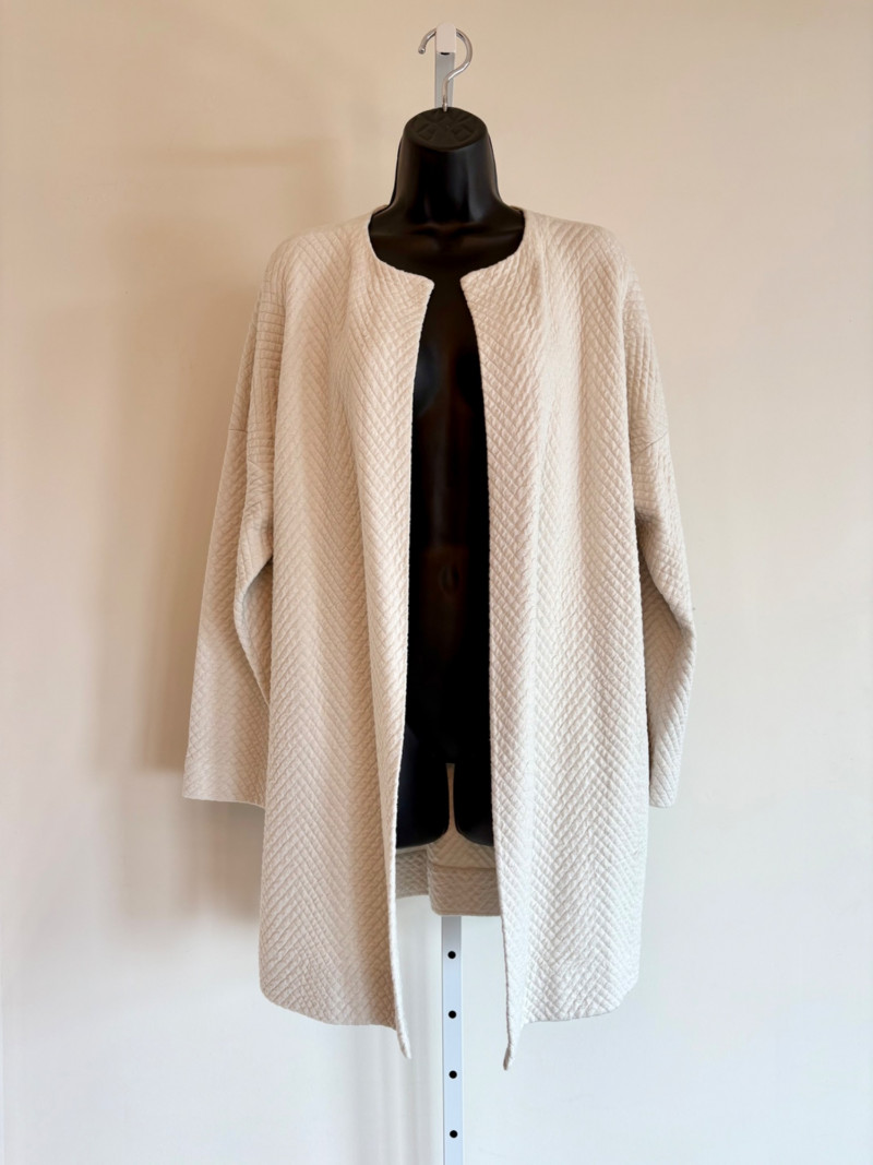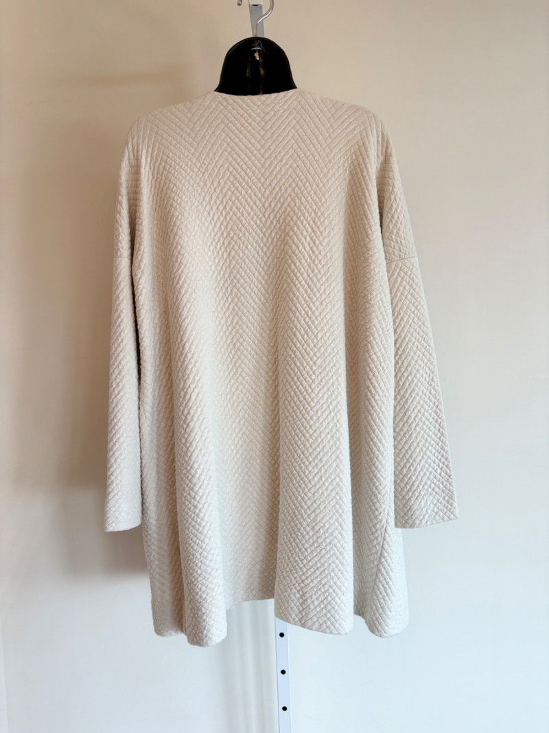 Terrific soft separates with a punch of color from Eileen Fisher. Ivory jacket has round neckline, open front, and soft small diamond shape quilting. Silk/cotton/nylon/spandex blend. Measures 24" pit to pit and 29.5" from back neckline to hem. Size tag says L. Blood red smooth knit dress is sleeveless and straight-cut with small split hem. Viscose/spandex blend. Measures 22.5" pit to pit and 38" from back neckline to hem. Size tag says L. Paired with blood red scarf with fringe on short ends. Measures approx. 24" x 76". No fabric tag, but feels like cotton.