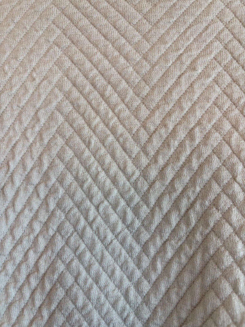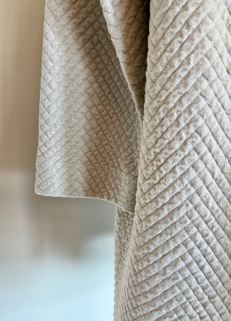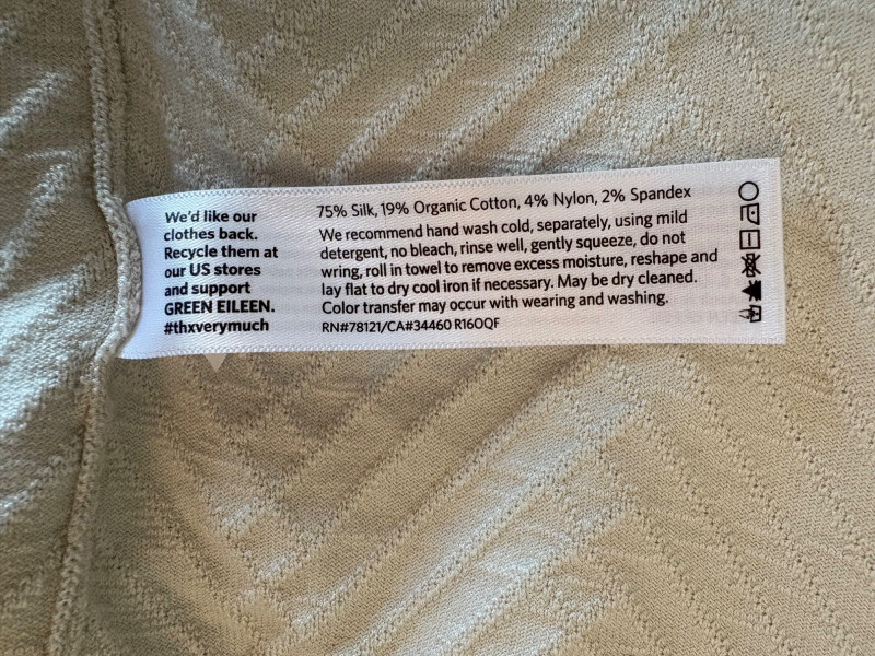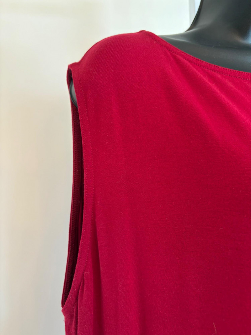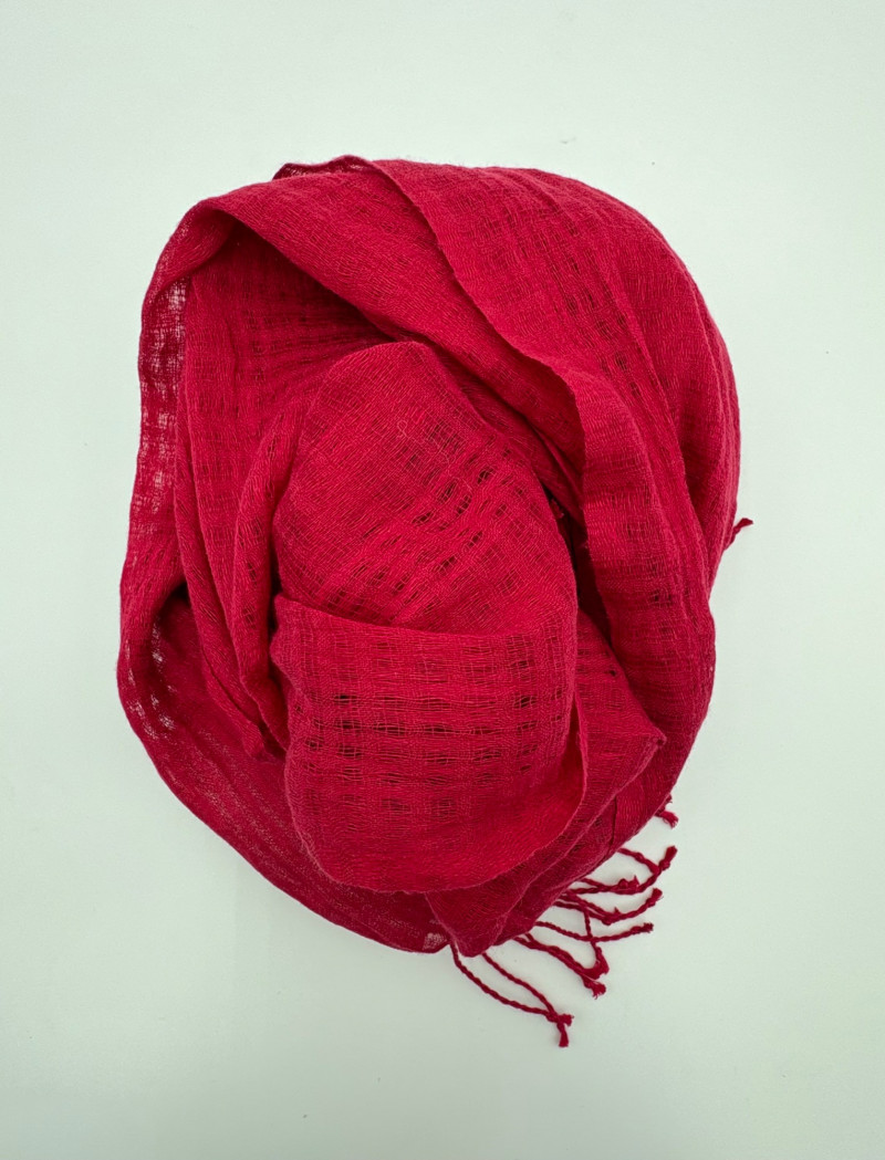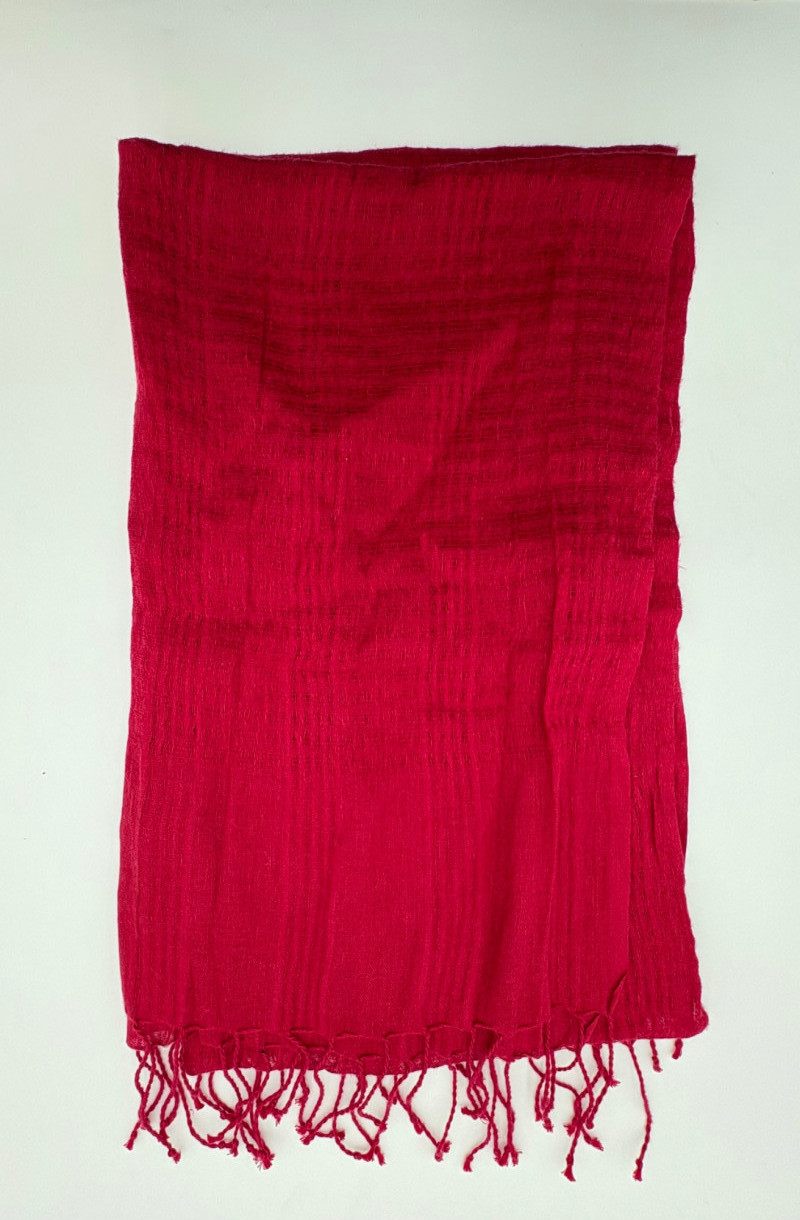 Terrific soft separates with a punch of color from Eileen Fisher. Ivory jacket has round neckline, open front, and soft small diamond shape quilting. Silk/cotton/nylon/spandex blend. Measures 24" pit to pit and 29.5" from back neckline to hem. Size tag says L. Blood red smooth knit dress is sleeveless and straight-cut with small split hem. Viscose/spandex blend. Measures 22.5" pit to pit and 38" from back neckline to hem. Size tag says L. Paired with blood red scarf with fringe on short ends. Measures approx. 24" x 76". No fabric tag, but feels like cotton.