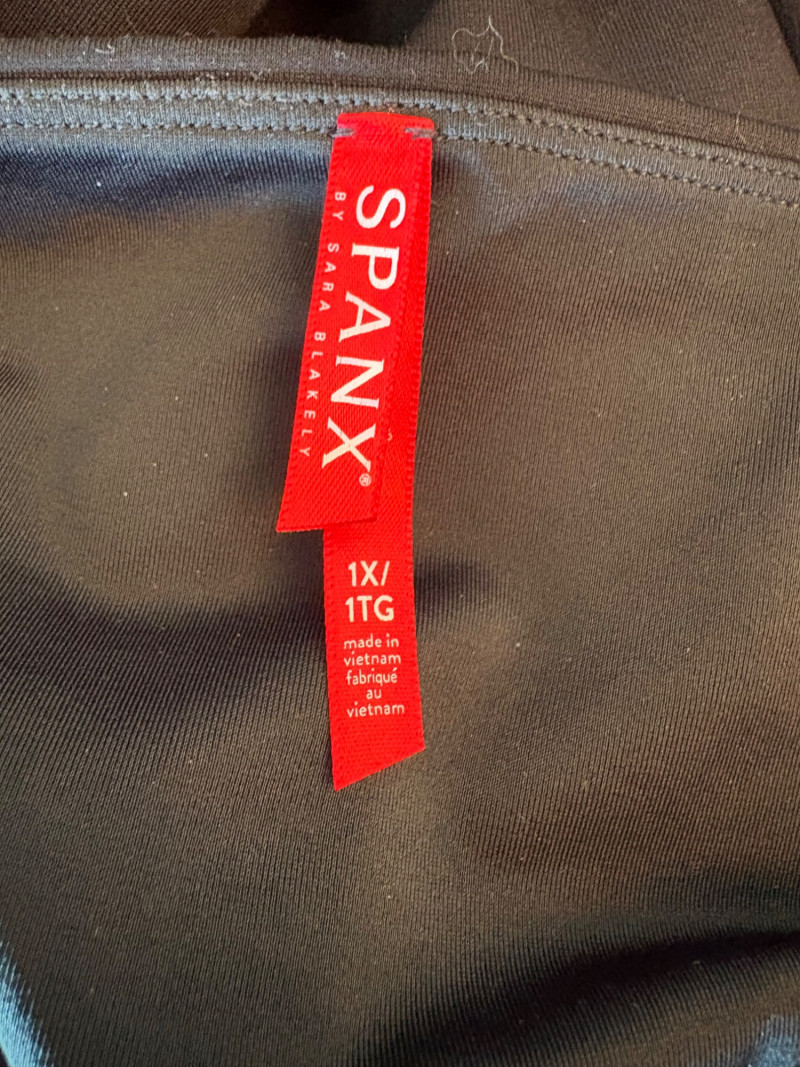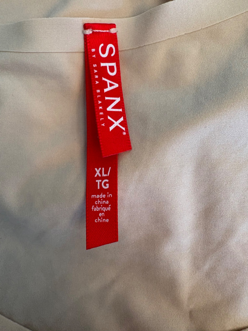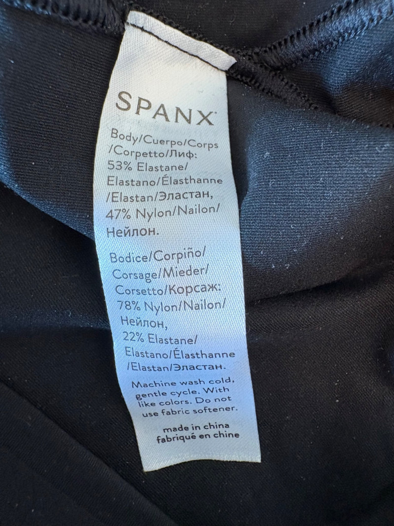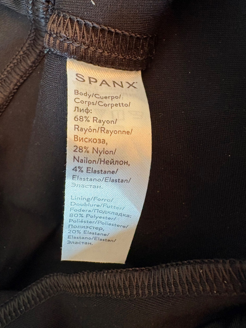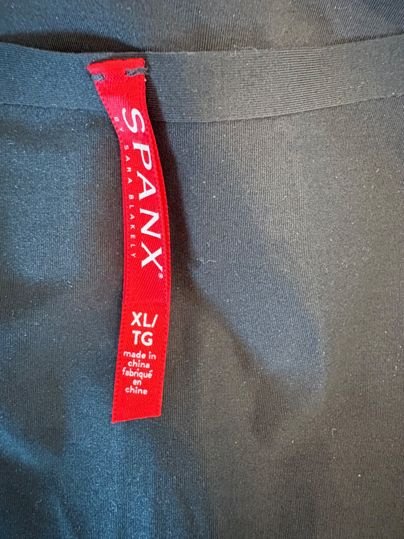 3 pieces of shapewear from Spanx! All appear to be virtually unused (black items) or new (beige shaper). Black pants/lower body shaper look like yoga pants, but are definitely super compressing - they feel strong like iron but slick so your garments move across the fabric easily. Gusset crotch and split hem. Rayon/nylon/elastane blend. Measures 17" side to side at waist (remember all measurements in our auctions are unstretched). Size tag says 1X. Black torso shaper has low curved neckline, shaped bust weave, and split hem. Elastane/nylon blend. Measures 18.5" pit to pit. Size tag says XL. Beige torso shaper is the same design and size as the black one above, but is new with tag.