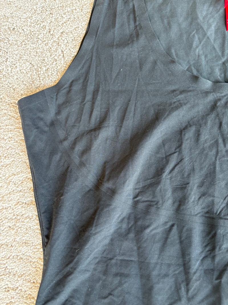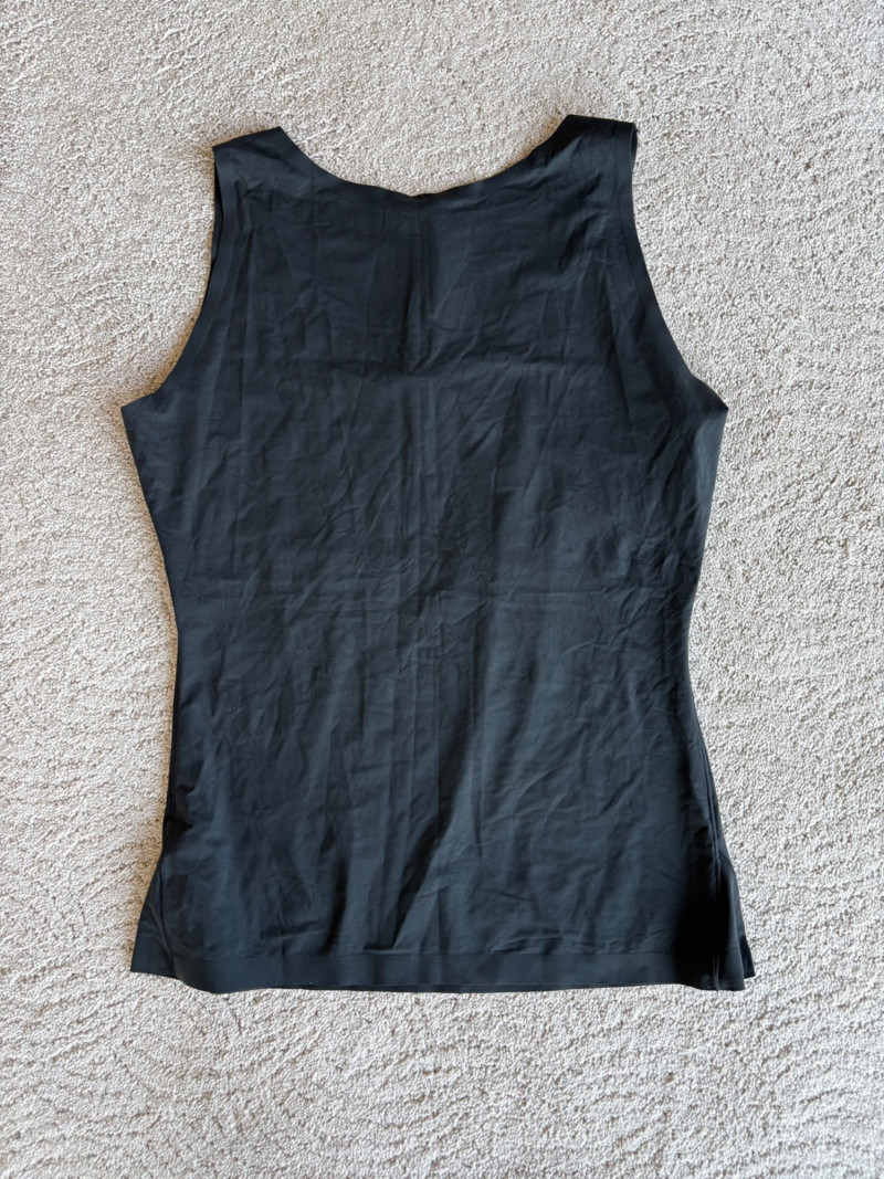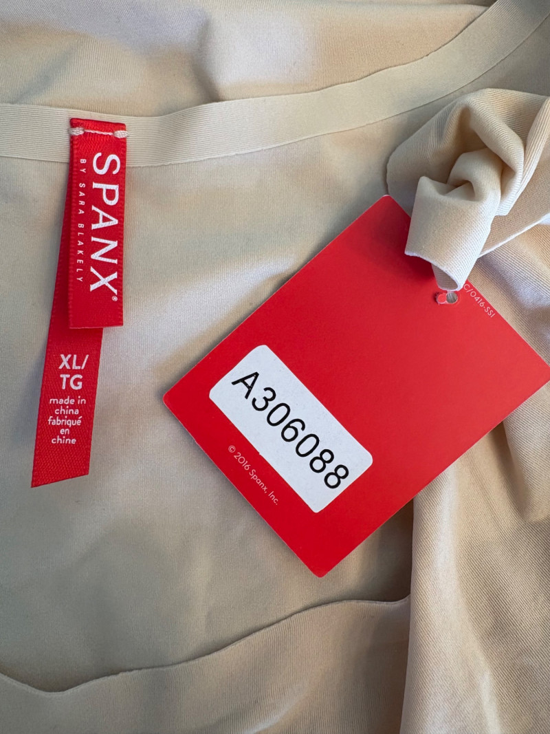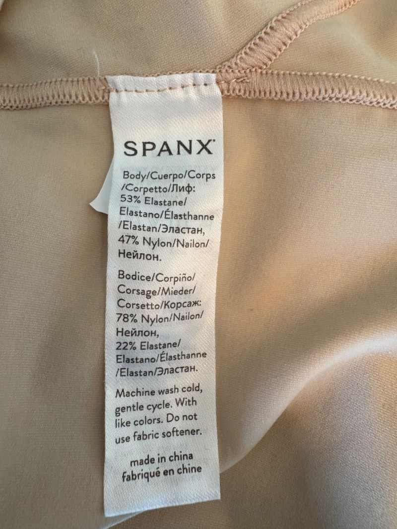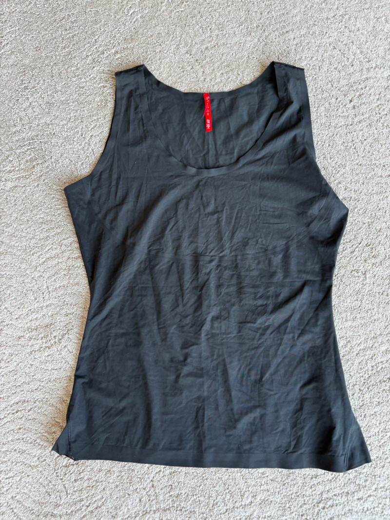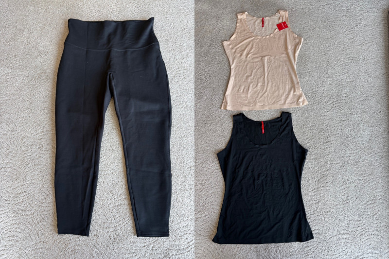 3 pieces of shapewear from Spanx! All appear to be virtually unused (black items) or new (beige shaper). Black pants/lower body shaper look like yoga pants, but are definitely super compressing - they feel strong like iron but slick so your garments move across the fabric easily. Gusset crotch and split hem. Rayon/nylon/elastane blend. Measures 17" side to side at waist (remember all measurements in our auctions are unstretched). Size tag says 1X. Black torso shaper has low curved neckline, shaped bust weave, and split hem. Elastane/nylon blend. Measures 18.5" pit to pit. Size tag says XL. Beige torso shaper is the same design and size as the black one above, but is new with tag.
