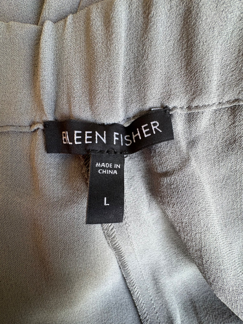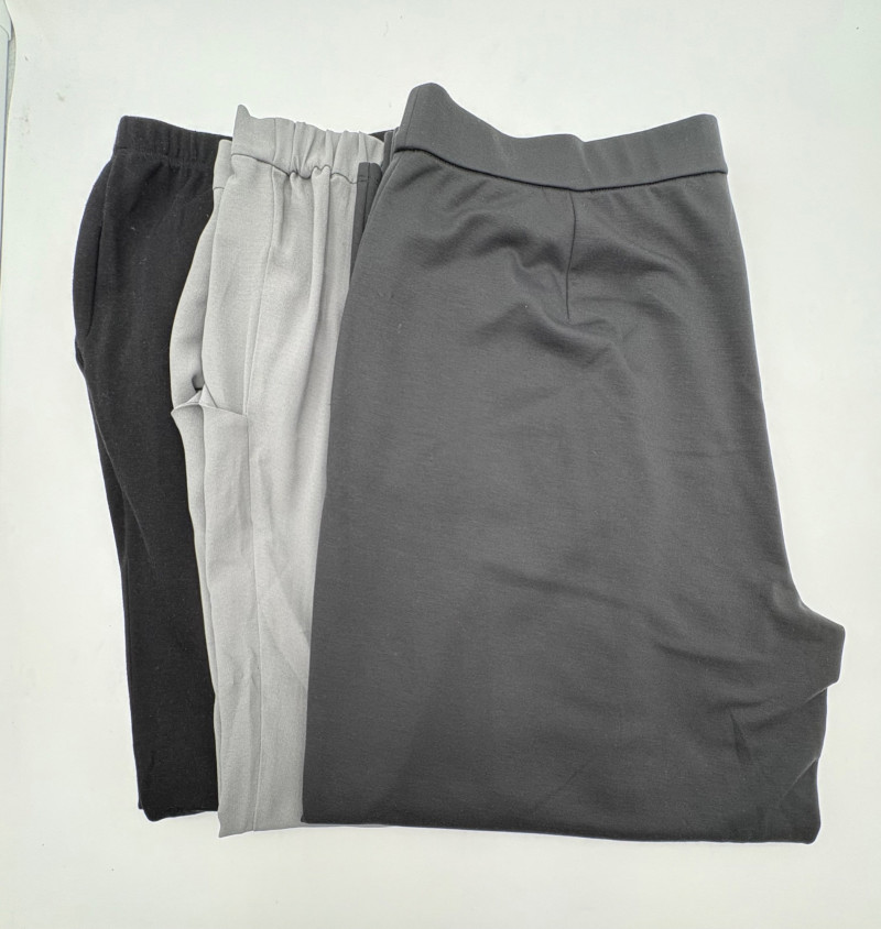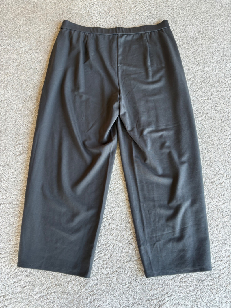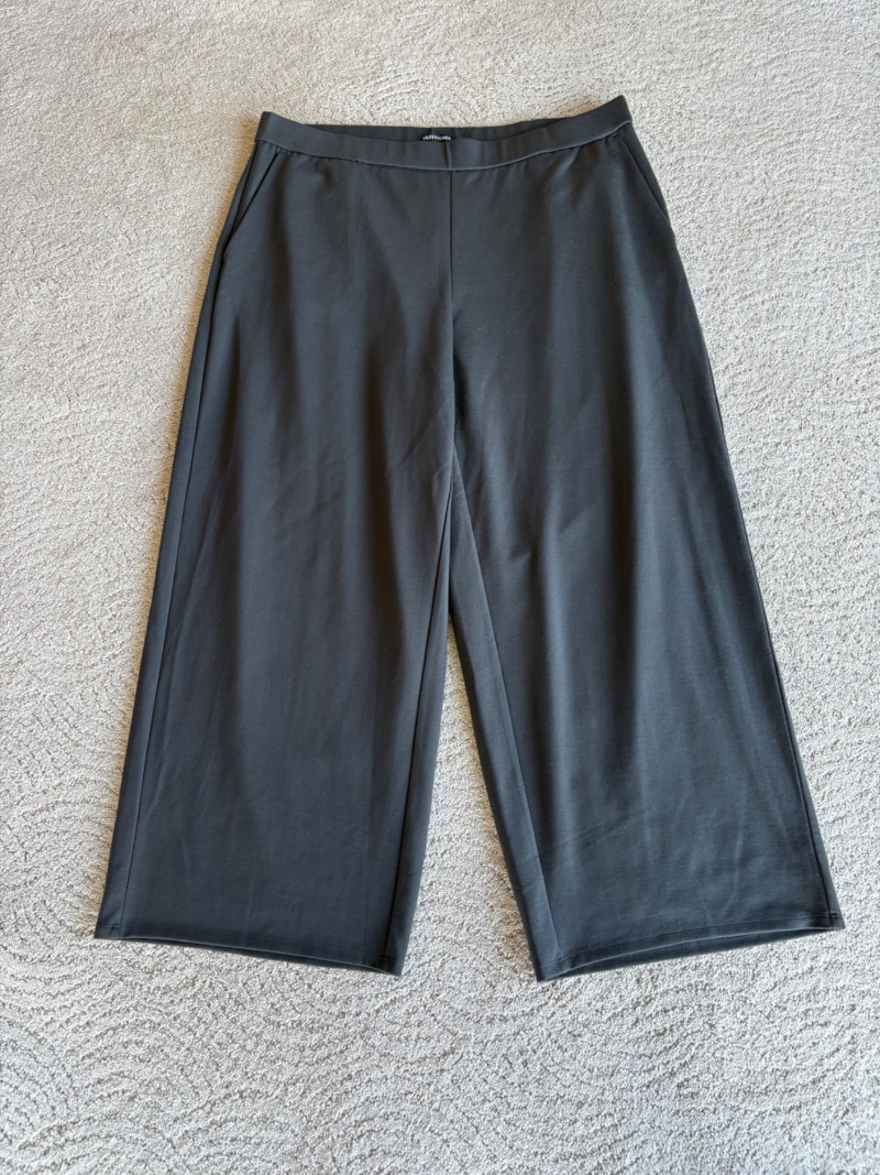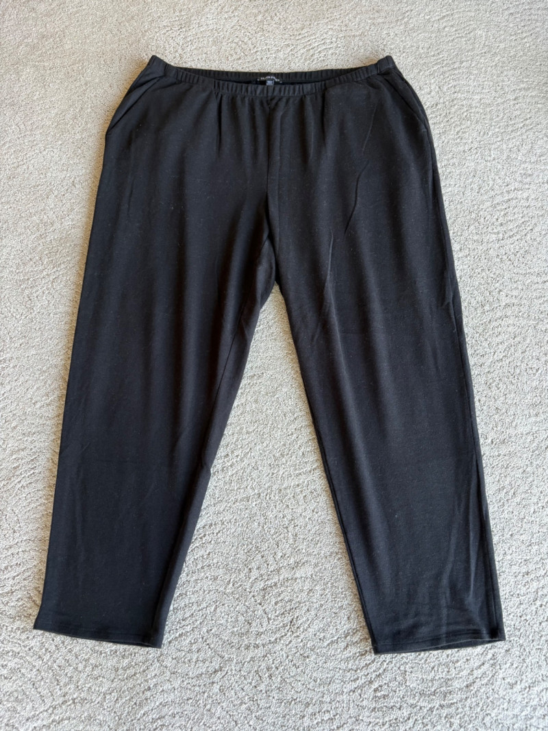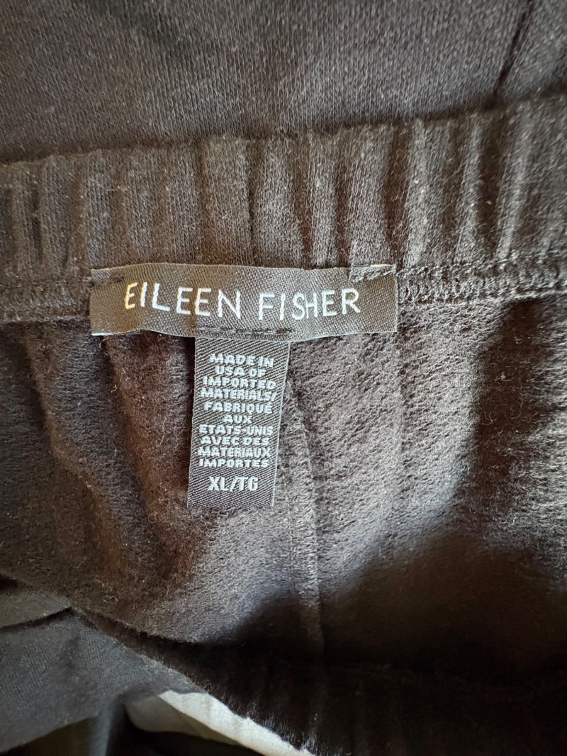 3 neutral colored pants in tones of gray/black from Eileen Fisher. All measure 19" side to side at waist. Gray pleated silk pants have flat front waistband, elasticated back waistband, double front pleats, set-in pockets, and a flowing leg that is darted in at the cuff for a lantern shape. 100% silk. Size tag says L. Black super soft pants (feel similar to old school fleece sweats with soft inside!) have narrow elasticated waist and set-in front pockets. Tencel Lyocell/organic cotton blend. Size tag says XL. Gunmetal grey knit pants have flat elasticated waistband, set-in side pockets, and fairly wide legs. They feel and hang like a very good quality ponte. Tencel Lyocell/nylon/spandex blend. Size tag says XL.