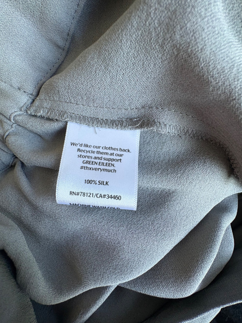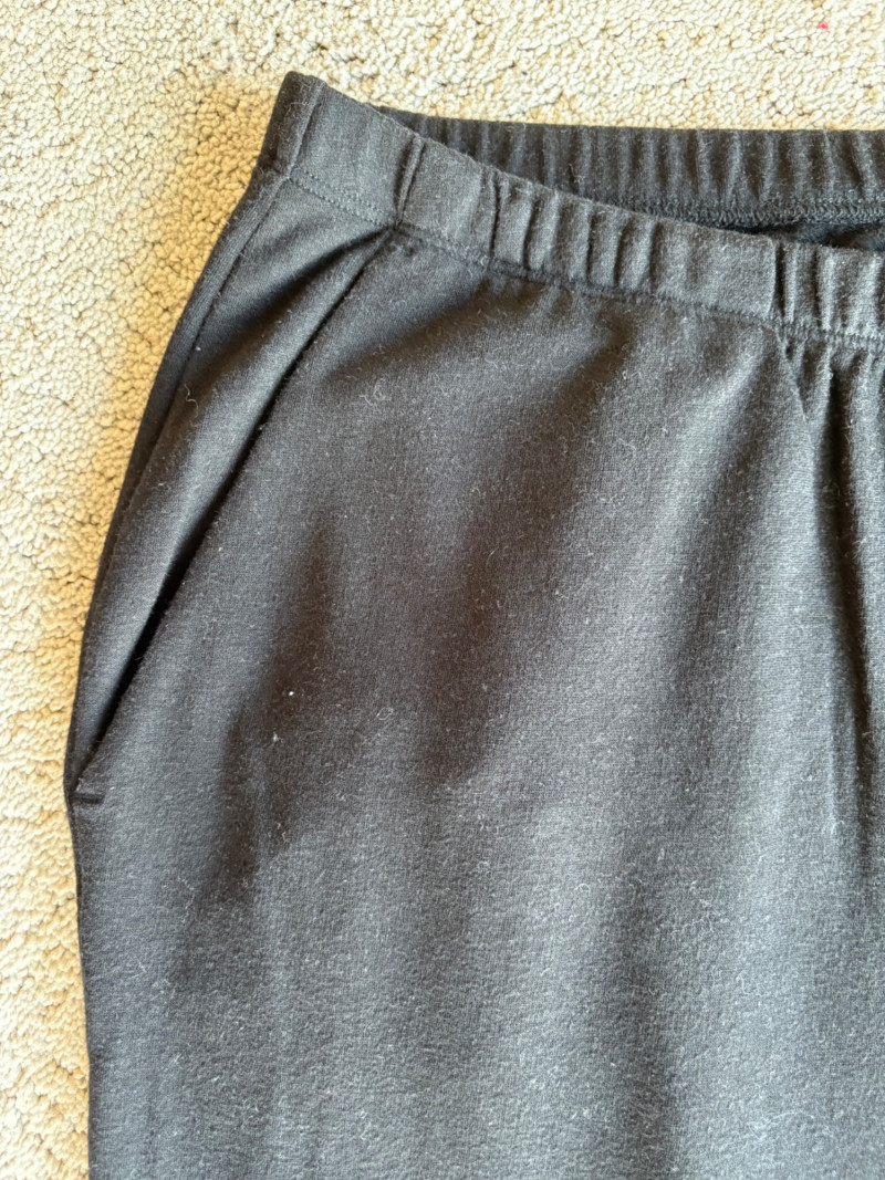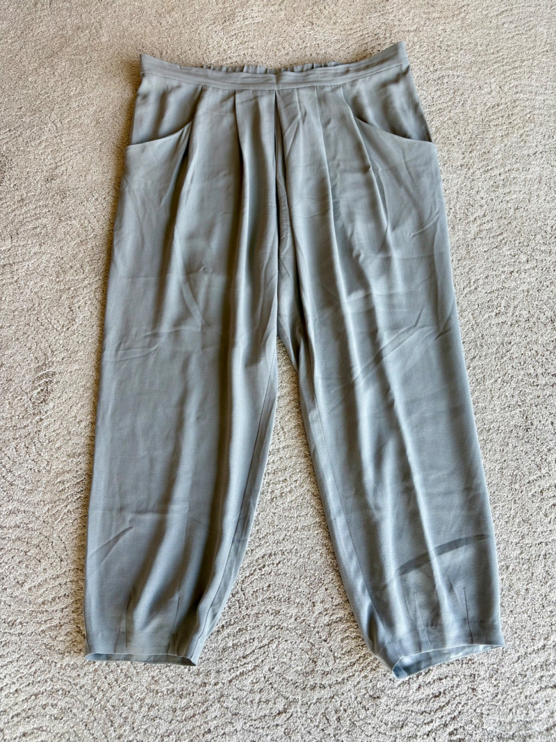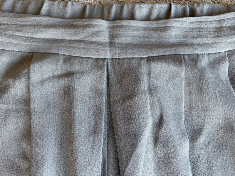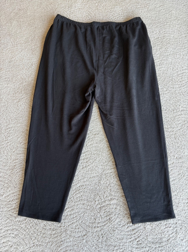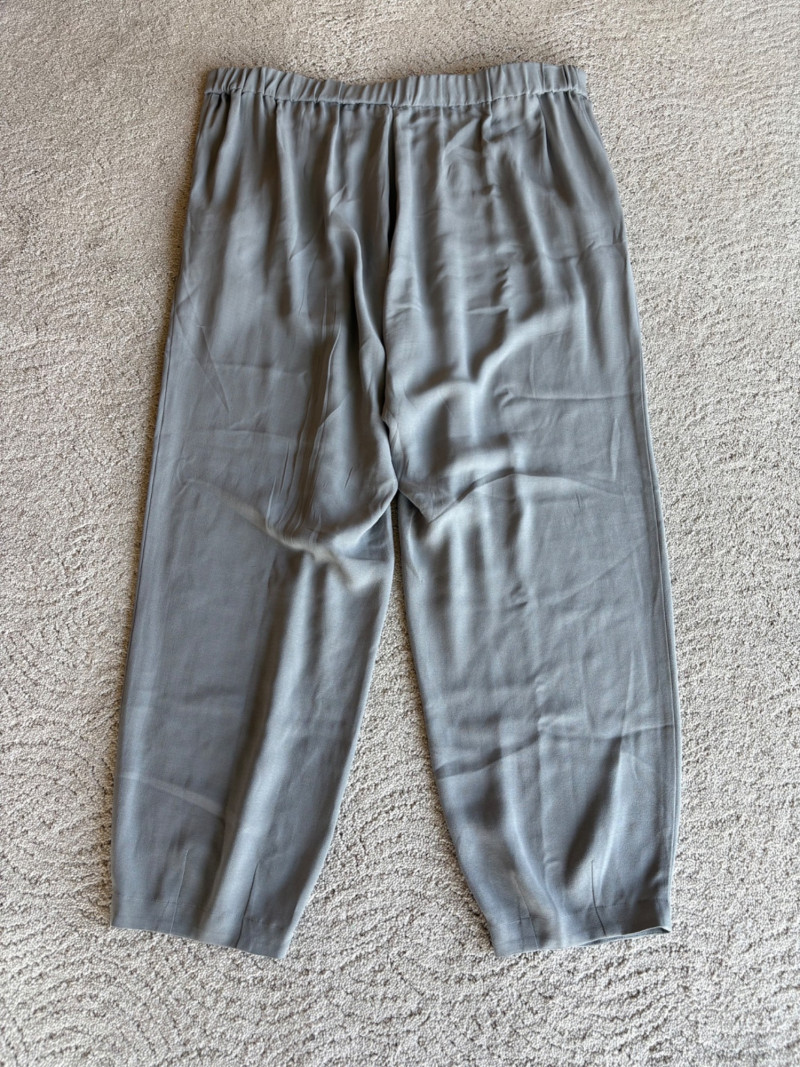 3 neutral colored pants in tones of gray/black from Eileen Fisher. All measure 19" side to side at waist. Gray pleated silk pants have flat front waistband, elasticated back waistband, double front pleats, set-in pockets, and a flowing leg that is darted in at the cuff for a lantern shape. 100% silk. Size tag says L. Black super soft pants (feel similar to old school fleece sweats with soft inside!) have narrow elasticated waist and set-in front pockets. Tencel Lyocell/organic cotton blend. Size tag says XL. Gunmetal grey knit pants have flat elasticated waistband, set-in side pockets, and fairly wide legs. They feel and hang like a very good quality ponte. Tencel Lyocell/nylon/spandex blend. Size tag says XL.