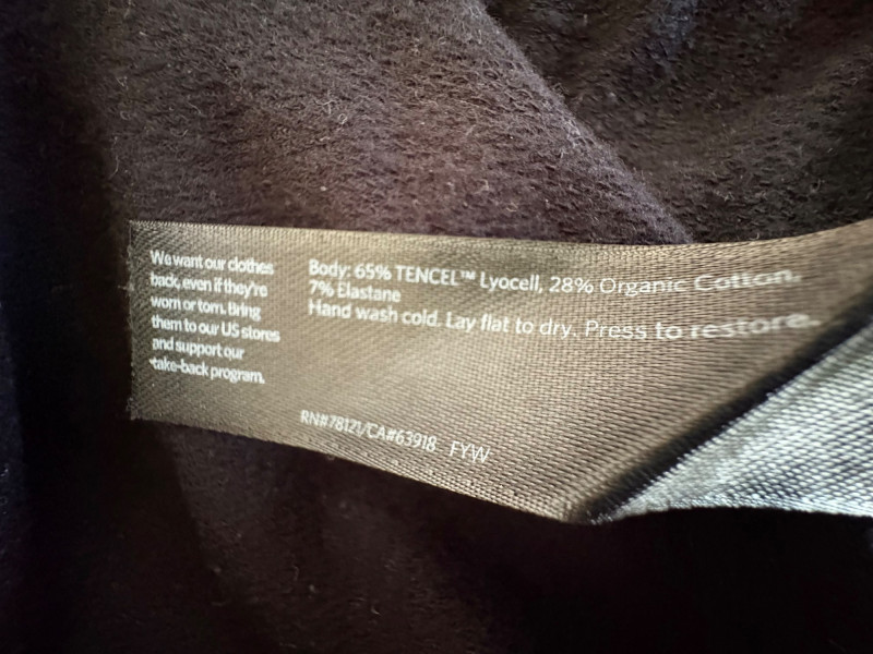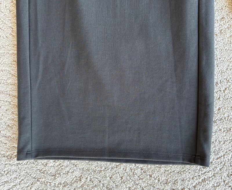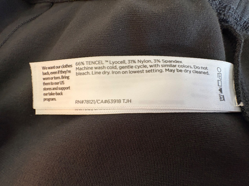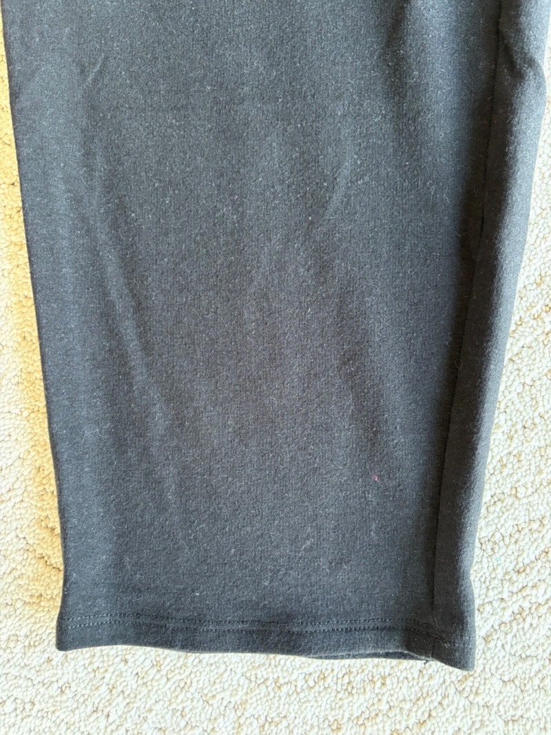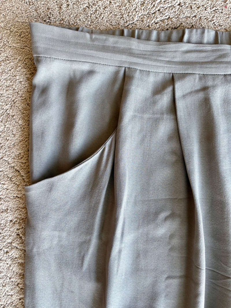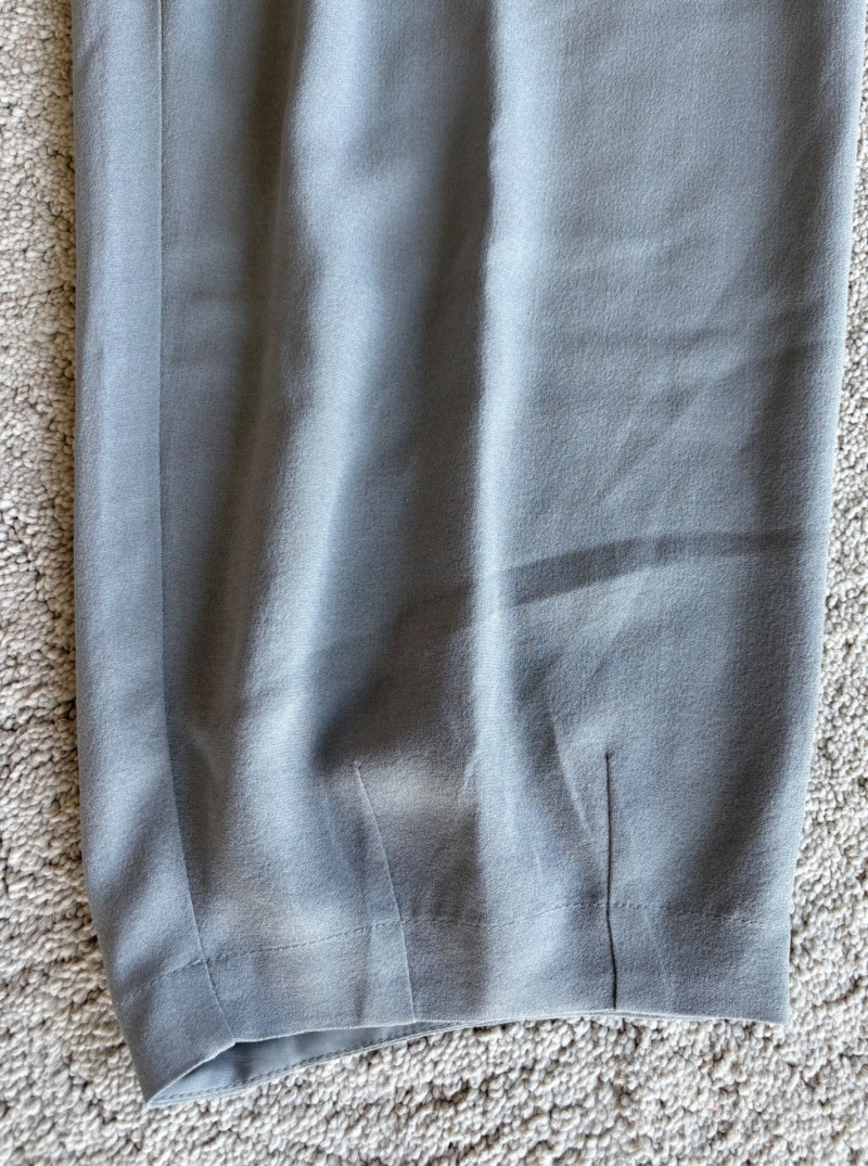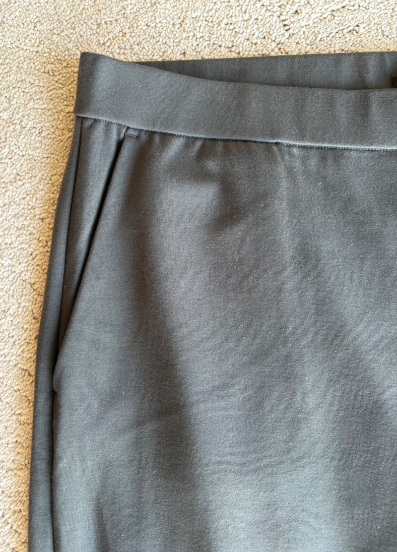 3 neutral colored pants in tones of gray/black from Eileen Fisher. All measure 19" side to side at waist. Gray pleated silk pants have flat front waistband, elasticated back waistband, double front pleats, set-in pockets, and a flowing leg that is darted in at the cuff for a lantern shape. 100% silk. Size tag says L. Black super soft pants (feel similar to old school fleece sweats with soft inside!) have narrow elasticated waist and set-in front pockets. Tencel Lyocell/organic cotton blend. Size tag says XL. Gunmetal grey knit pants have flat elasticated waistband, set-in side pockets, and fairly wide legs. They feel and hang like a very good quality ponte. Tencel Lyocell/nylon/spandex blend. Size tag says XL.