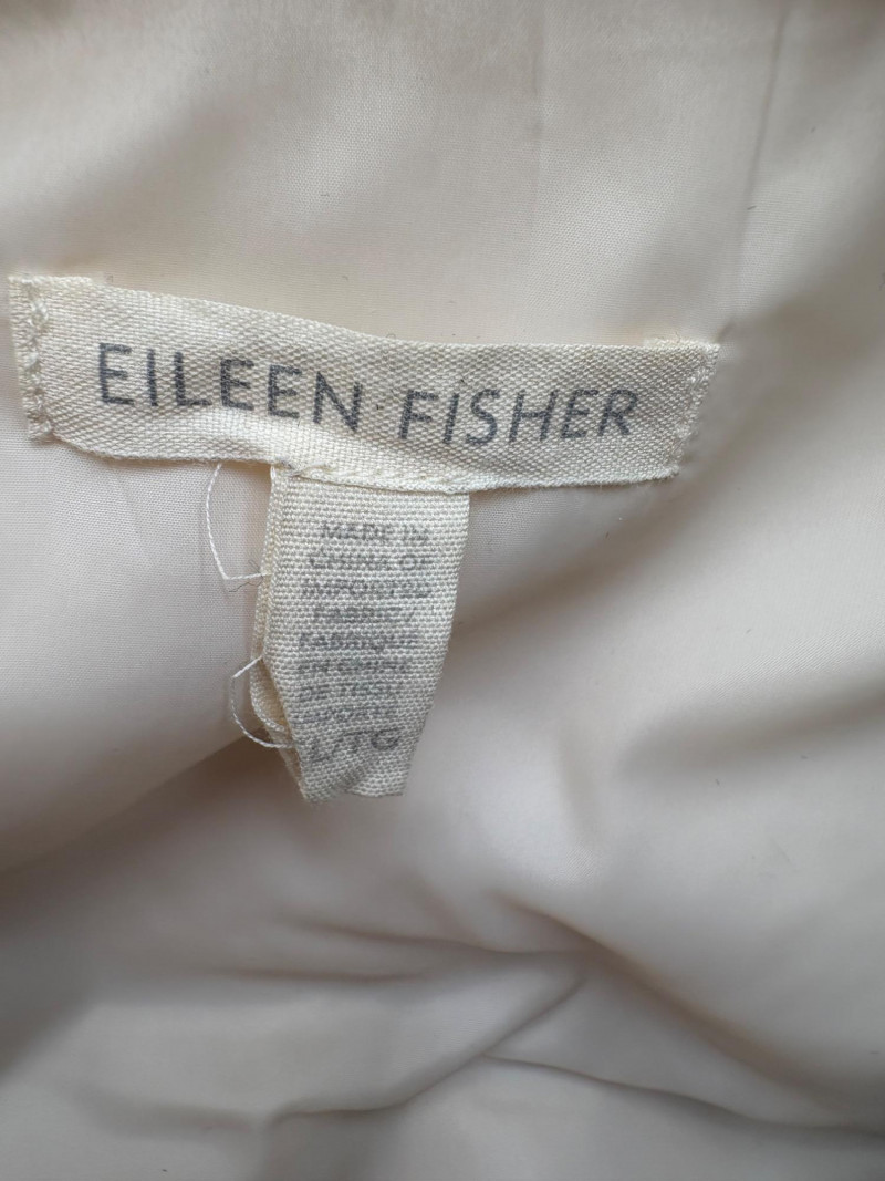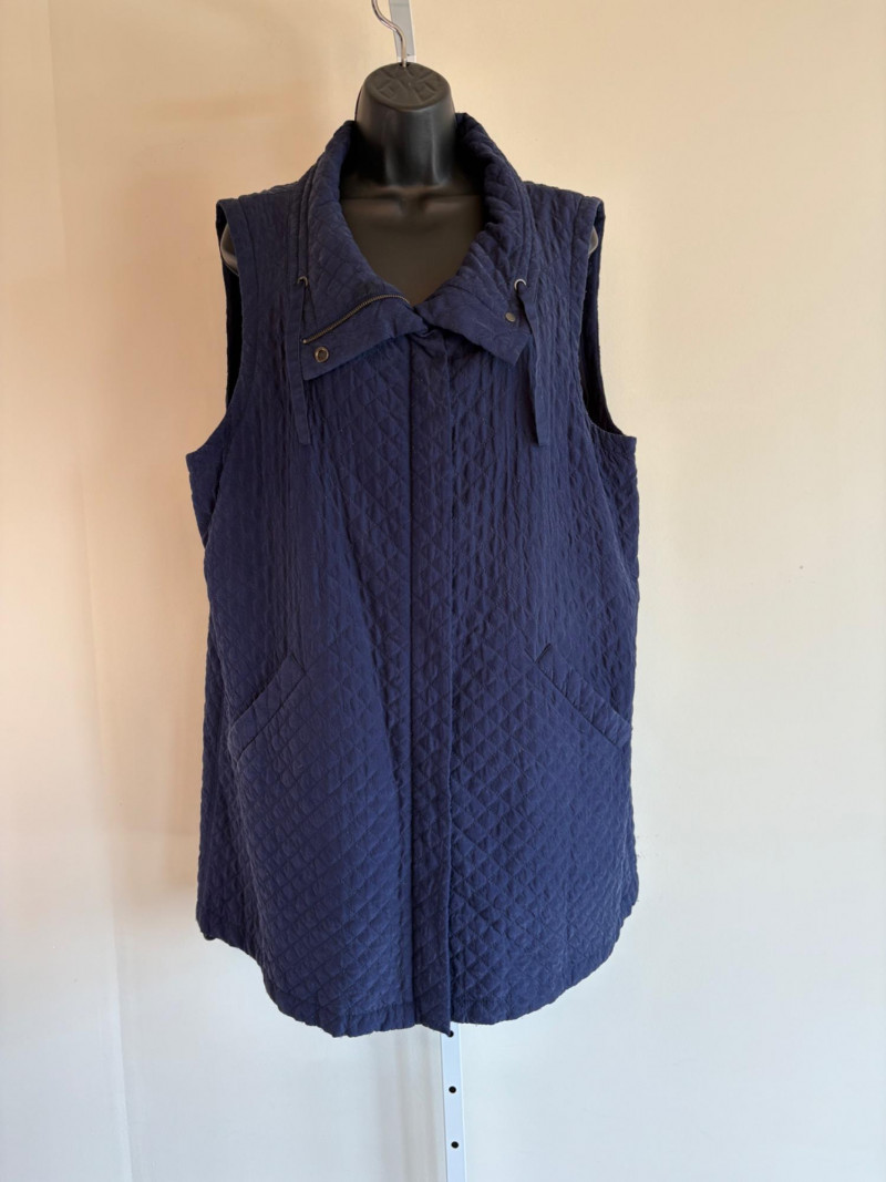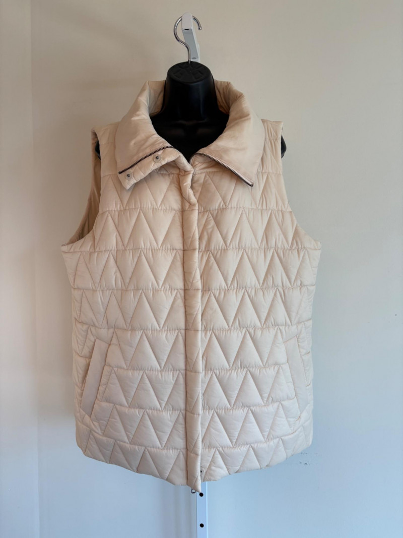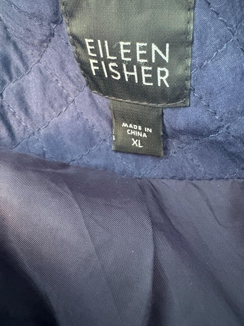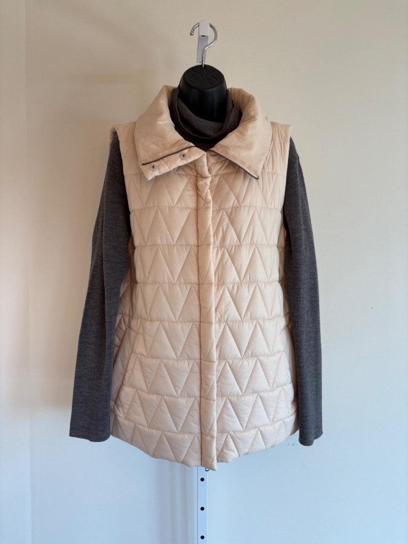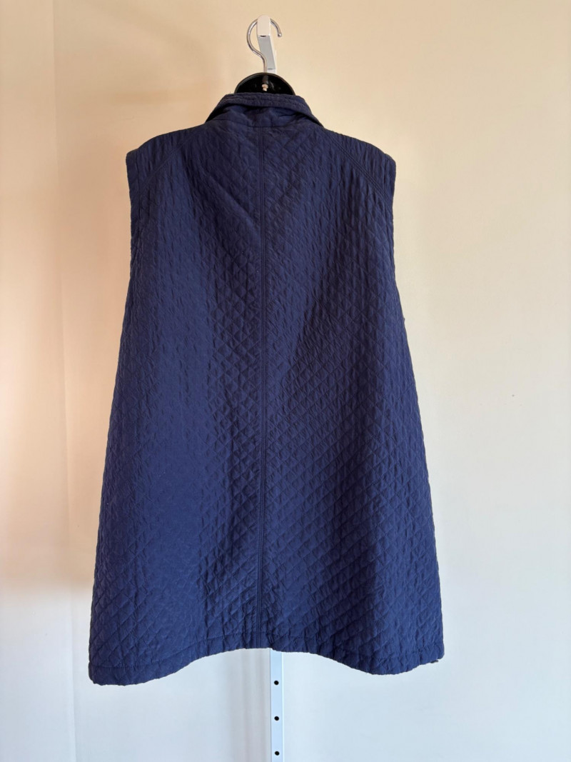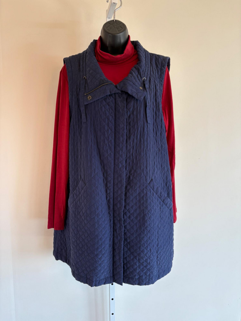 Vests for you every need from Eileen Fisher. Blue longer length vest from Eileen Fisher has funnel neckline with ties, zip front closure with snap hidden placket, and welted slash pockets in relatively thin silk fabric. Measures 24" pit to pit and 32" from back neckline to hem. Size tag says XL. Note this piece has overall wear - we waffled on including it, but believe it would be greatly improved by a date with your sweater shaver. Paired with deep red Tencel blend turtleneck from Eileen Fisher. Measures 23" pit to pit by 25" from back neckline to hem. Size tag says 1X. Off-white Eileen Fisher triangle-quilted vest has 2-way zip front, seven snap packet, welted slash pockets, and smooth interior. Made of recycled and virgin polyester. Measures 23" pit to put and 26.5" from back neckline to hem. Size tag says XL. Paired with grey Eileen Fisher lightweight turtleneck in merino wool. Measures 22" pit to pit and 24" back neckline to hem. Size tag says L.